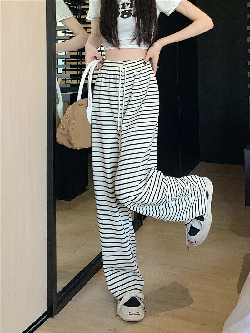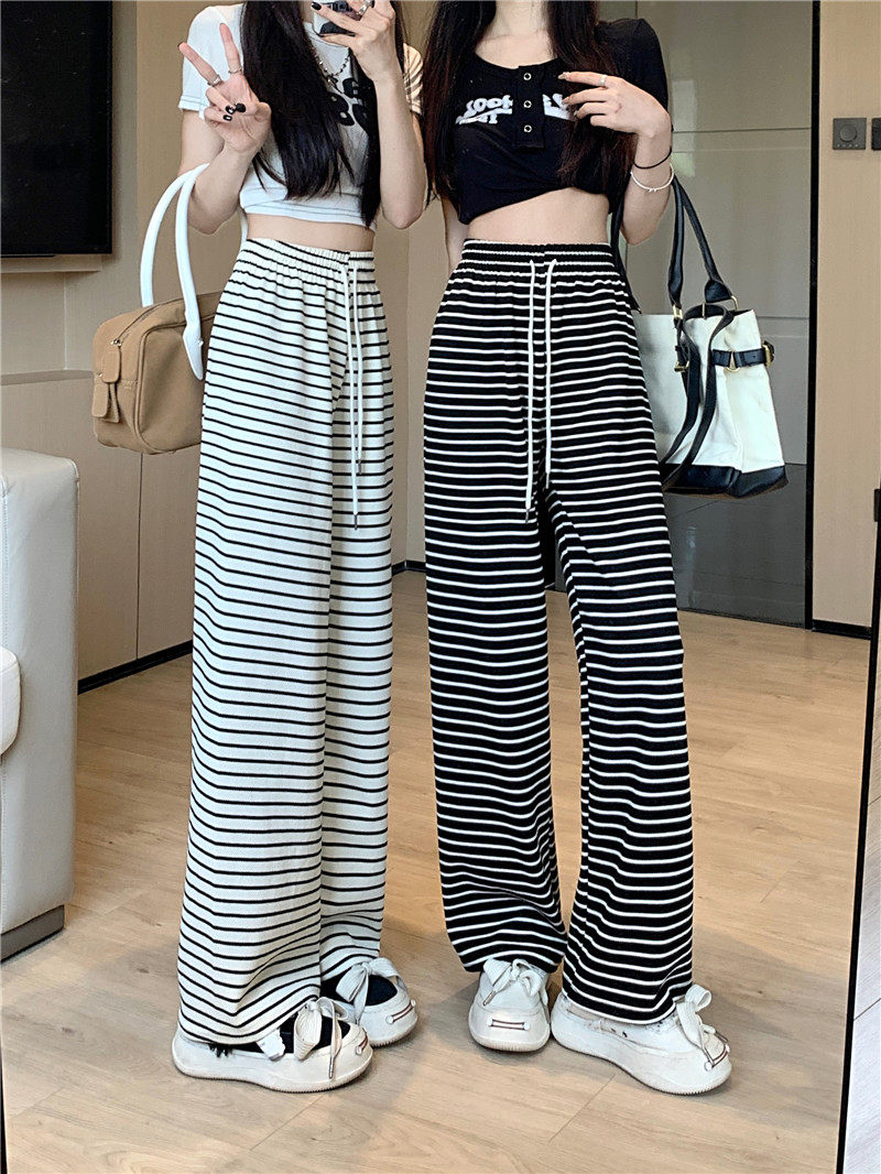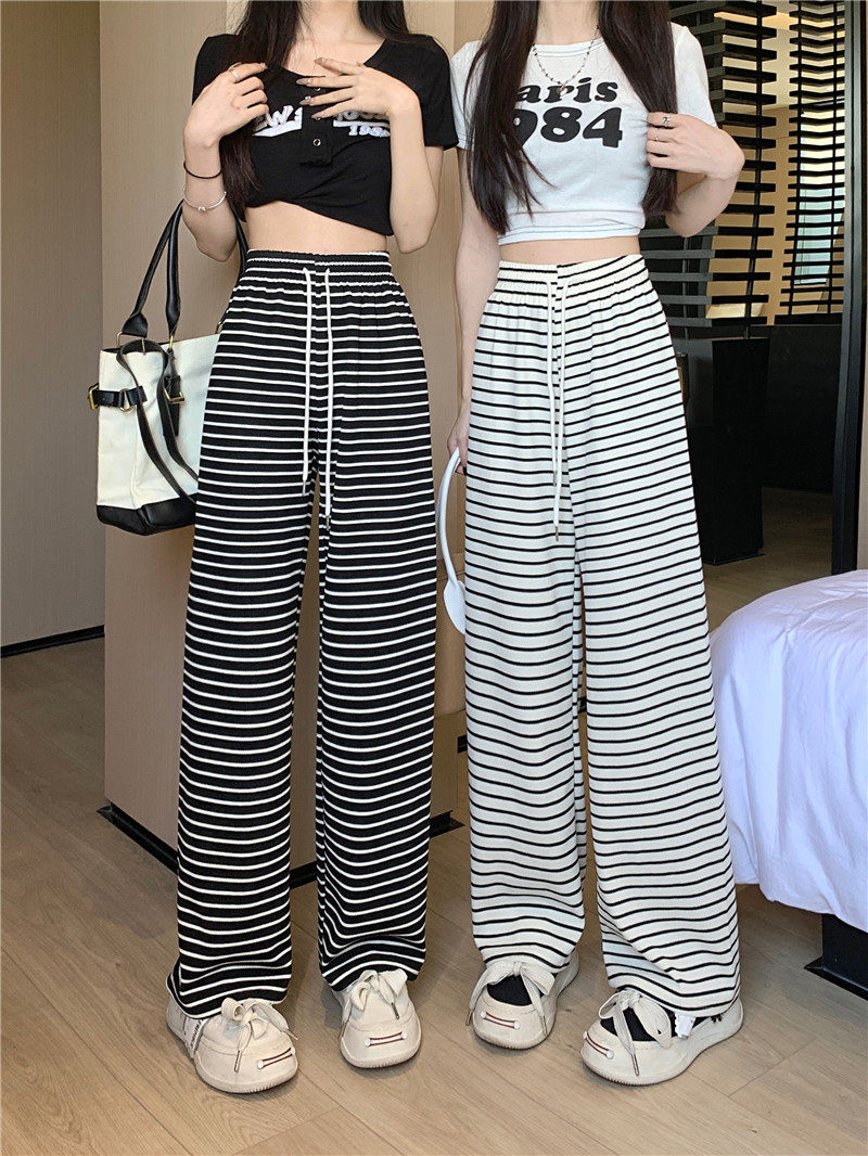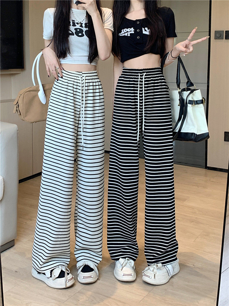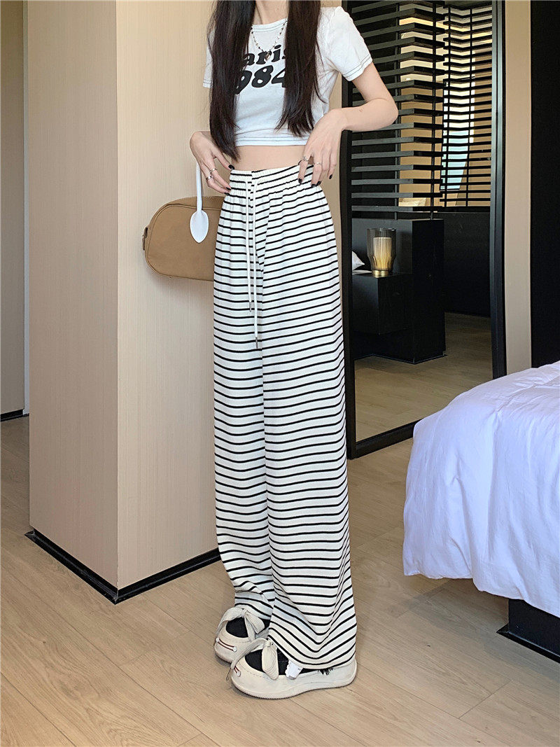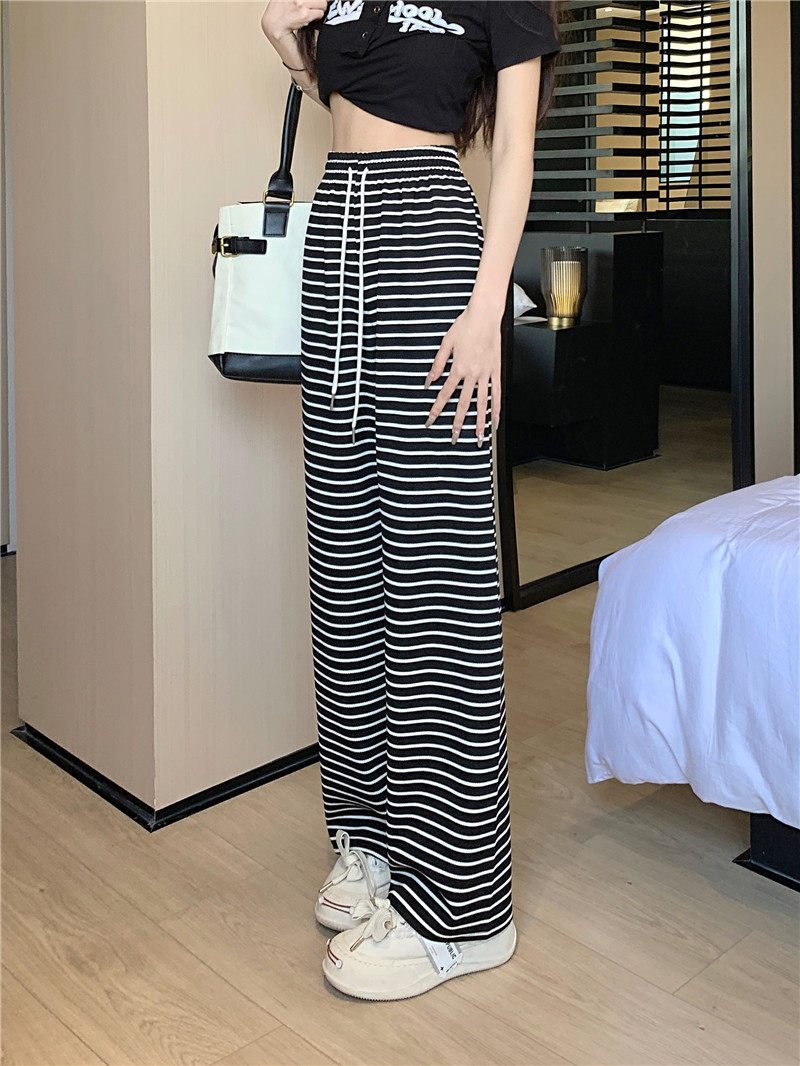 小個子黑白橫條紋窄版濶腿褲女夏季薄款150cm休閒運動直筒九分褲