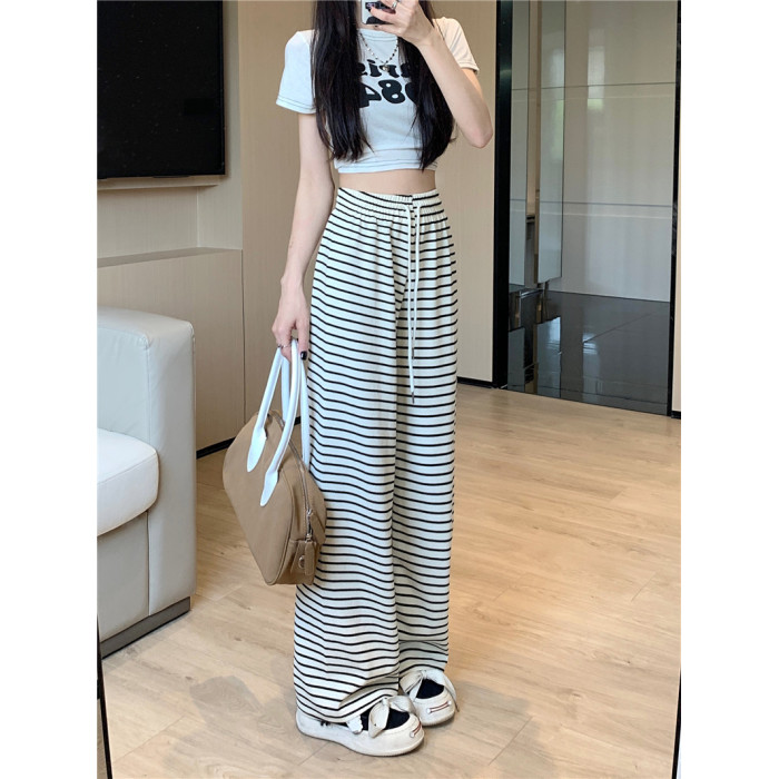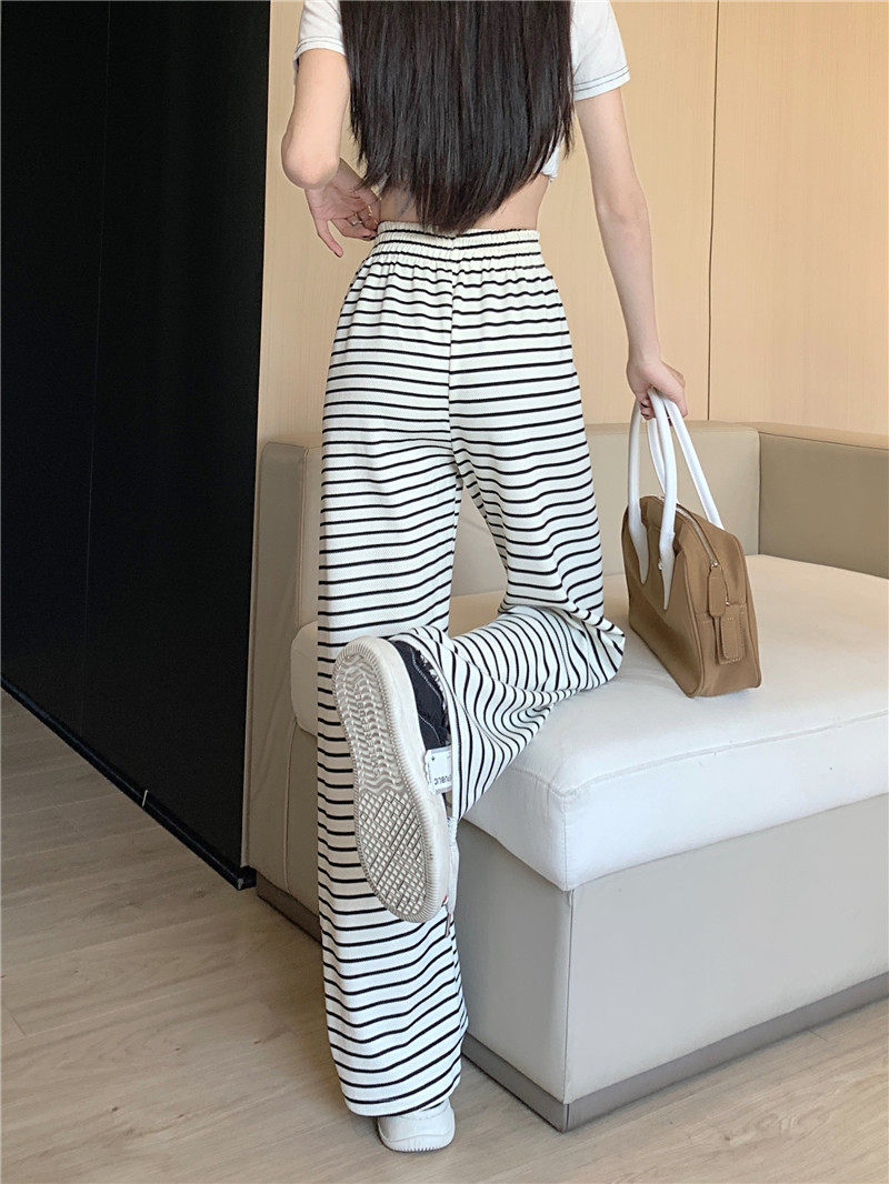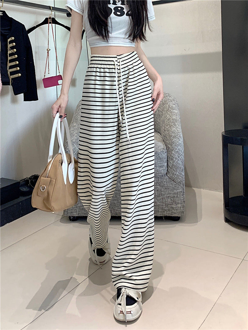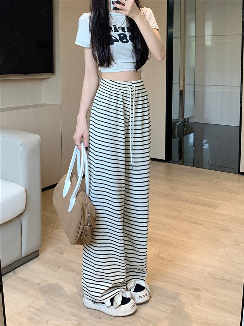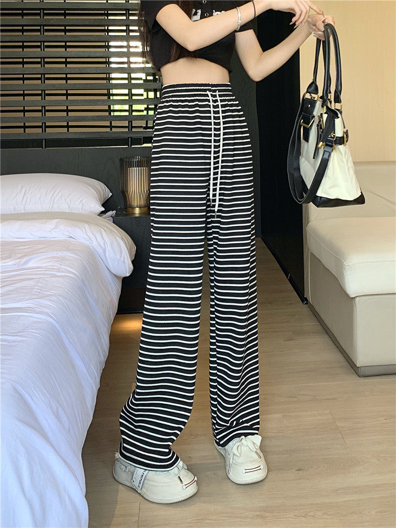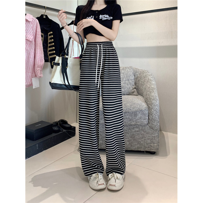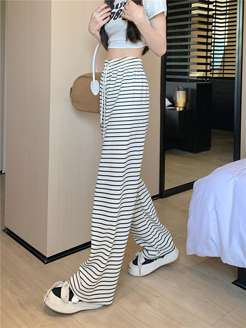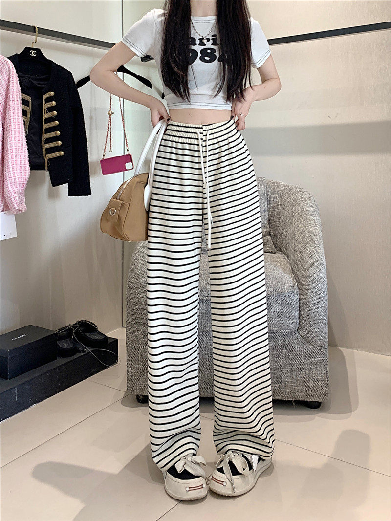 小個子黑白橫條紋窄版濶腿褲女夏季薄款150cm休閒運動直筒九分褲