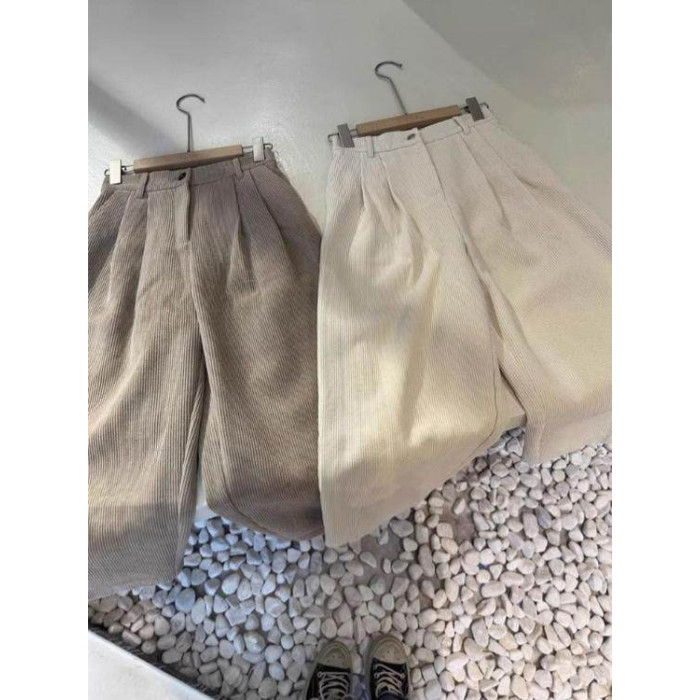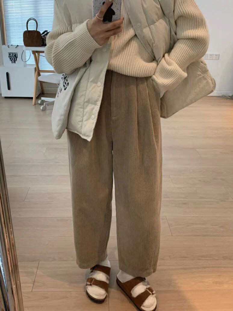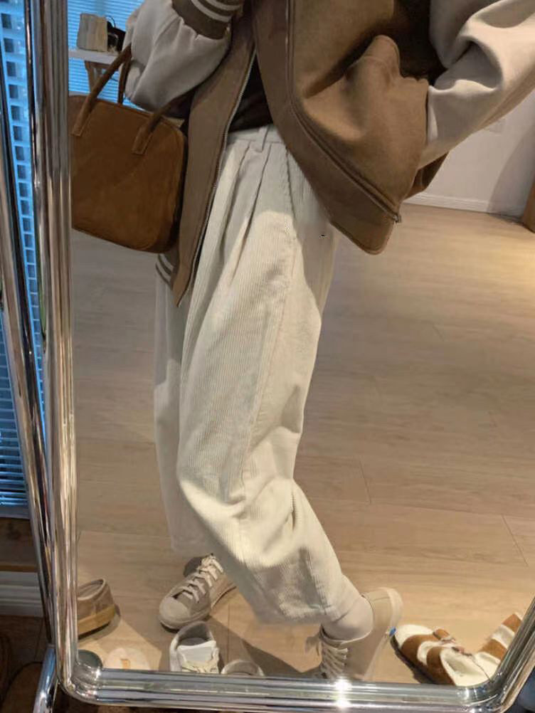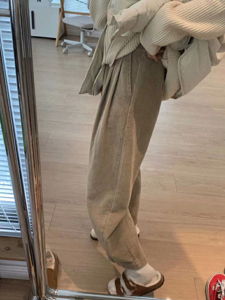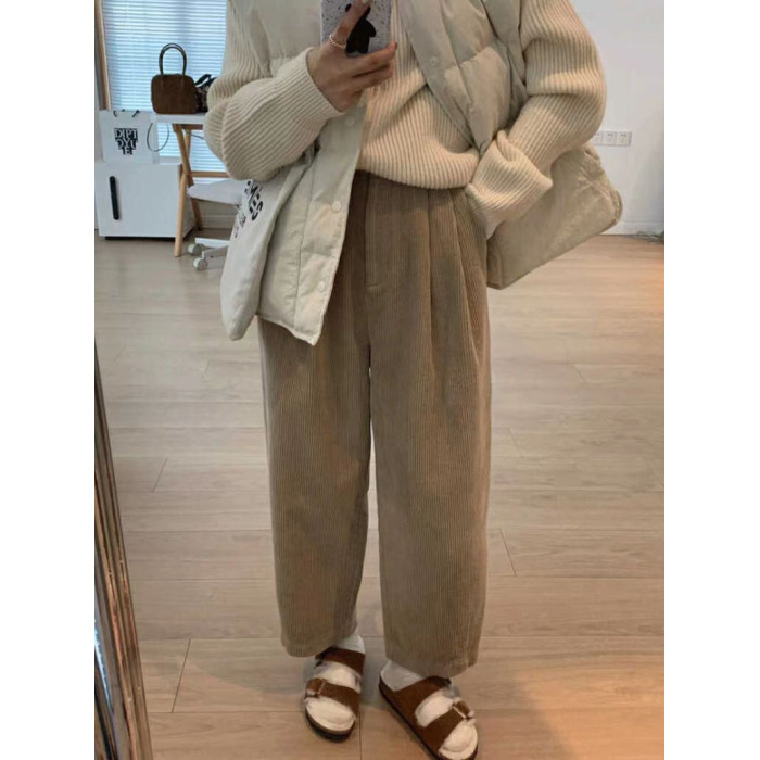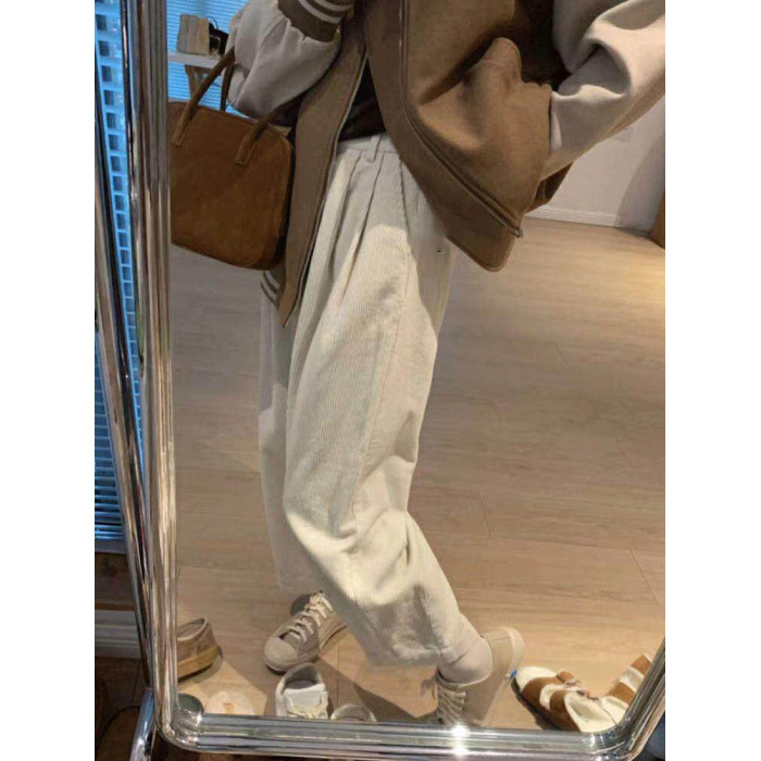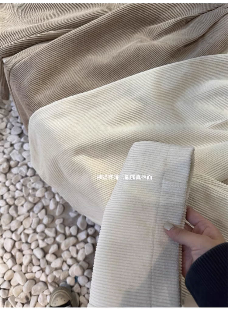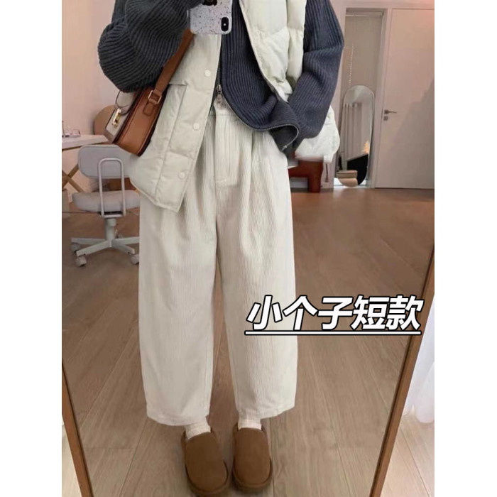八分米色燈芯絨濶腿褲女秋冬加厚小個子寬鬆顯瘦休閒蘿蔔奶奶褲xs