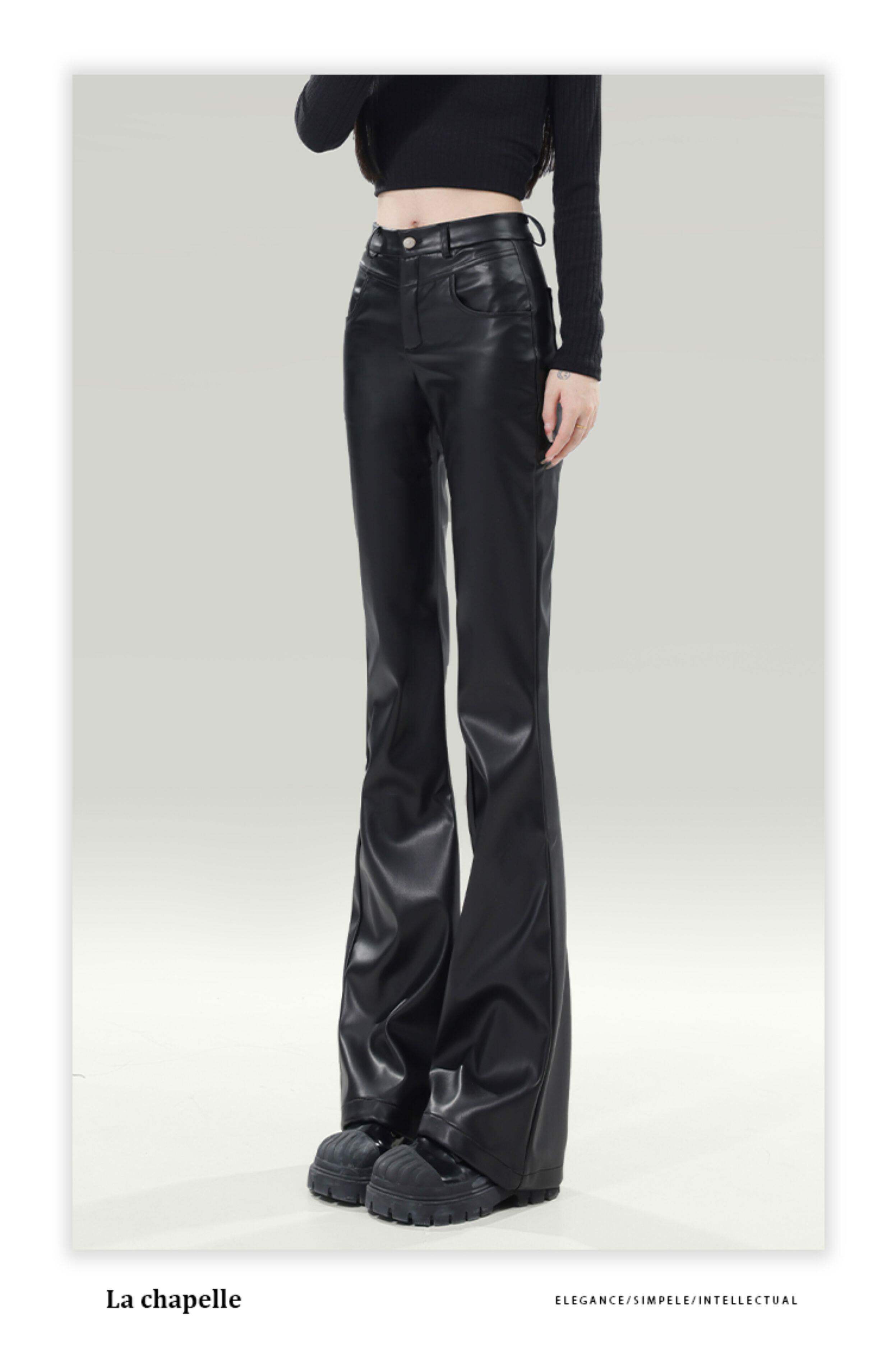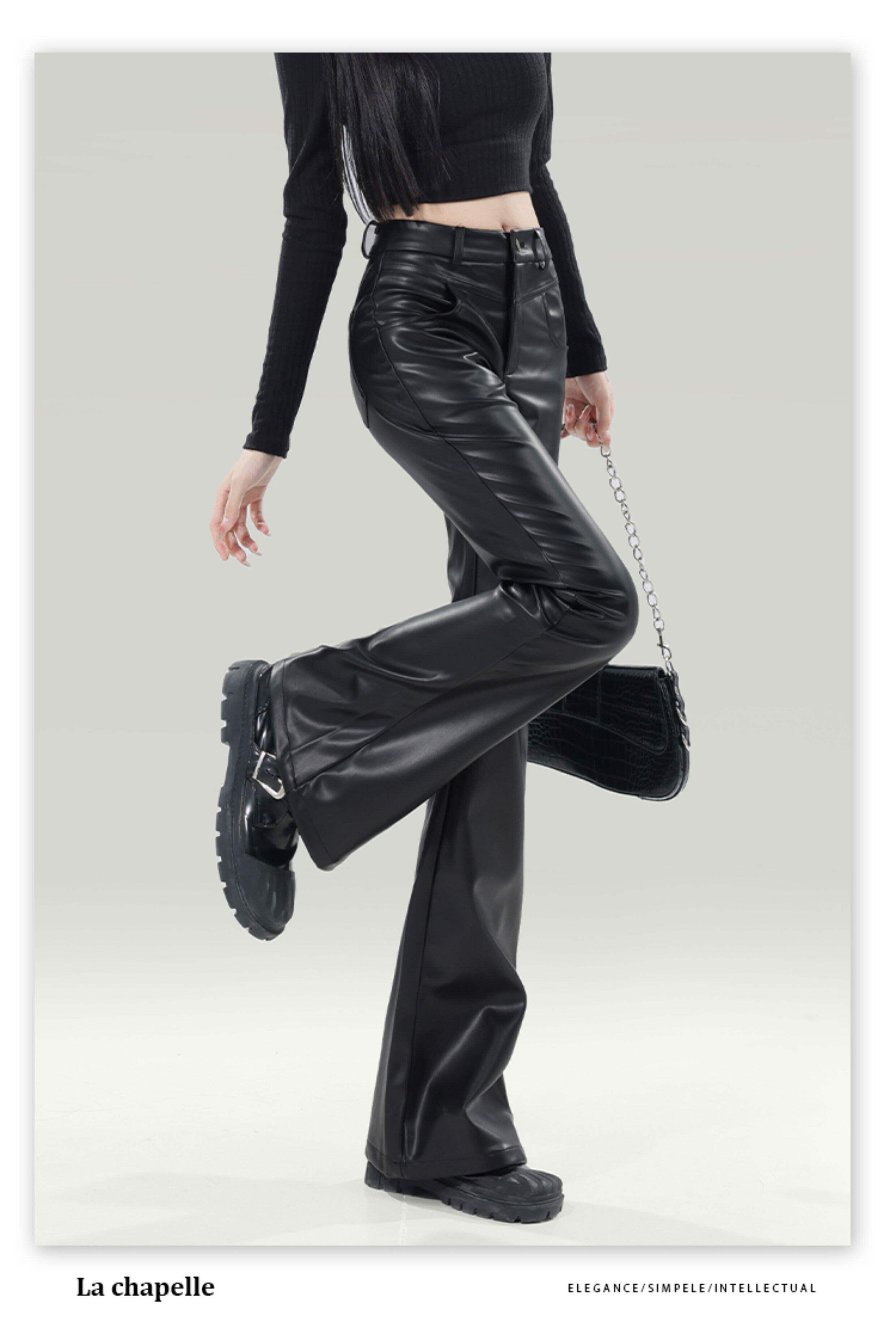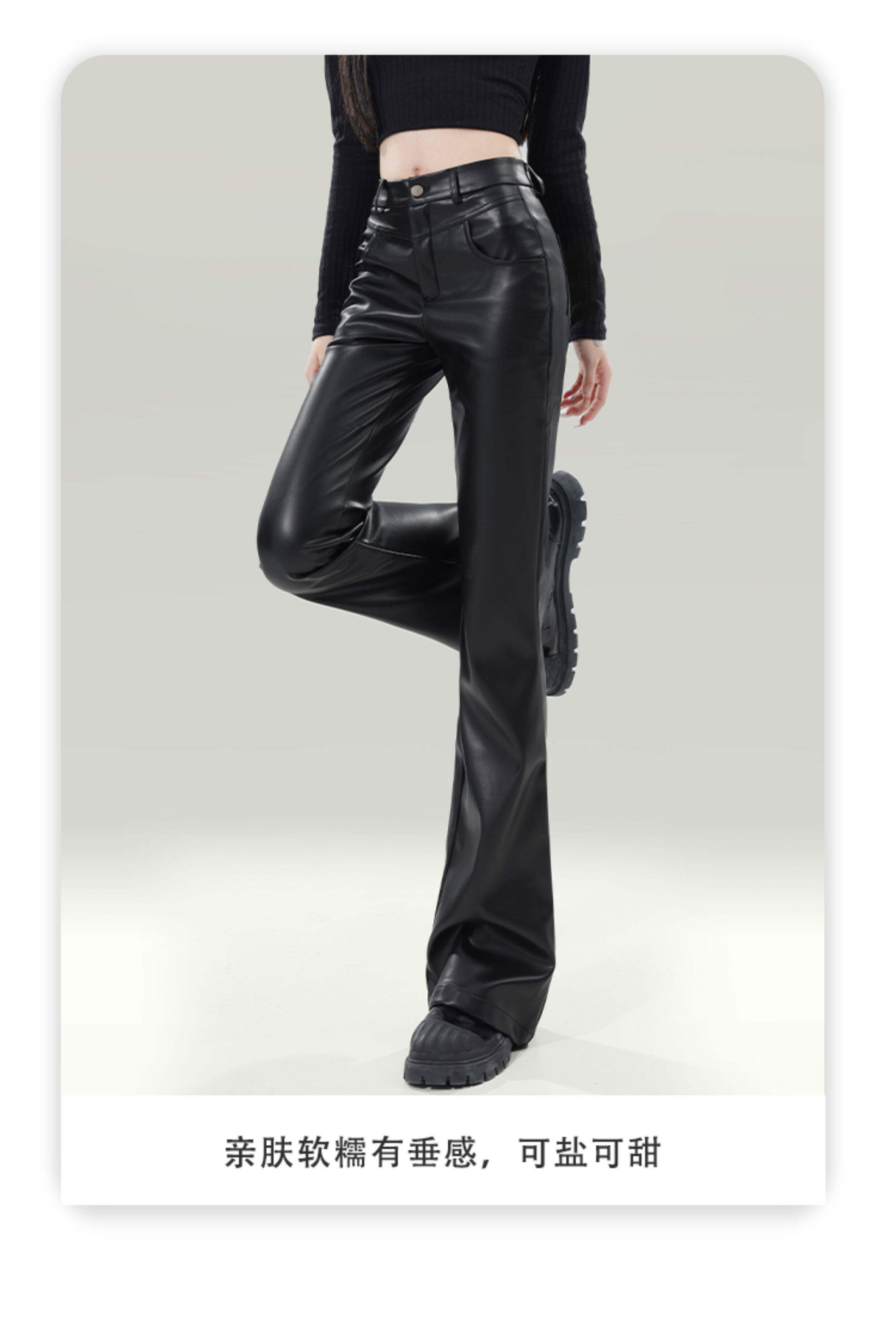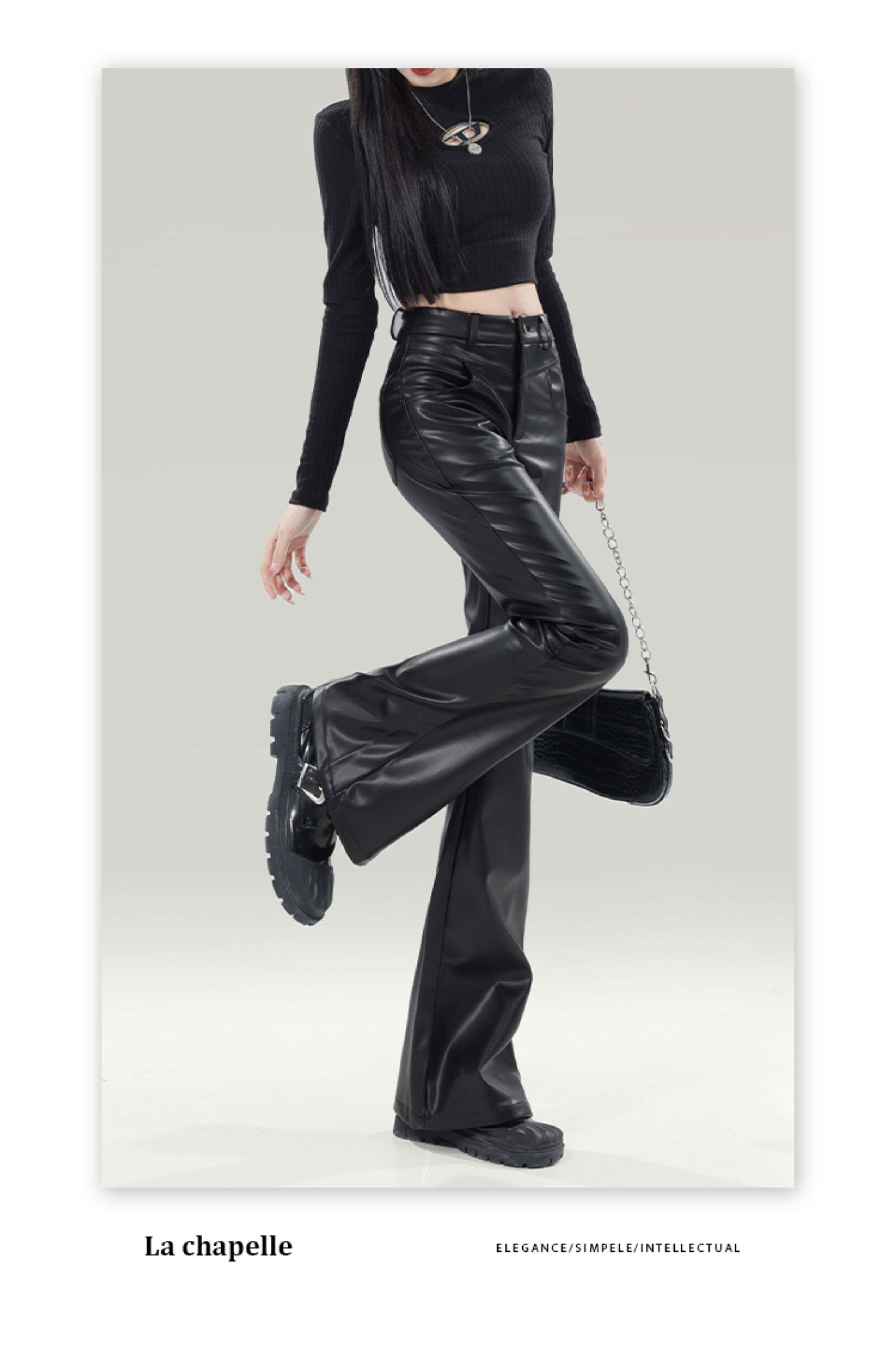 拉夏貝爾黑色皮褲女2026新款春季高腰修身顯瘦休閒小個子微喇叭褲