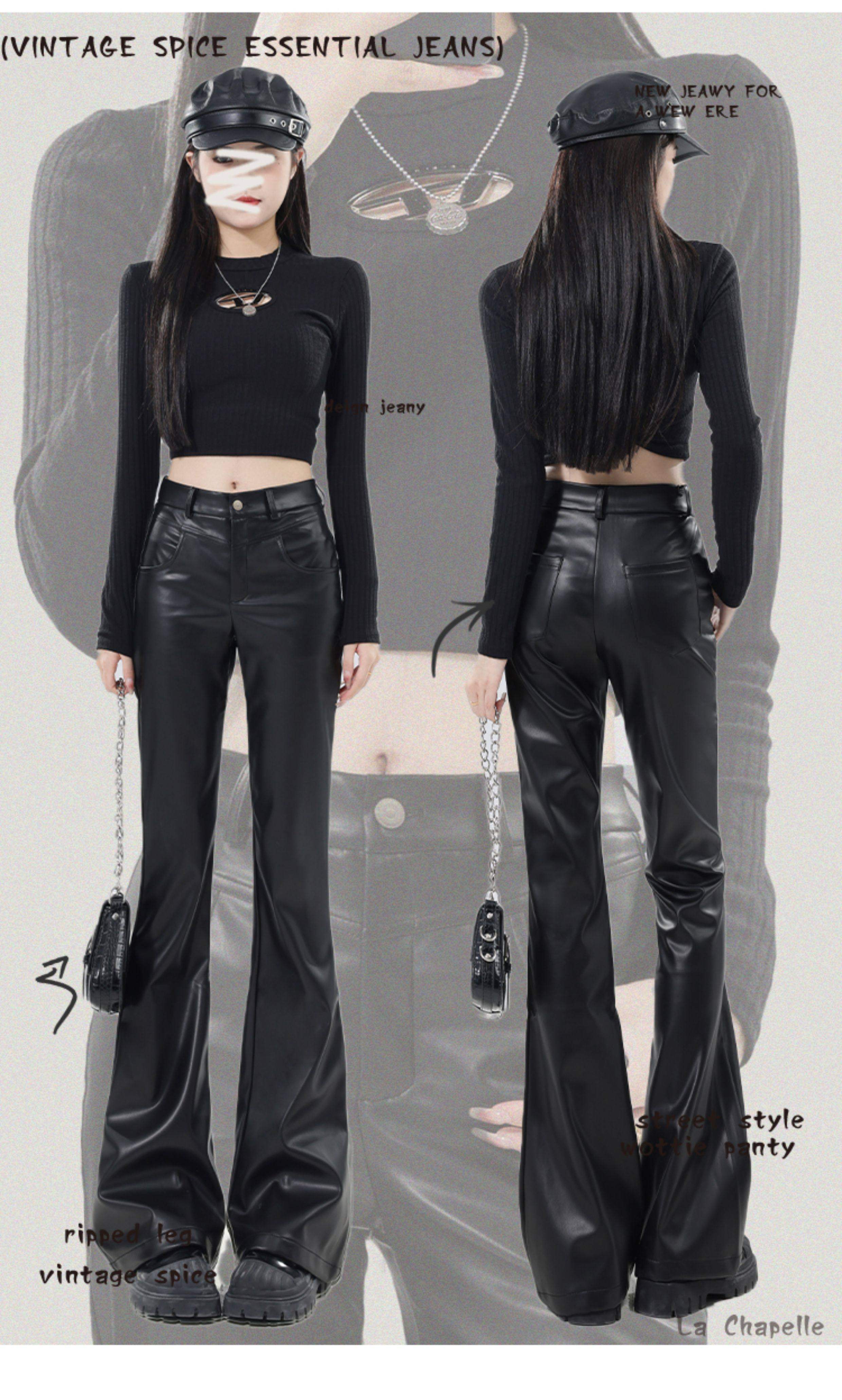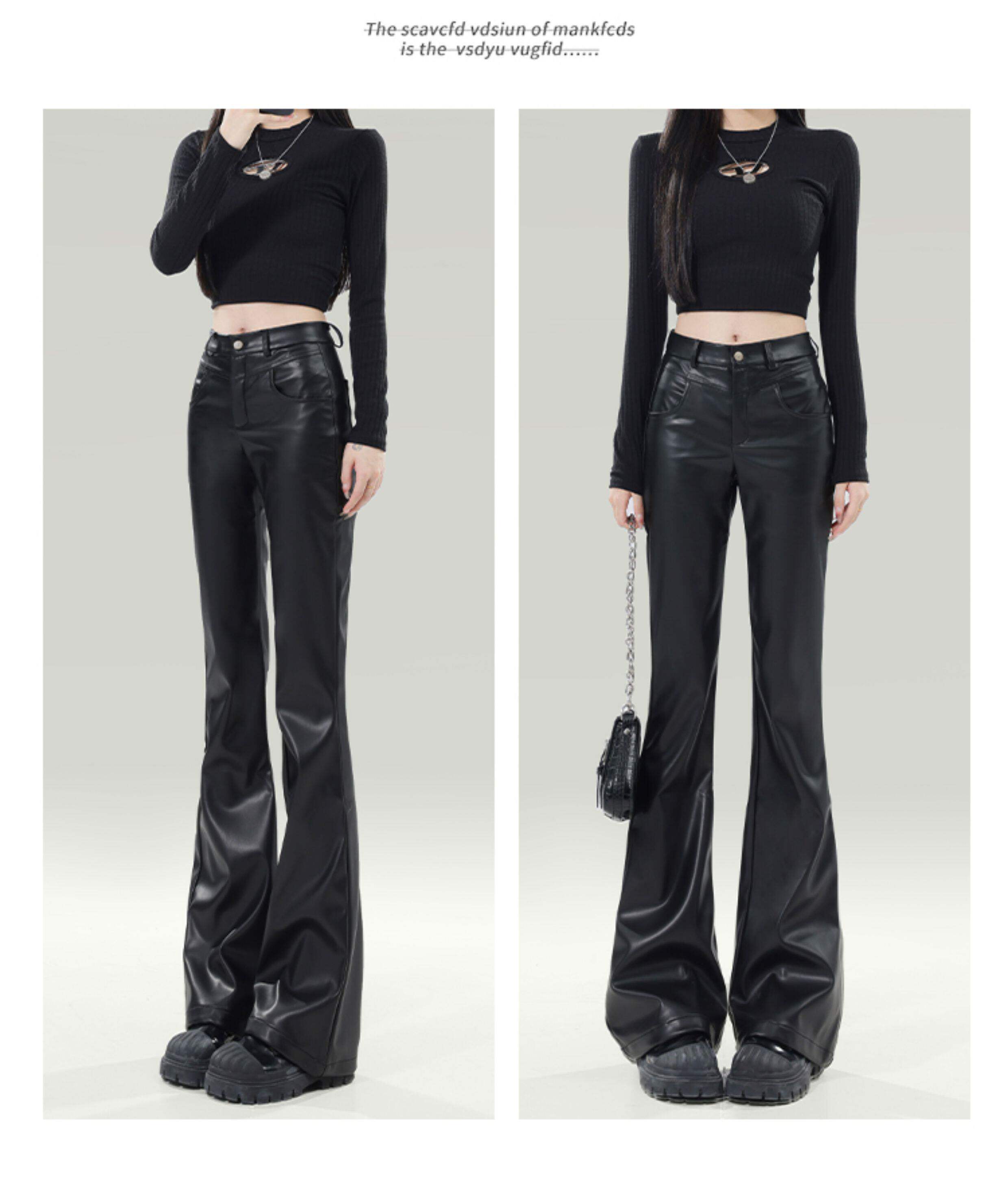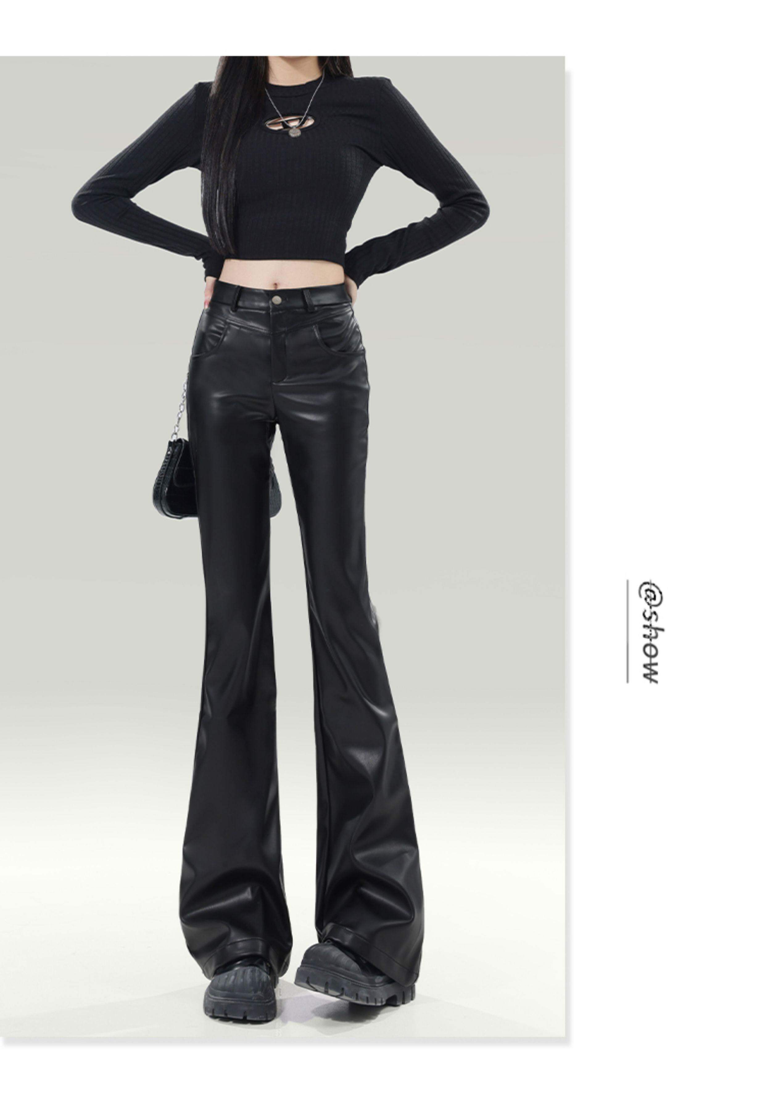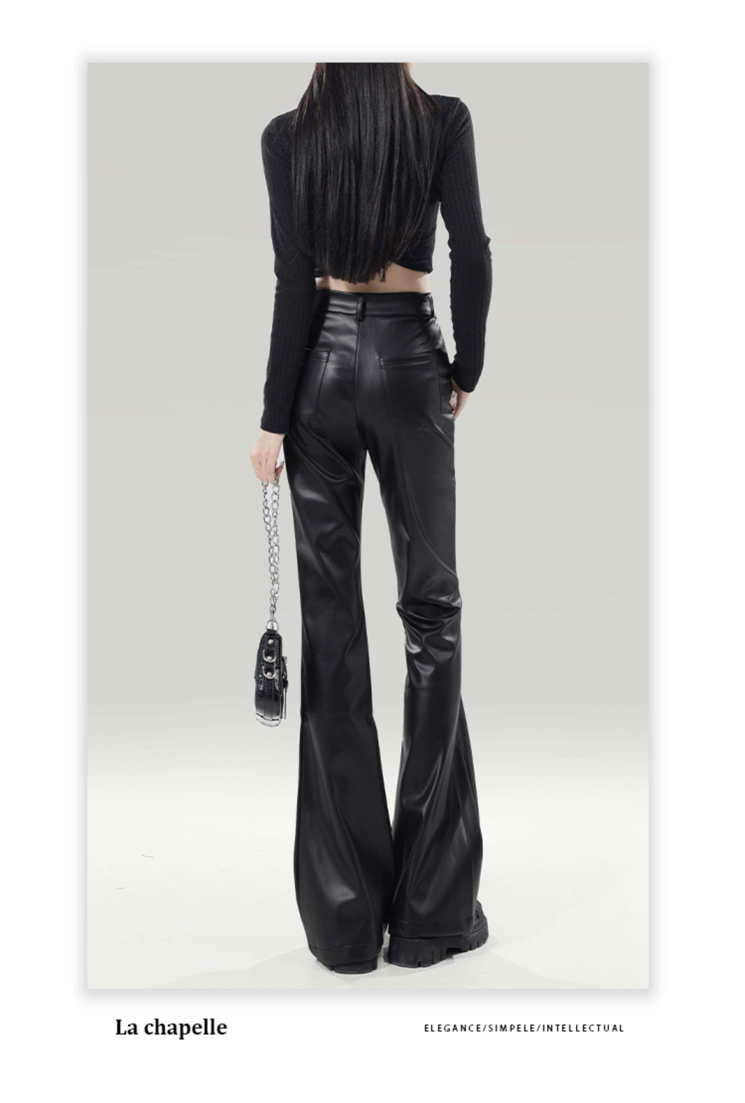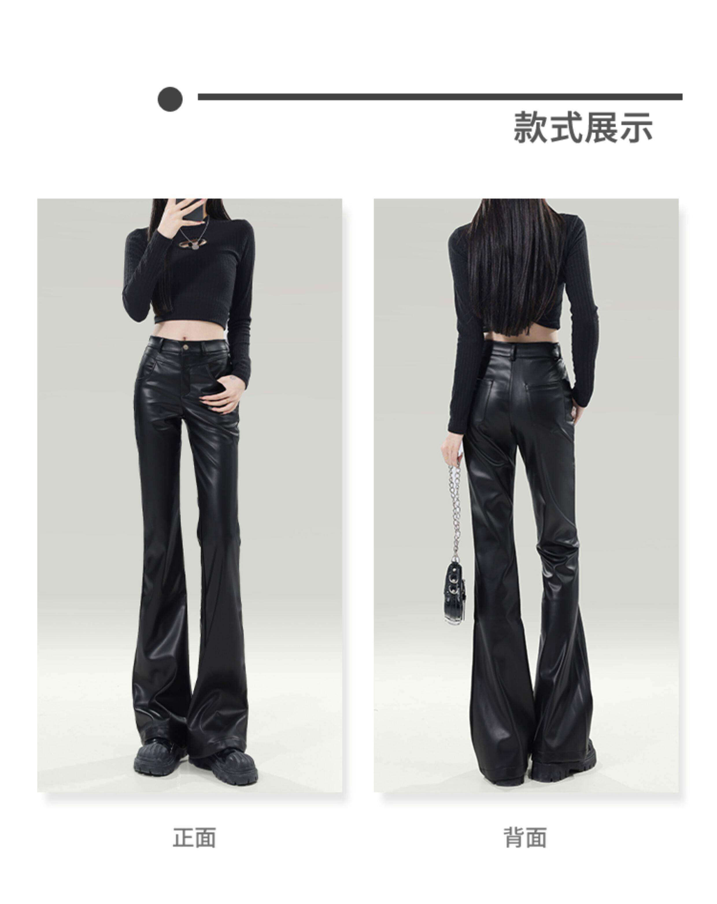 拉夏貝爾黑色皮褲女2026新款春季高腰修身顯瘦休閒小個子微喇叭褲