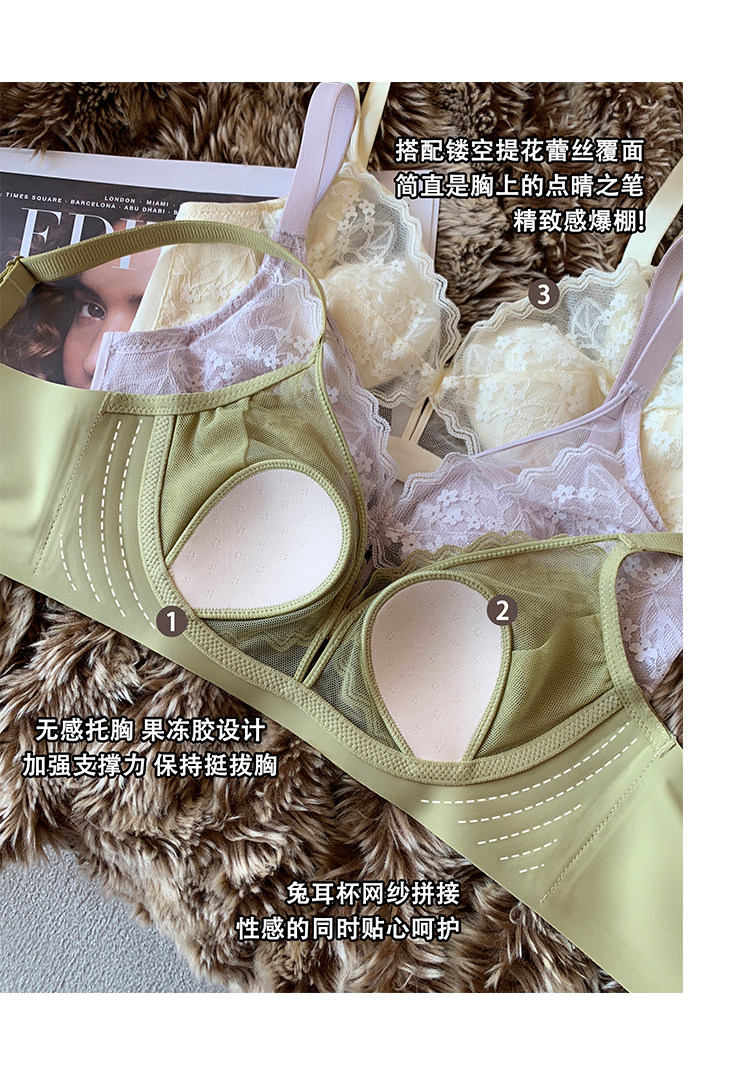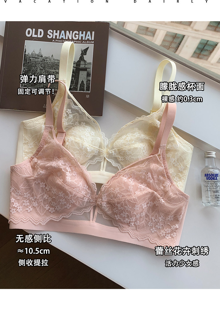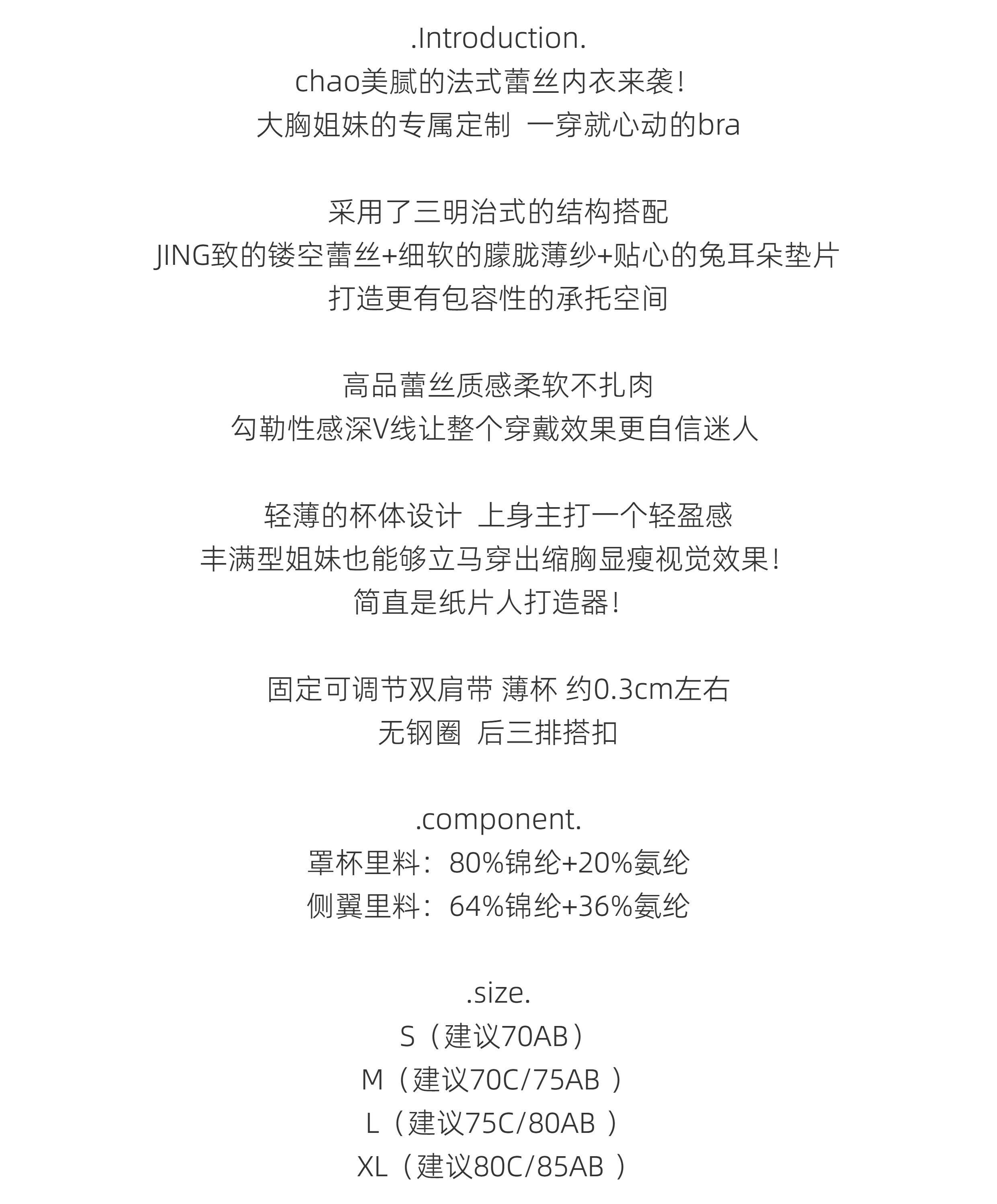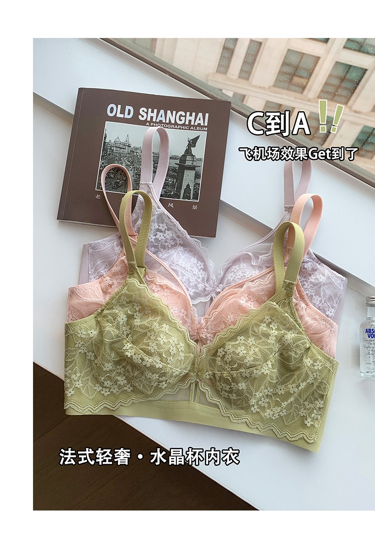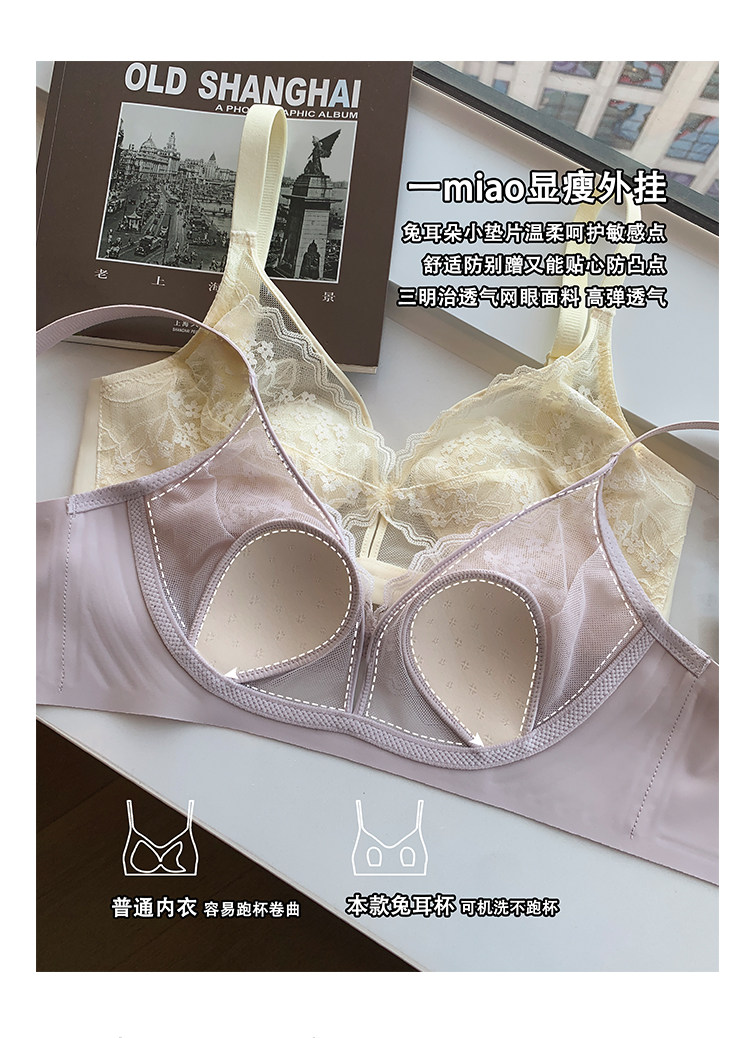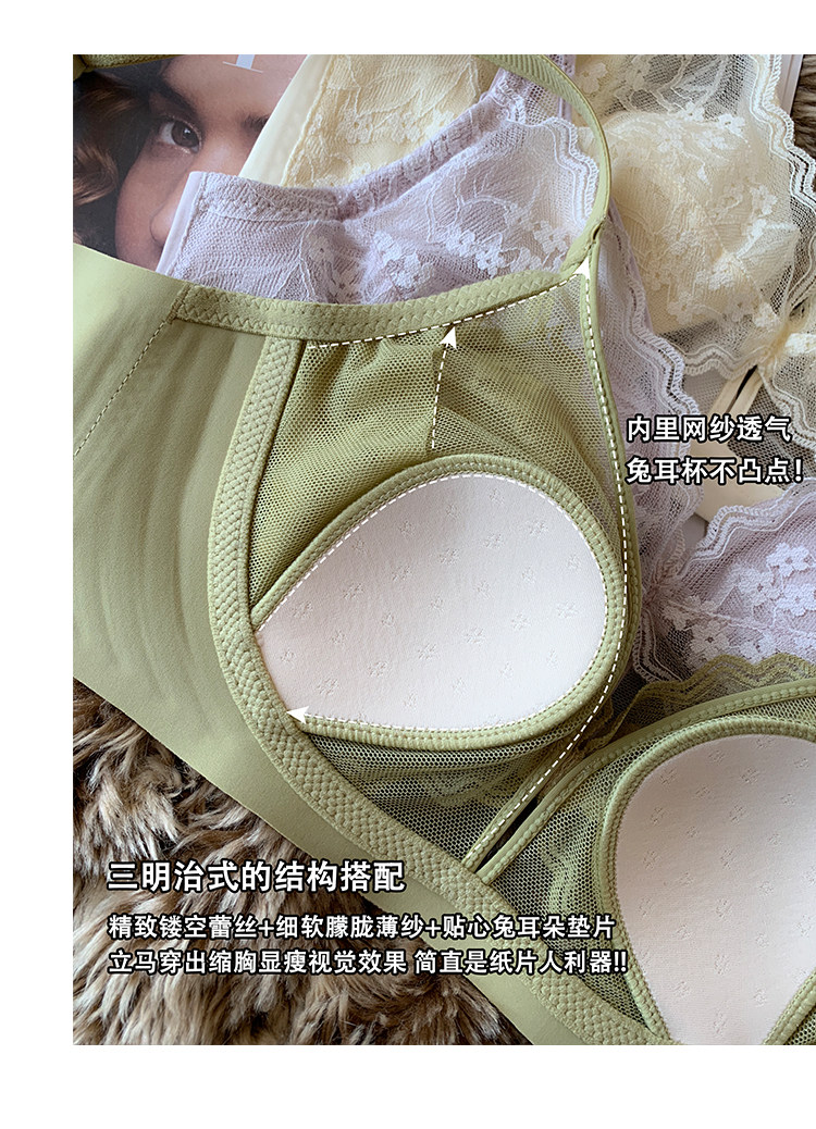 法式蕾絲薄款水晶杯大胸顯小內衣女顯瘦無鋼圈收副乳兔耳朵杯文胸