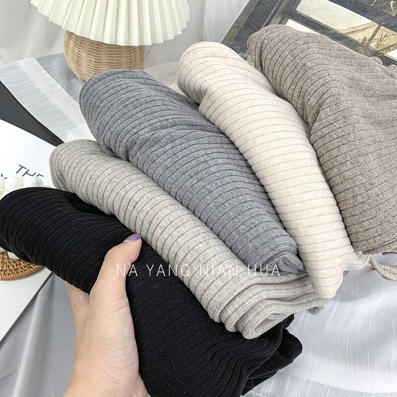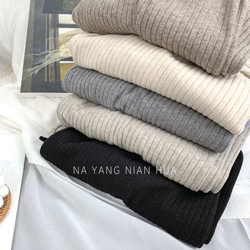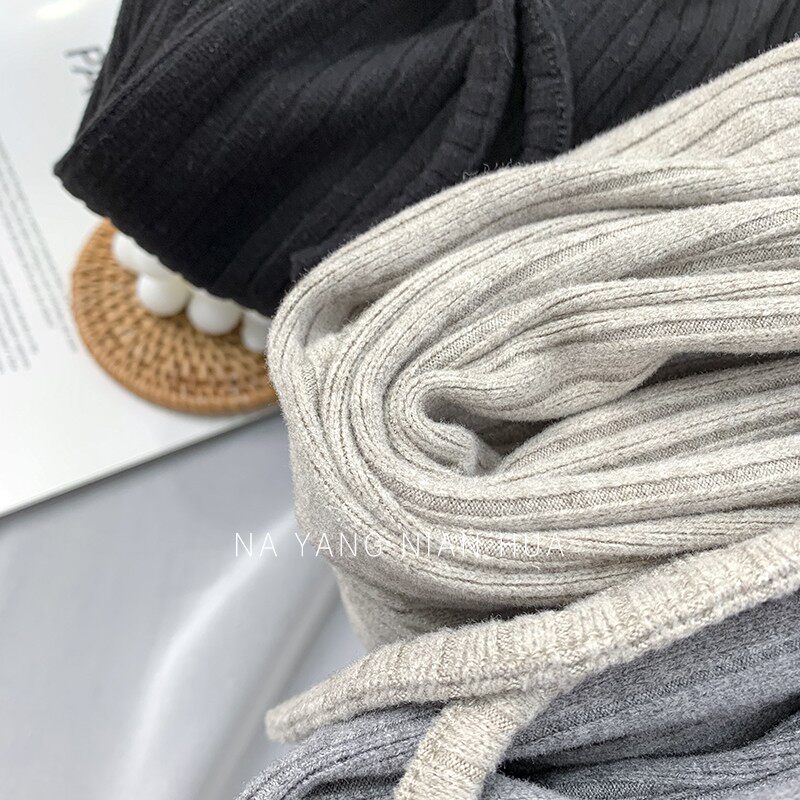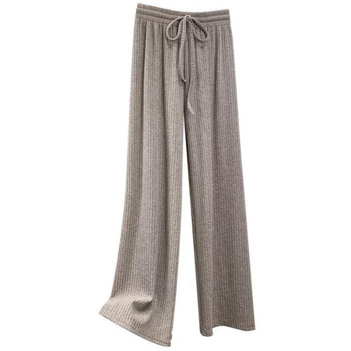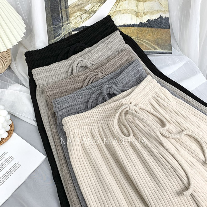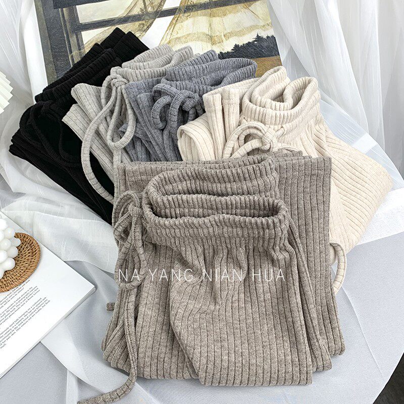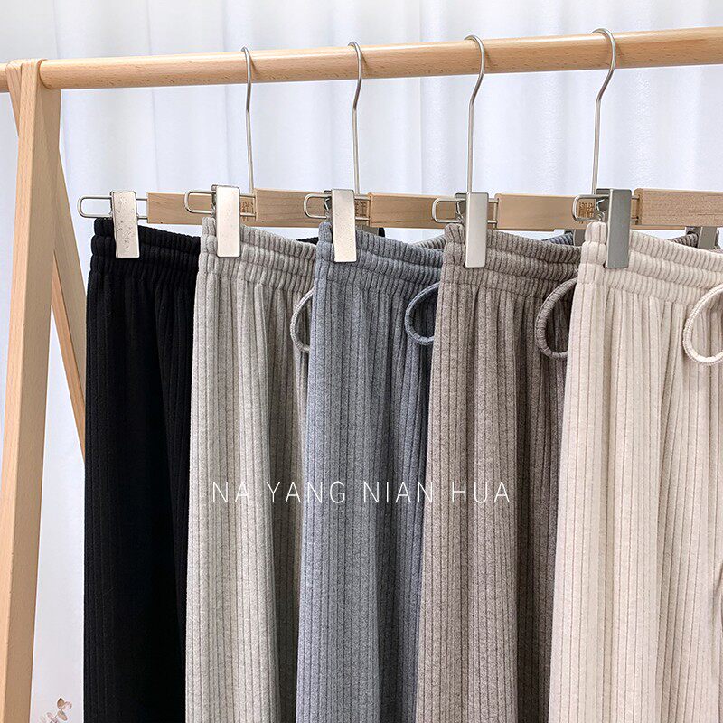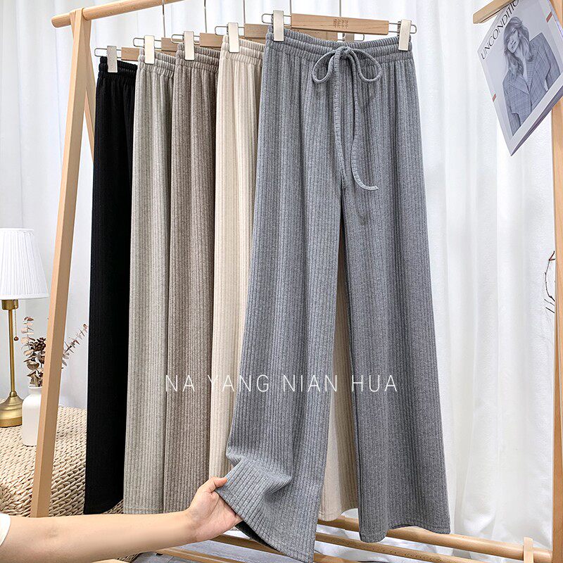 150小個子針織坑條濶腿褲女秋冬垂感顯高155兔絨拖地直筒休閒長褲