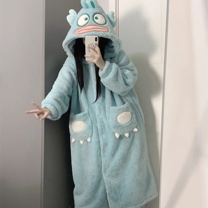 可愛卡通小醜魚珊瑚絨連帽睡衣女冬季新款加絨加厚家居服睡袍睡裙
