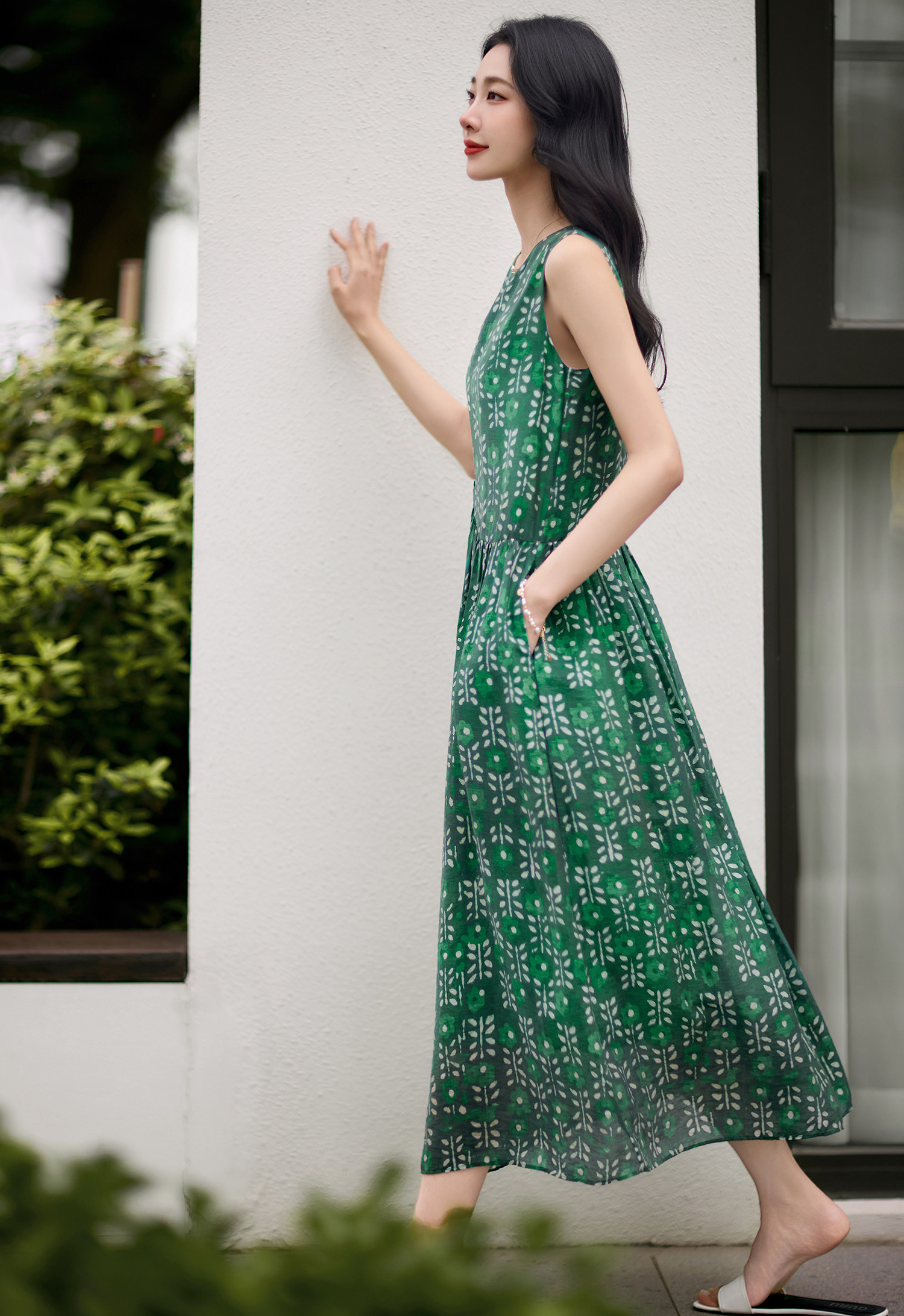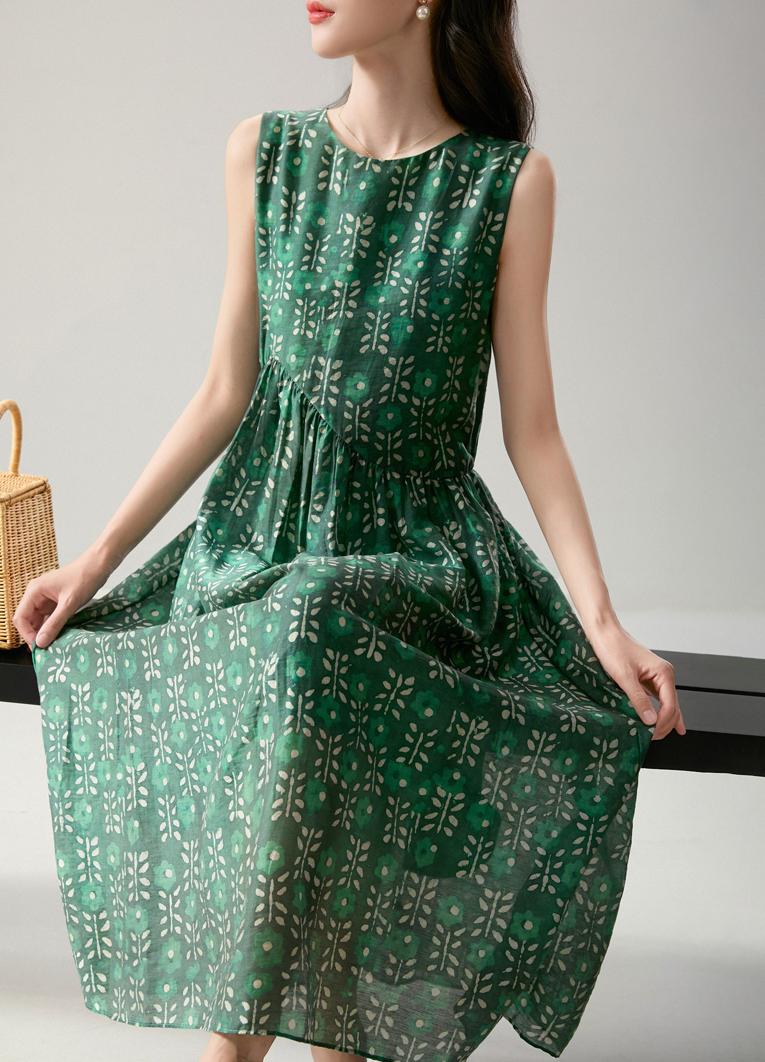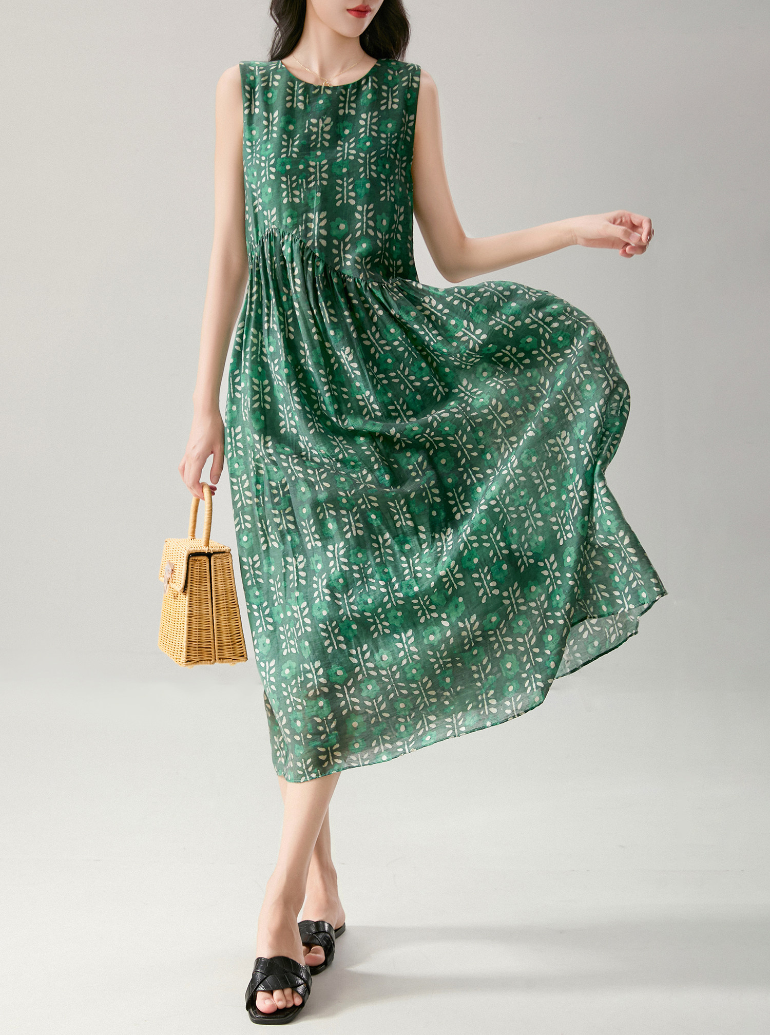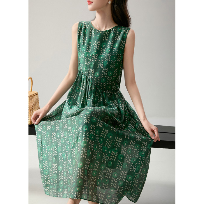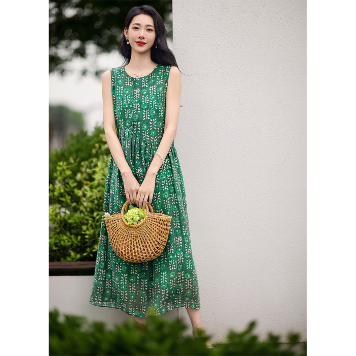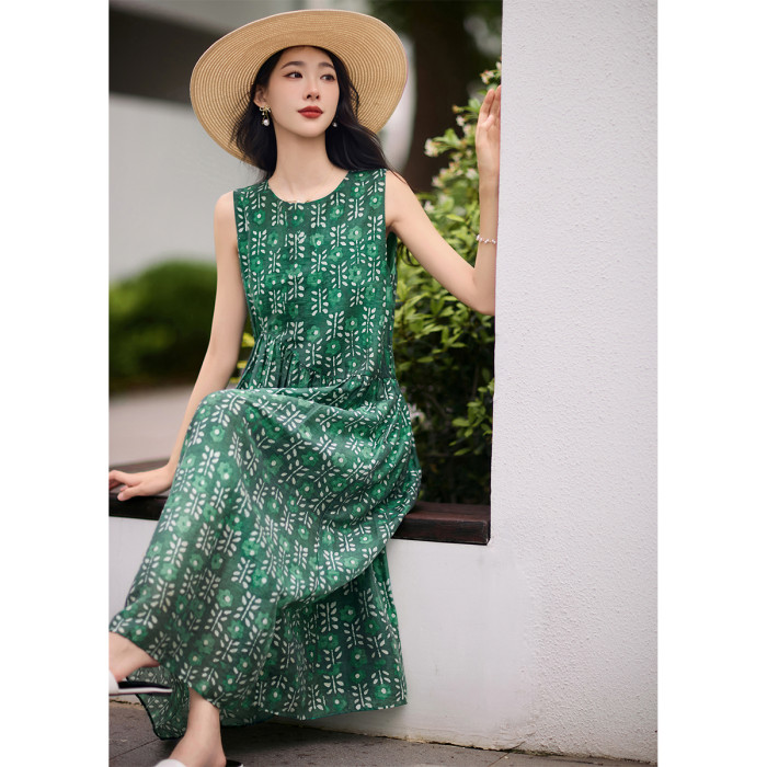 簡漫【綠蘿輕蔓】天絲亞麻 腰部不規則設計 寬鬆碎花無袖連衣裙女