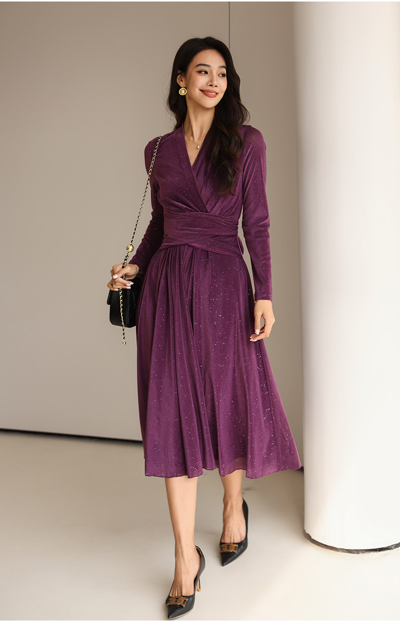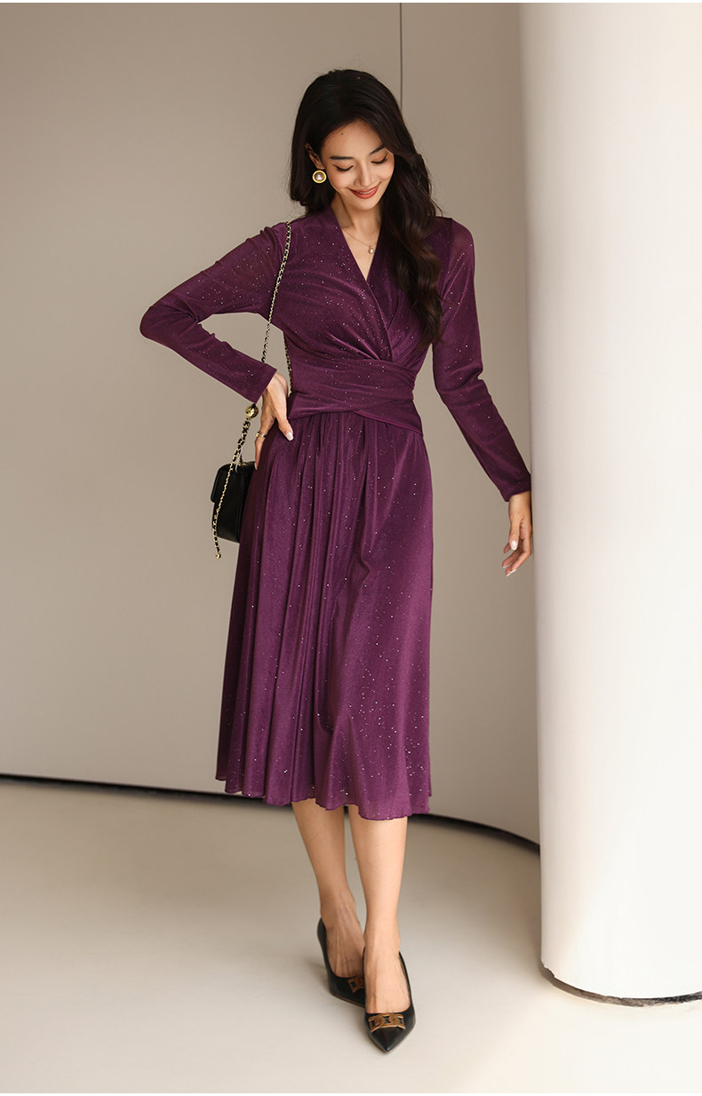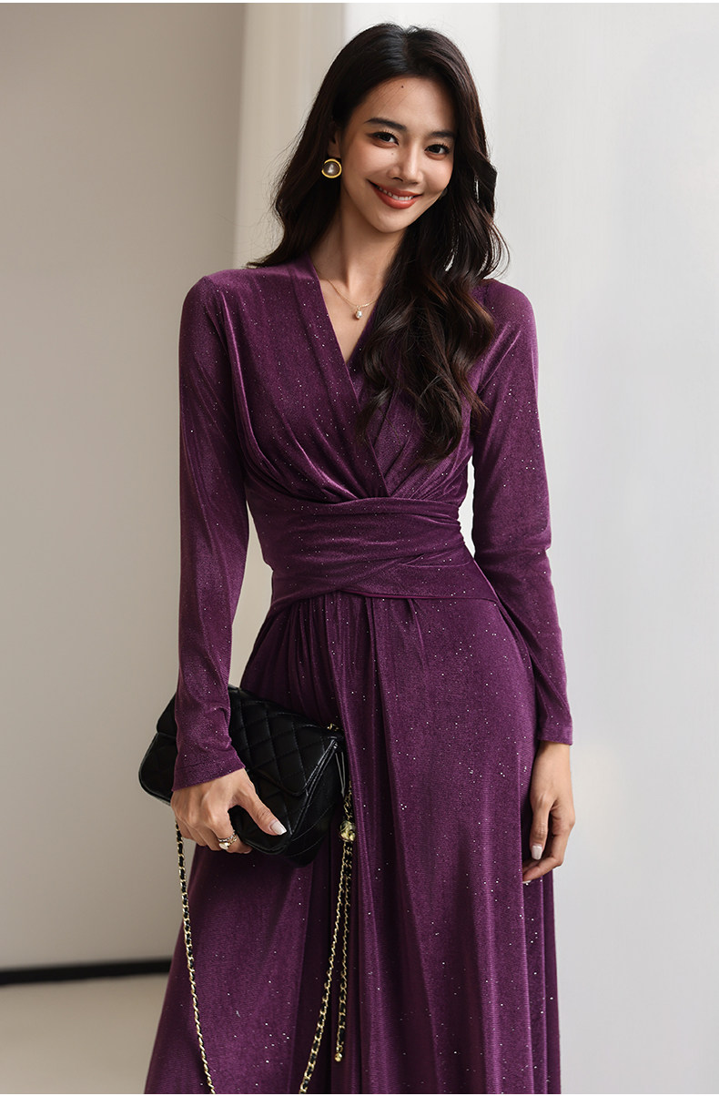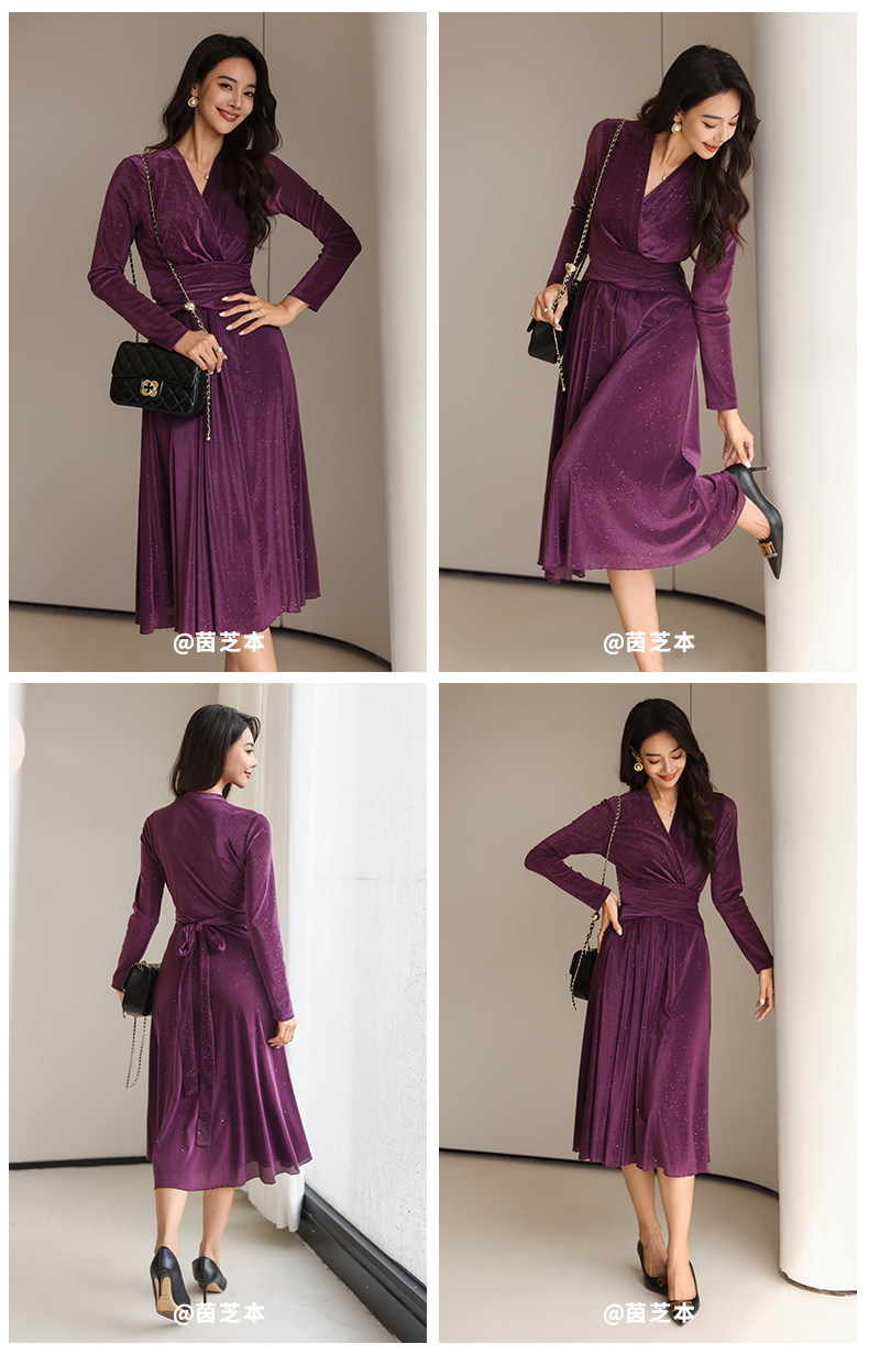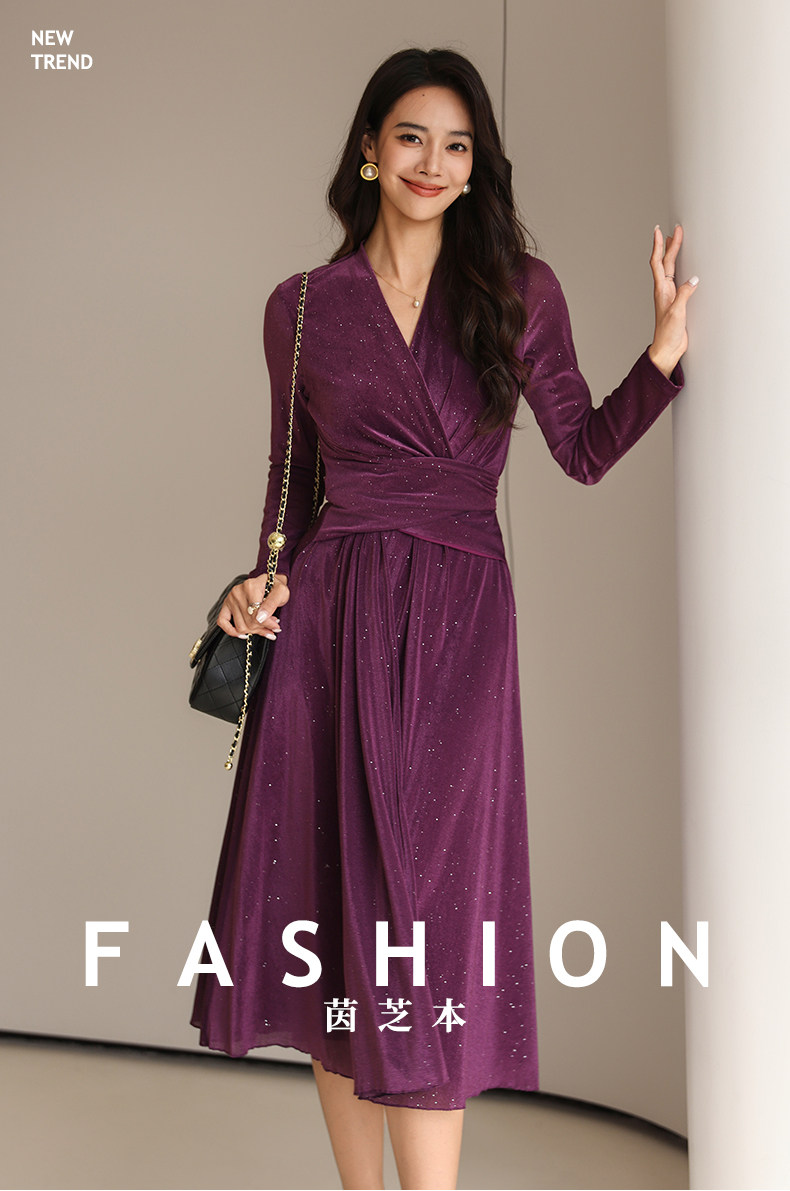 茵芝本 絲絨紫色裹身裙法式收腰顯瘦套頭綁帶連衣裙2025年新款女