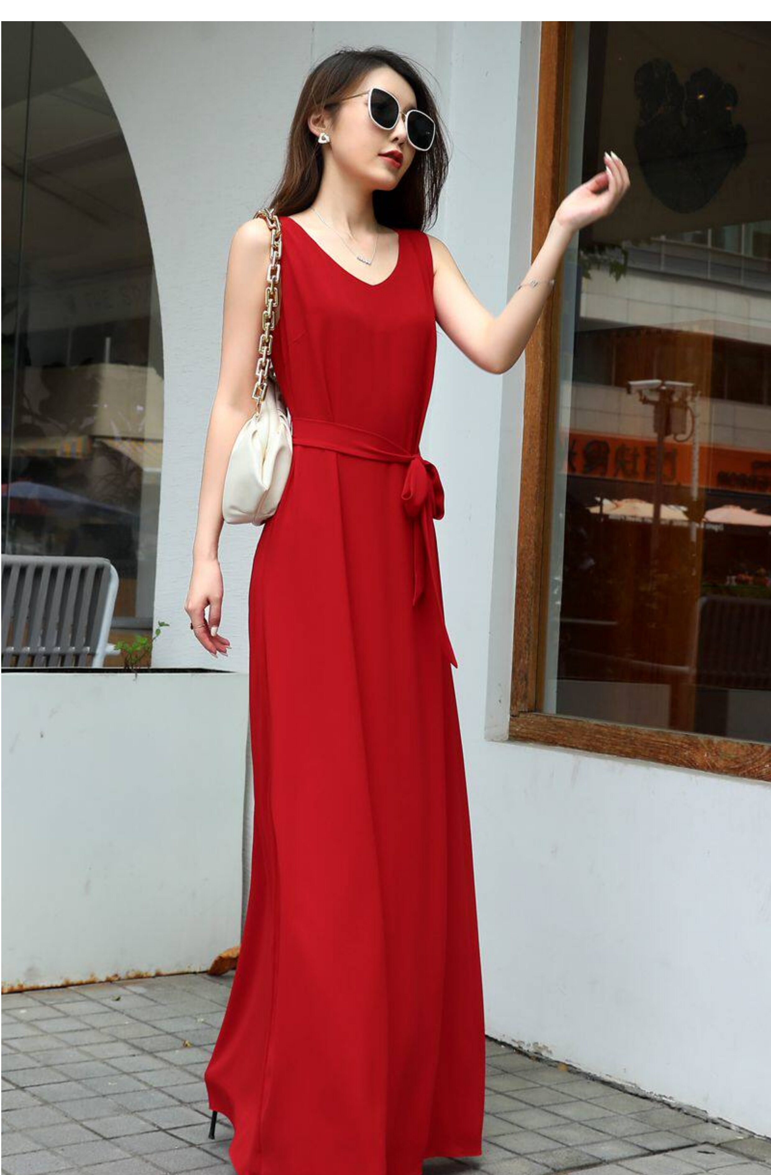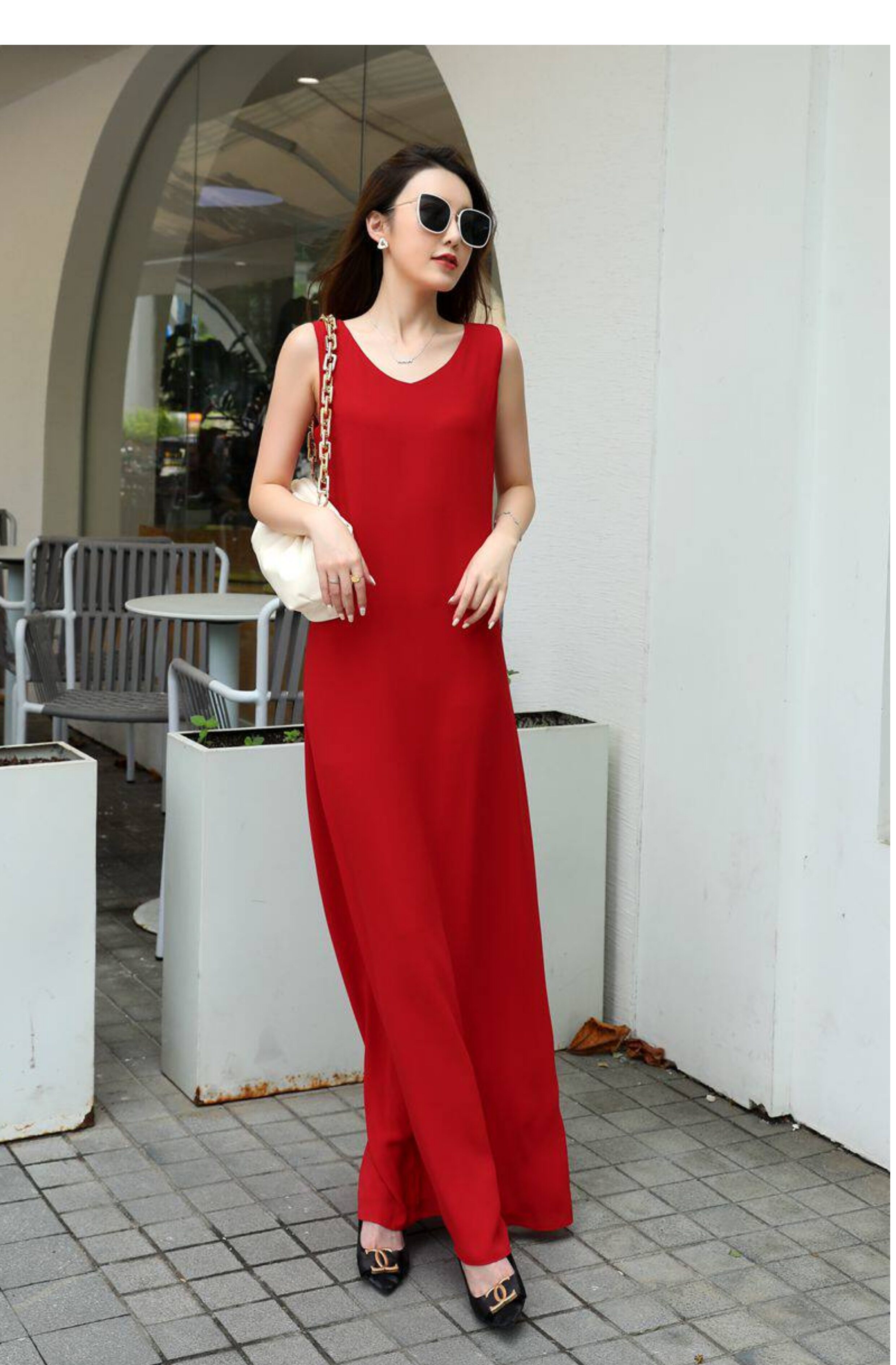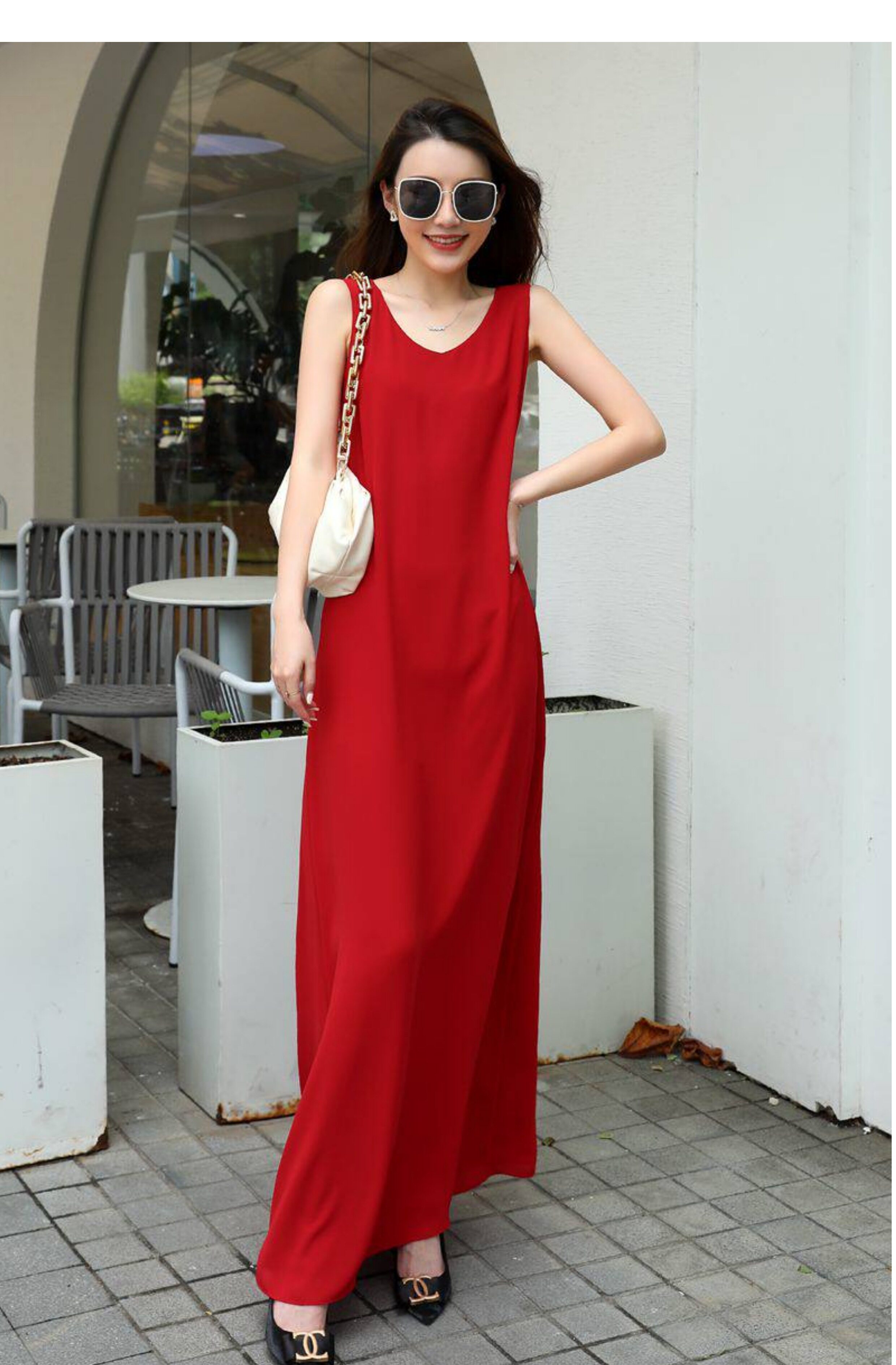 紅色連衣裙夏女大碼高個子A字裙腳裸超長裙寬鬆V領長款吊帶背心裙