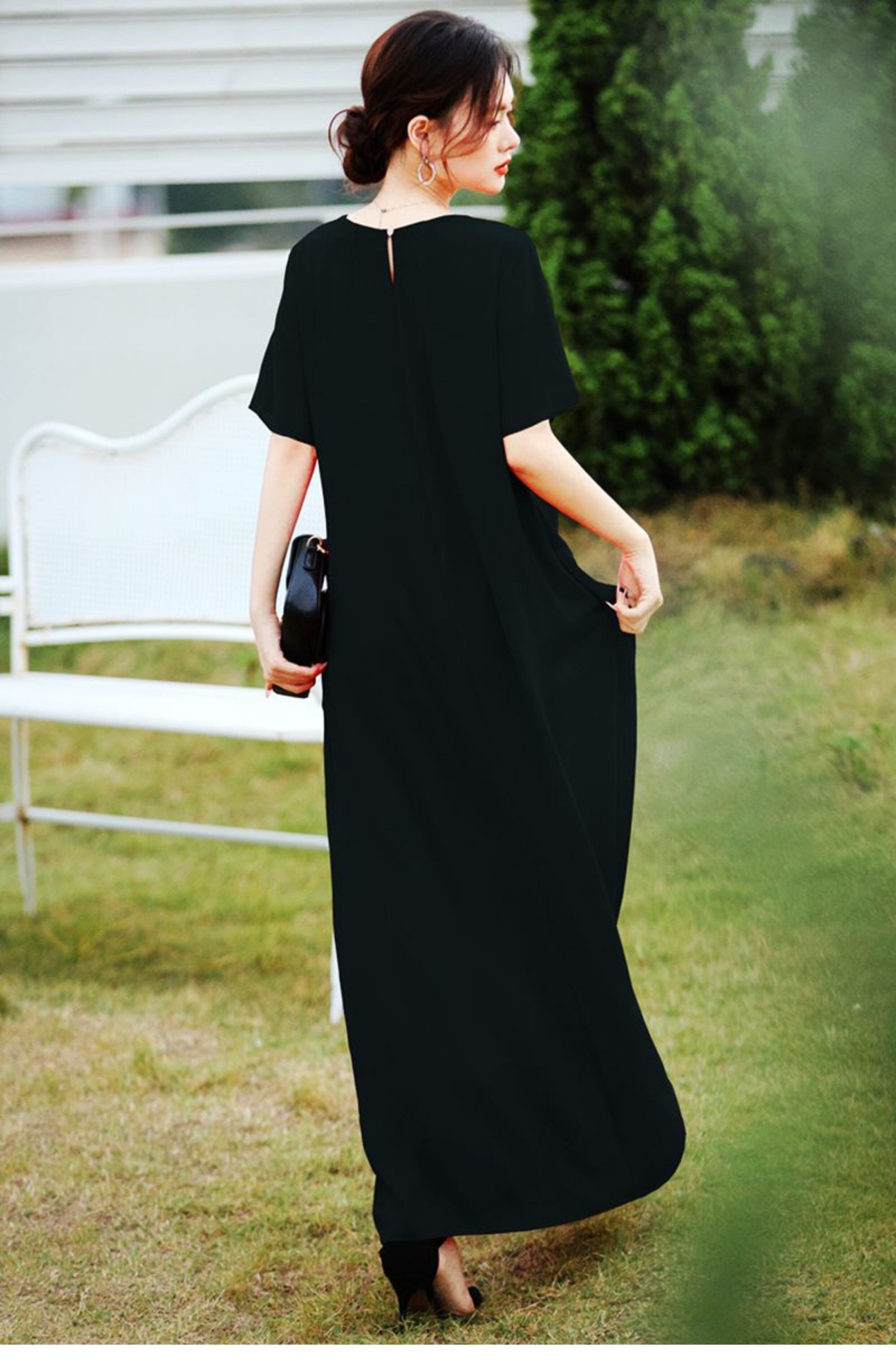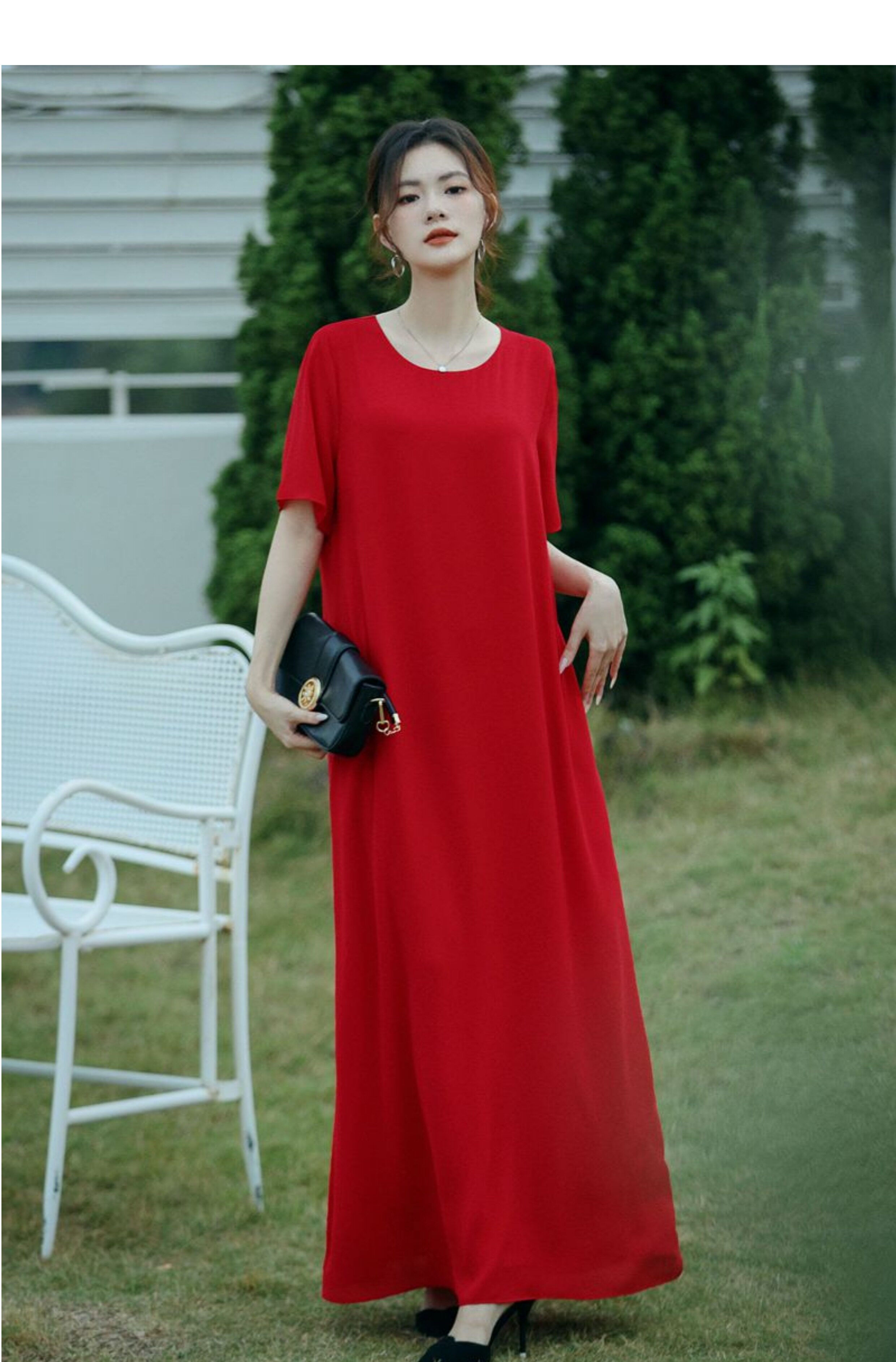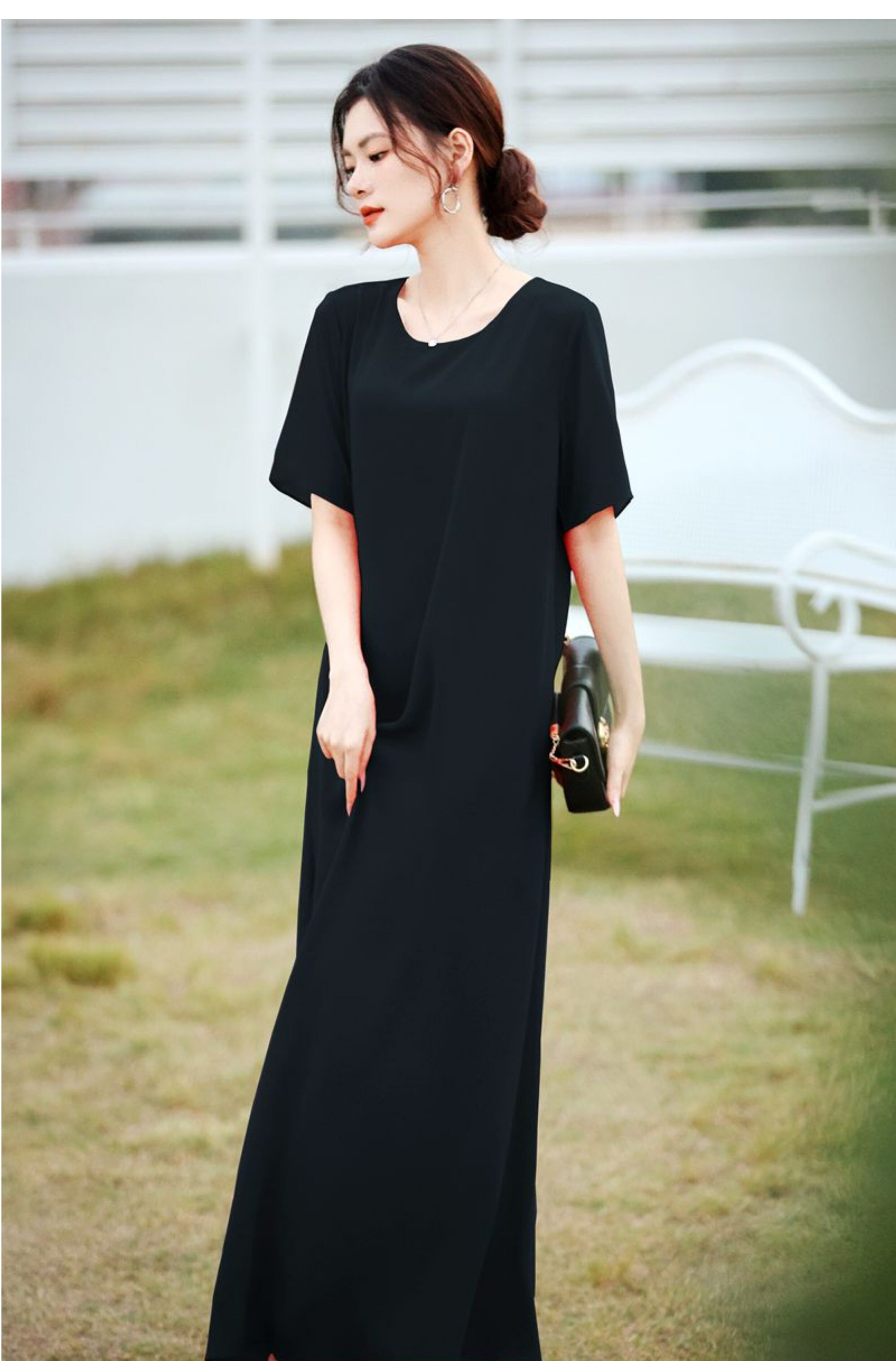連衣裙女夏長款寬鬆極簡慵懶長裙短袖腳裸大碼裙氣質垂感遮肚裙