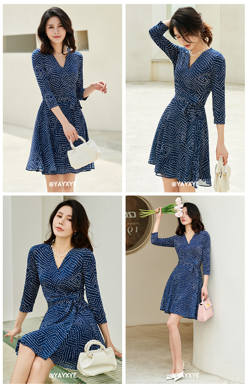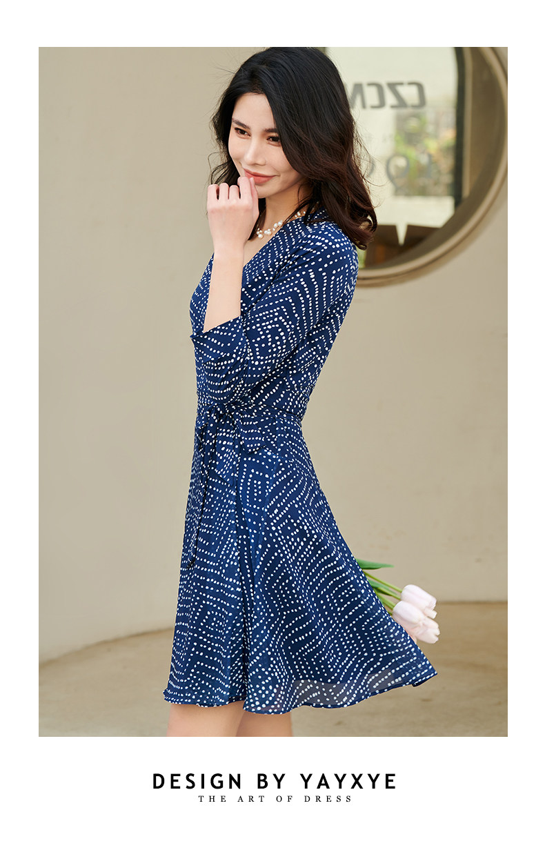 茵芝本 裹身裙法式藍色波點收腰顯瘦連衣裙女短款小個子夏季新款
