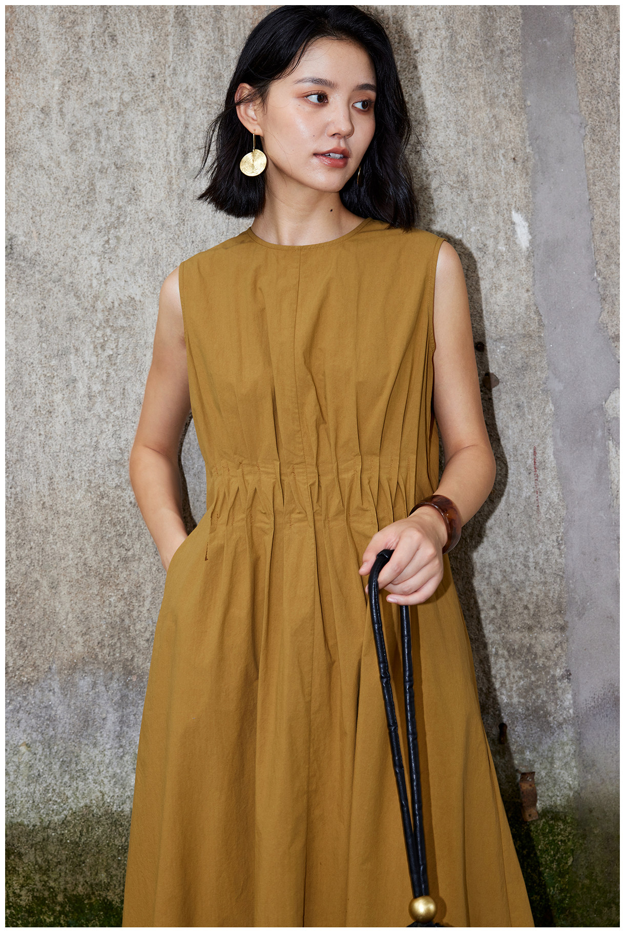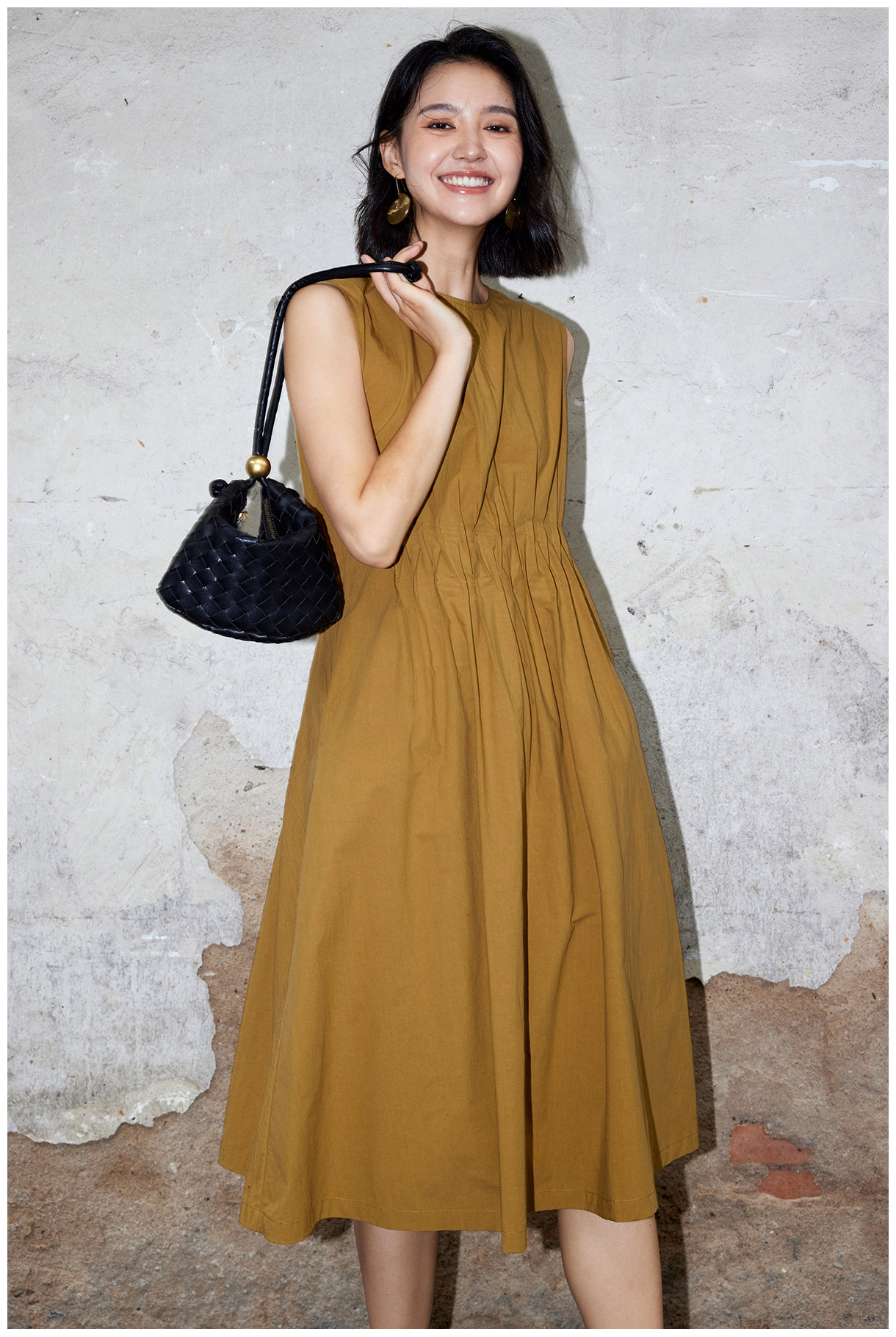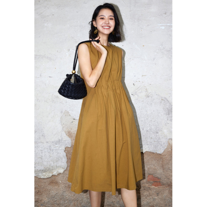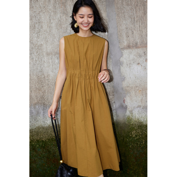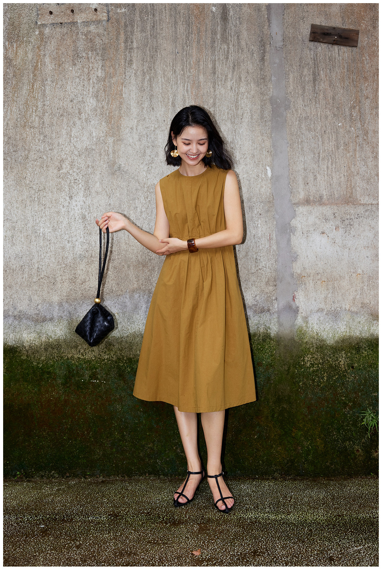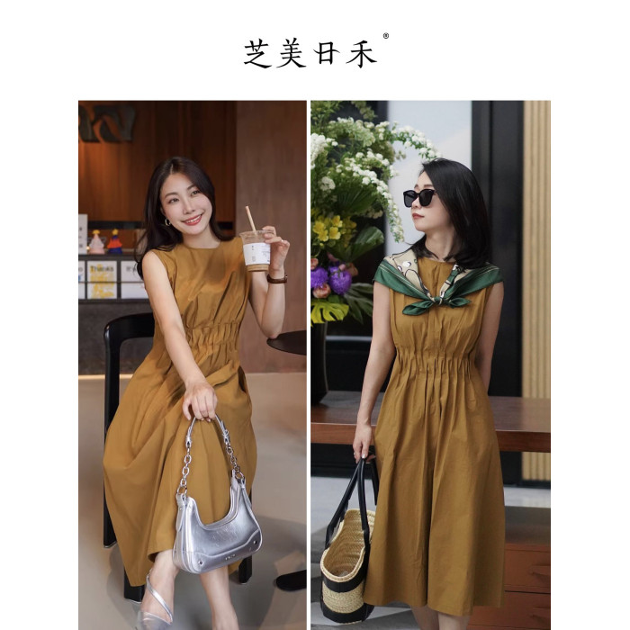芝美日禾 自然褶皺收腰背心連衣裙焦糖色全棉無袖極簡通勤復古
