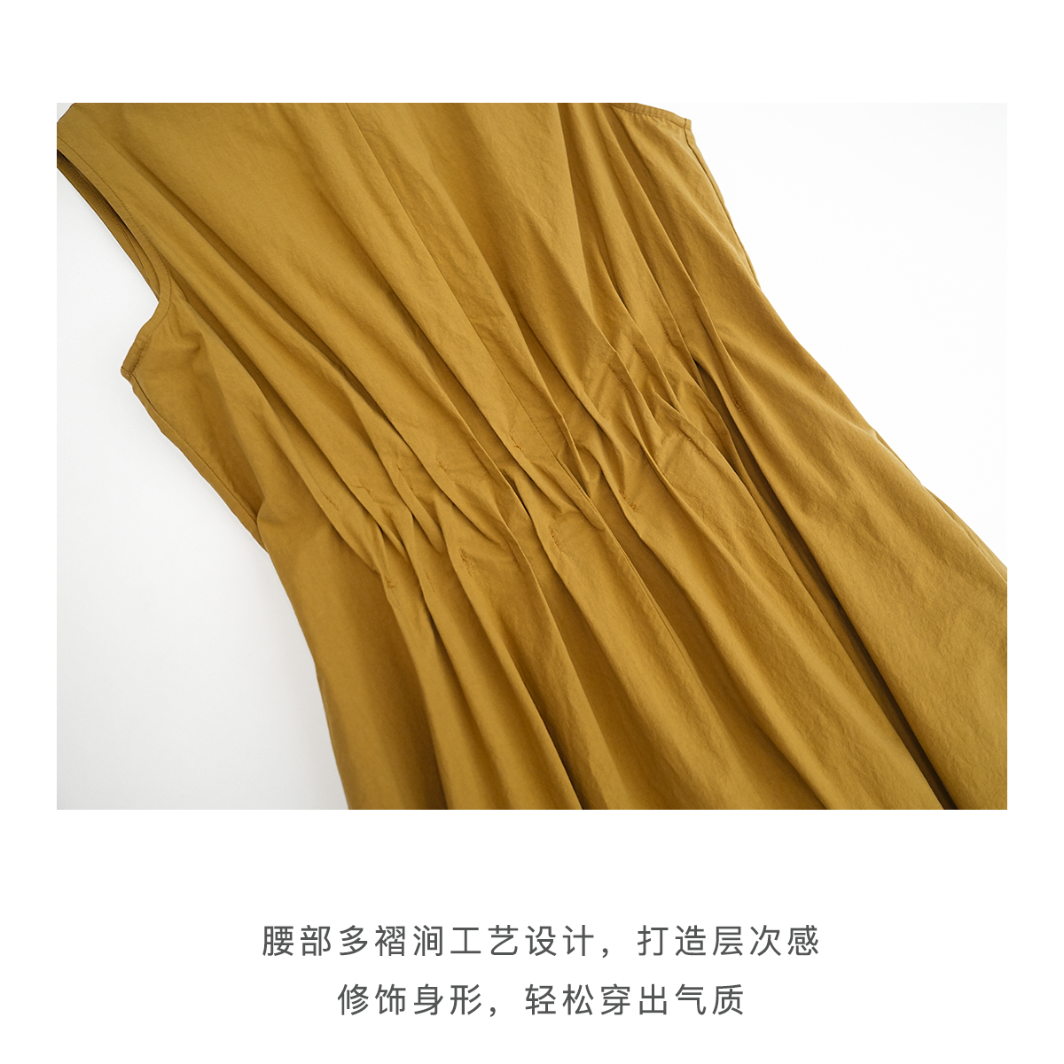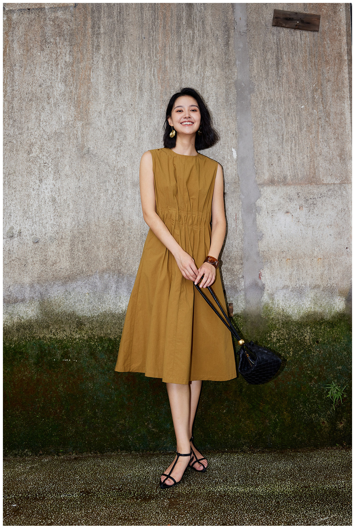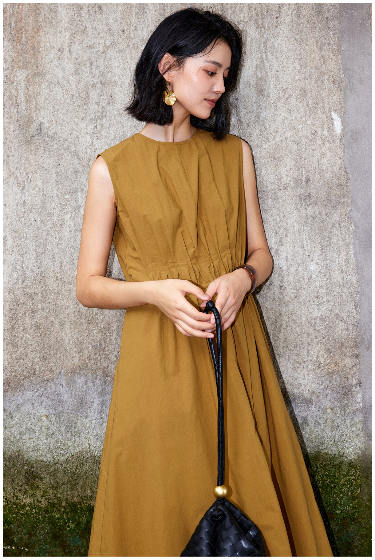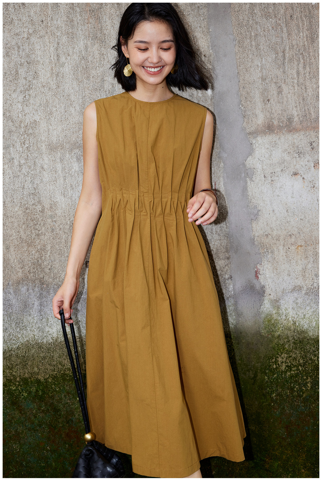 芝美日禾 自然褶皺收腰背心連衣裙焦糖色全棉無袖極簡通勤復古