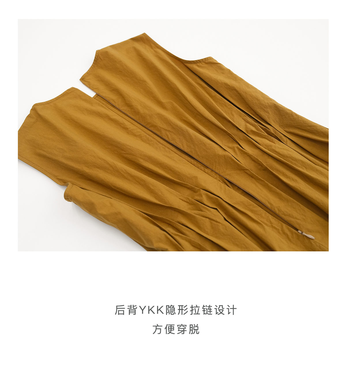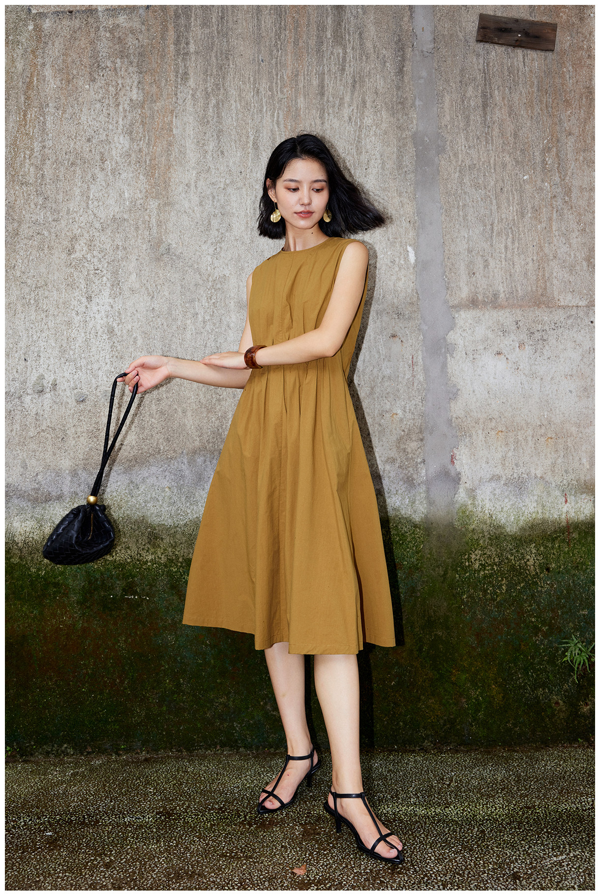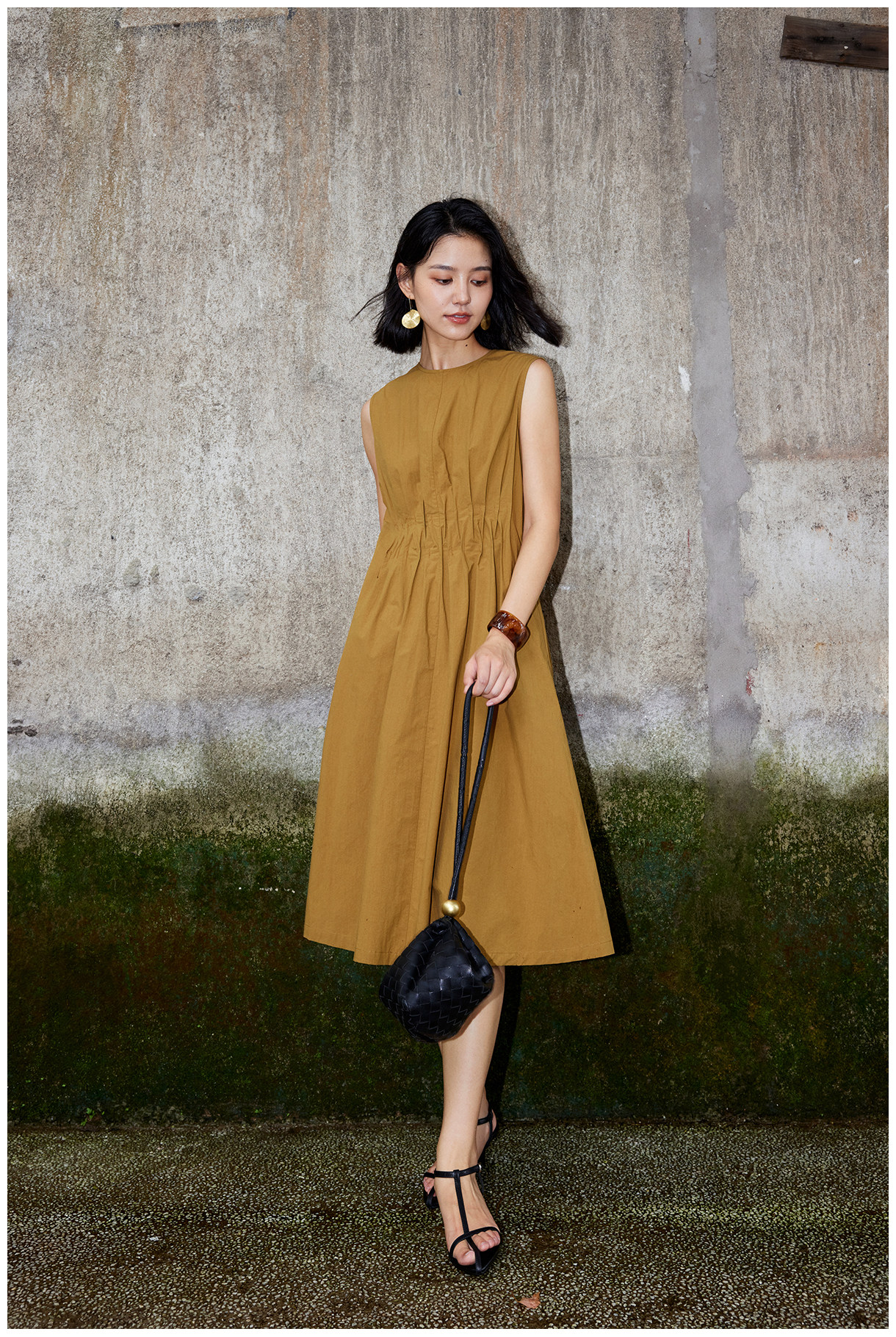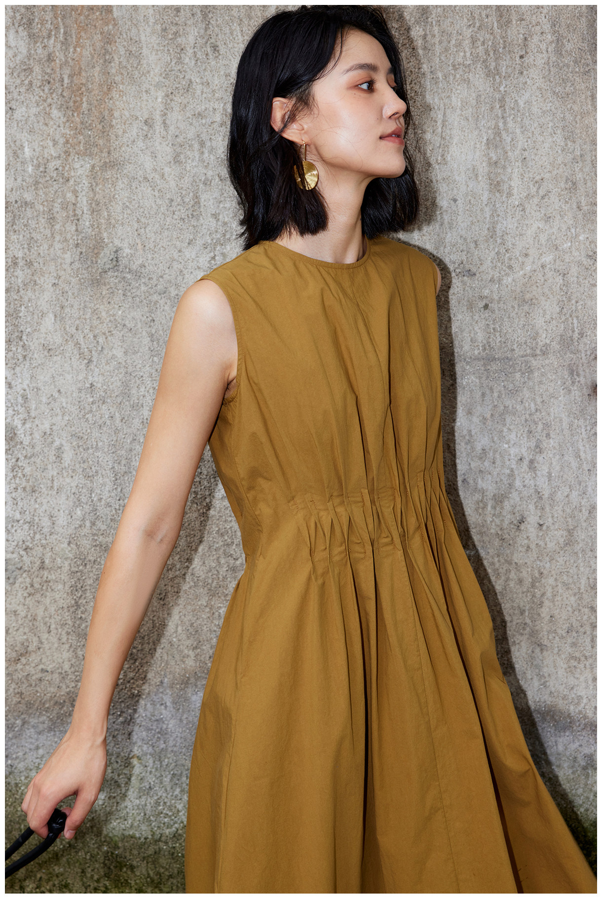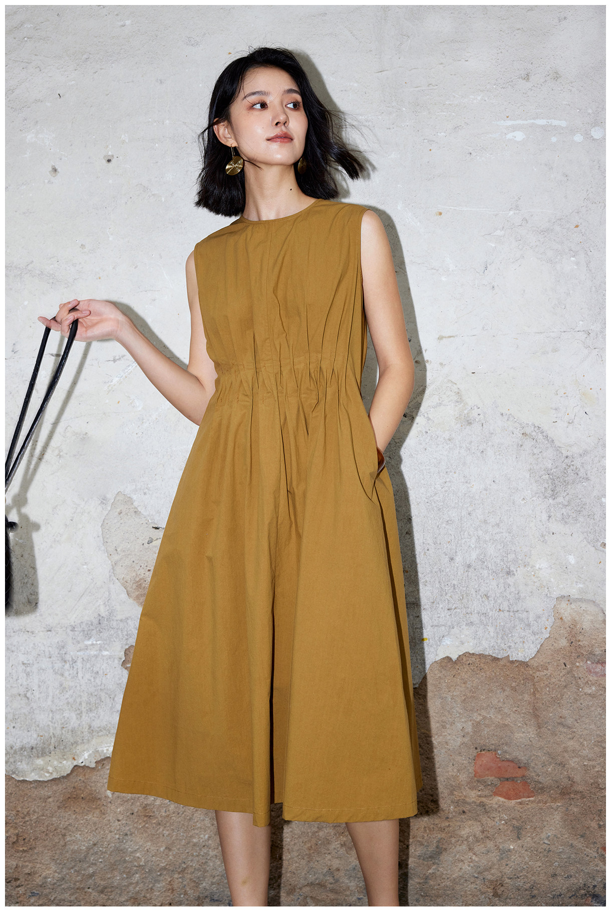 芝美日禾 自然褶皺收腰背心連衣裙焦糖色全棉無袖極簡通勤復古