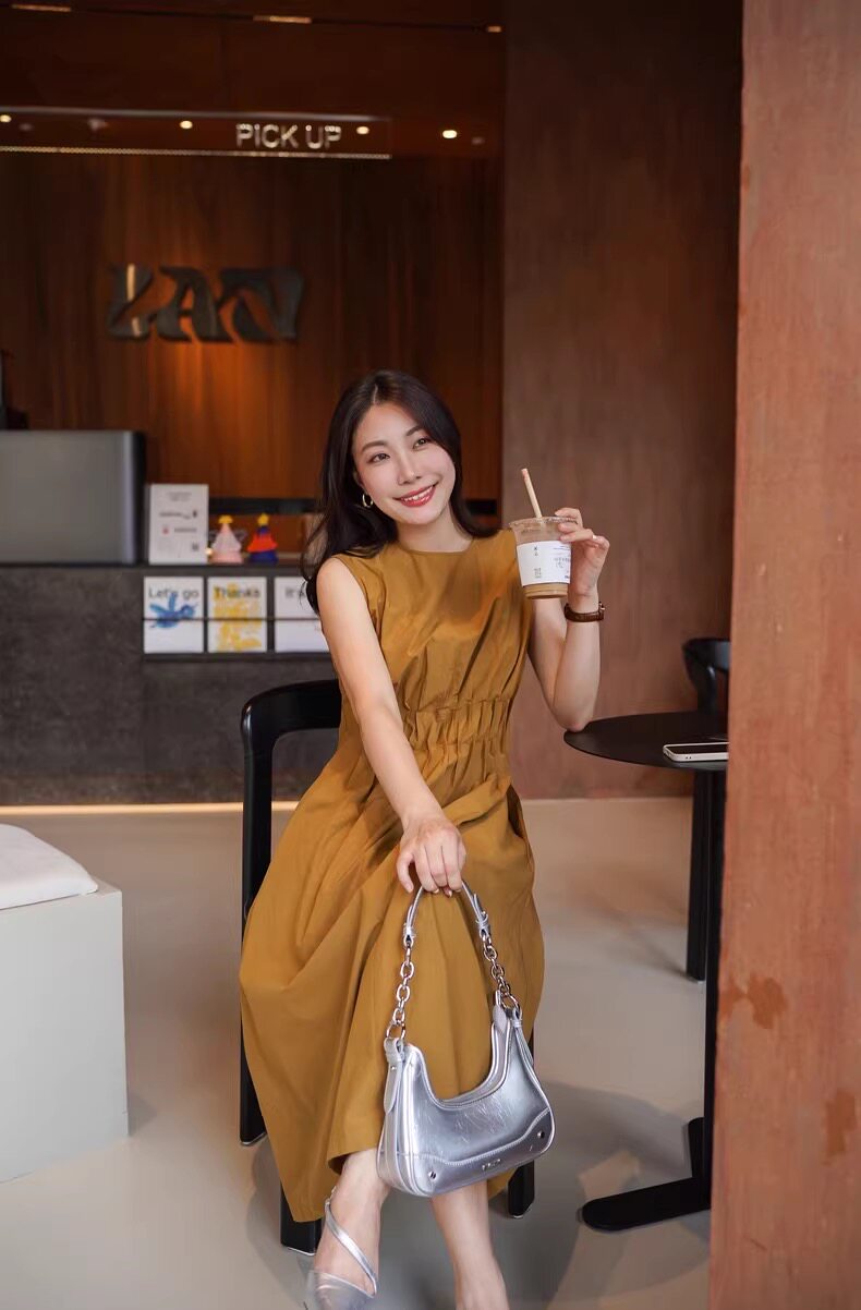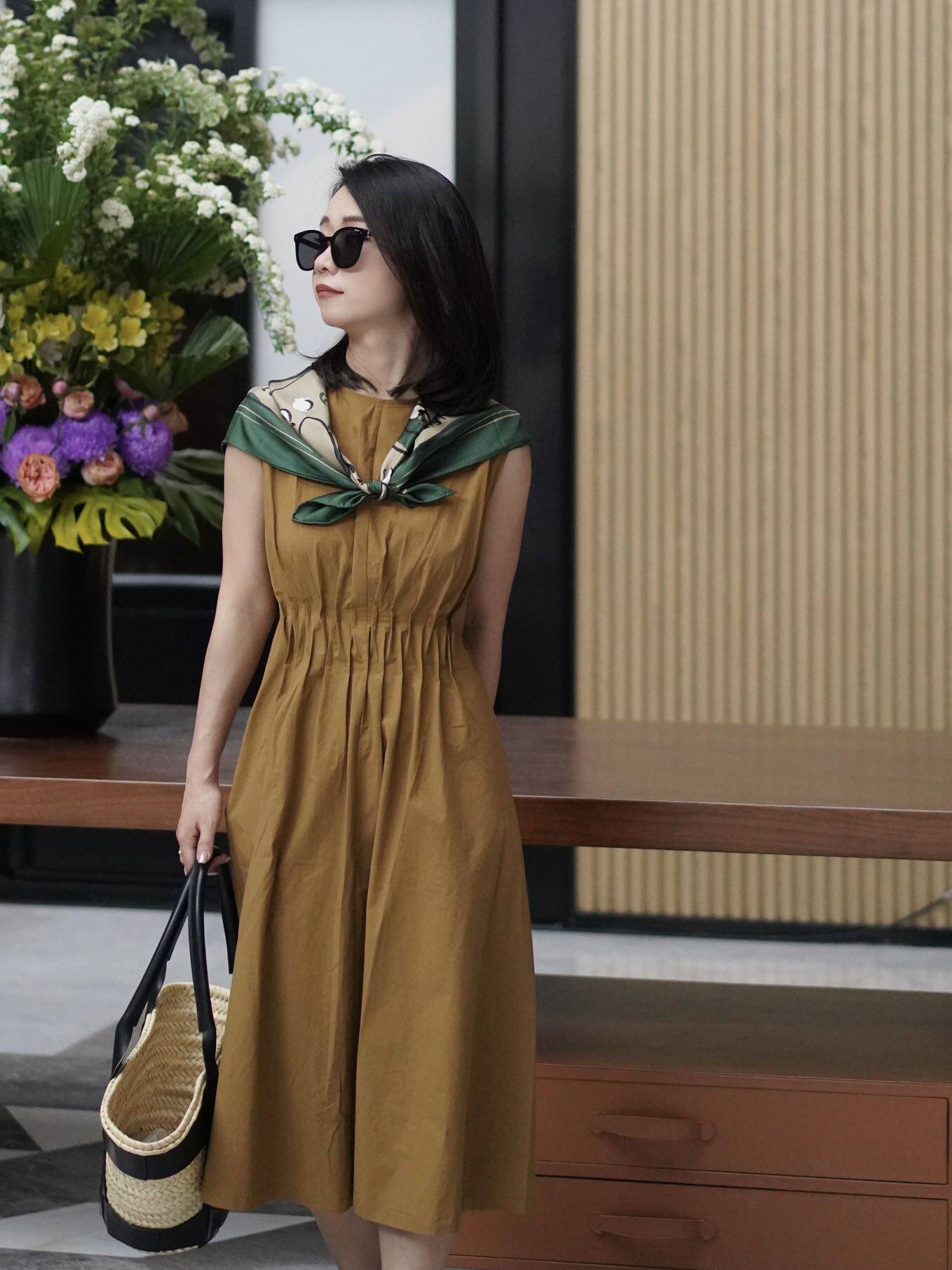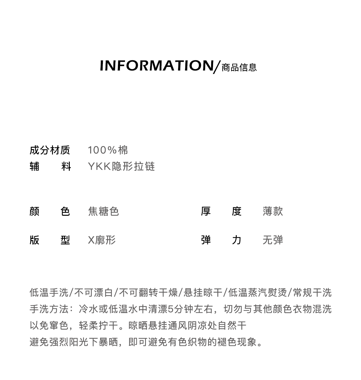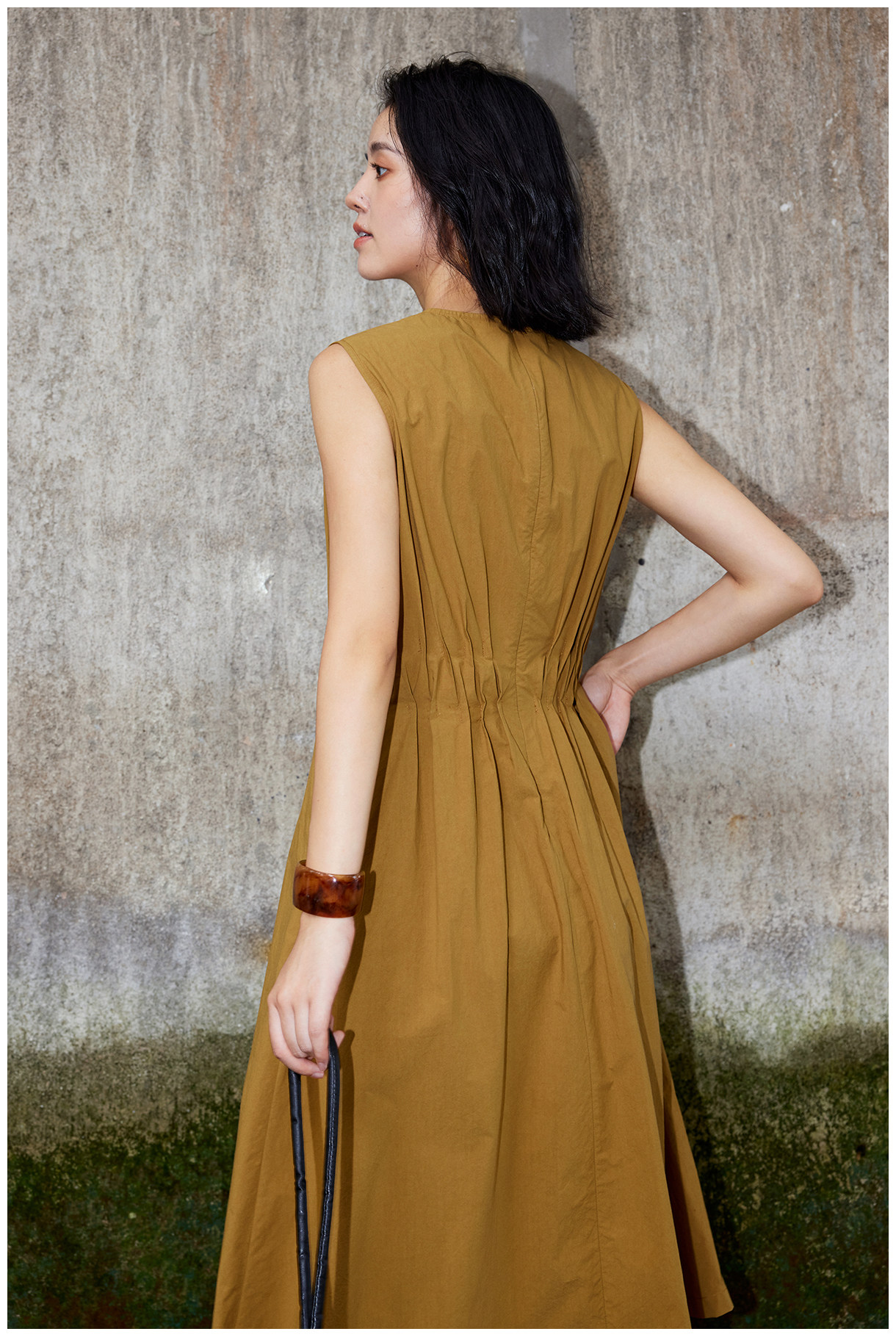 芝美日禾 自然褶皺收腰背心連衣裙焦糖色全棉無袖極簡通勤復古