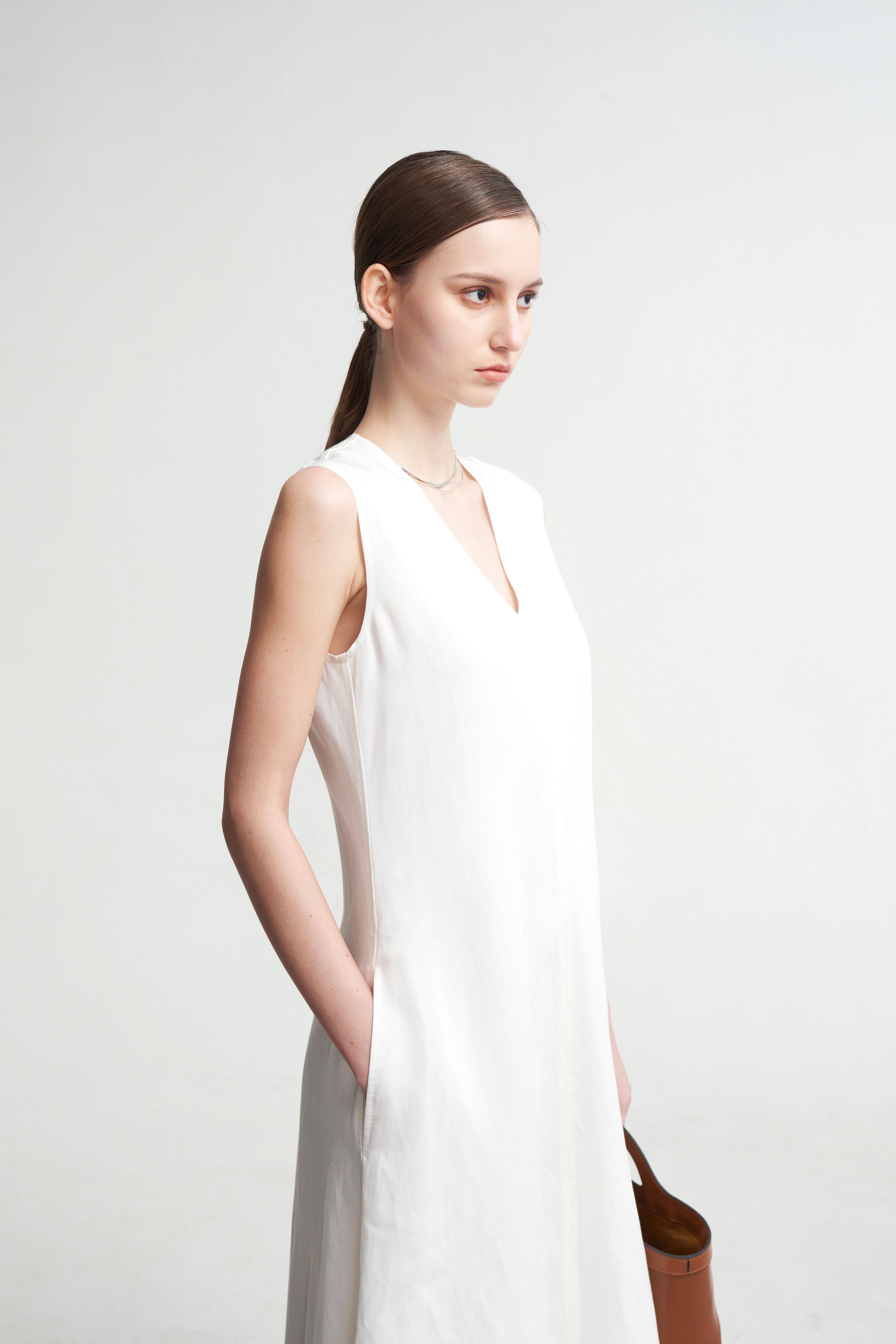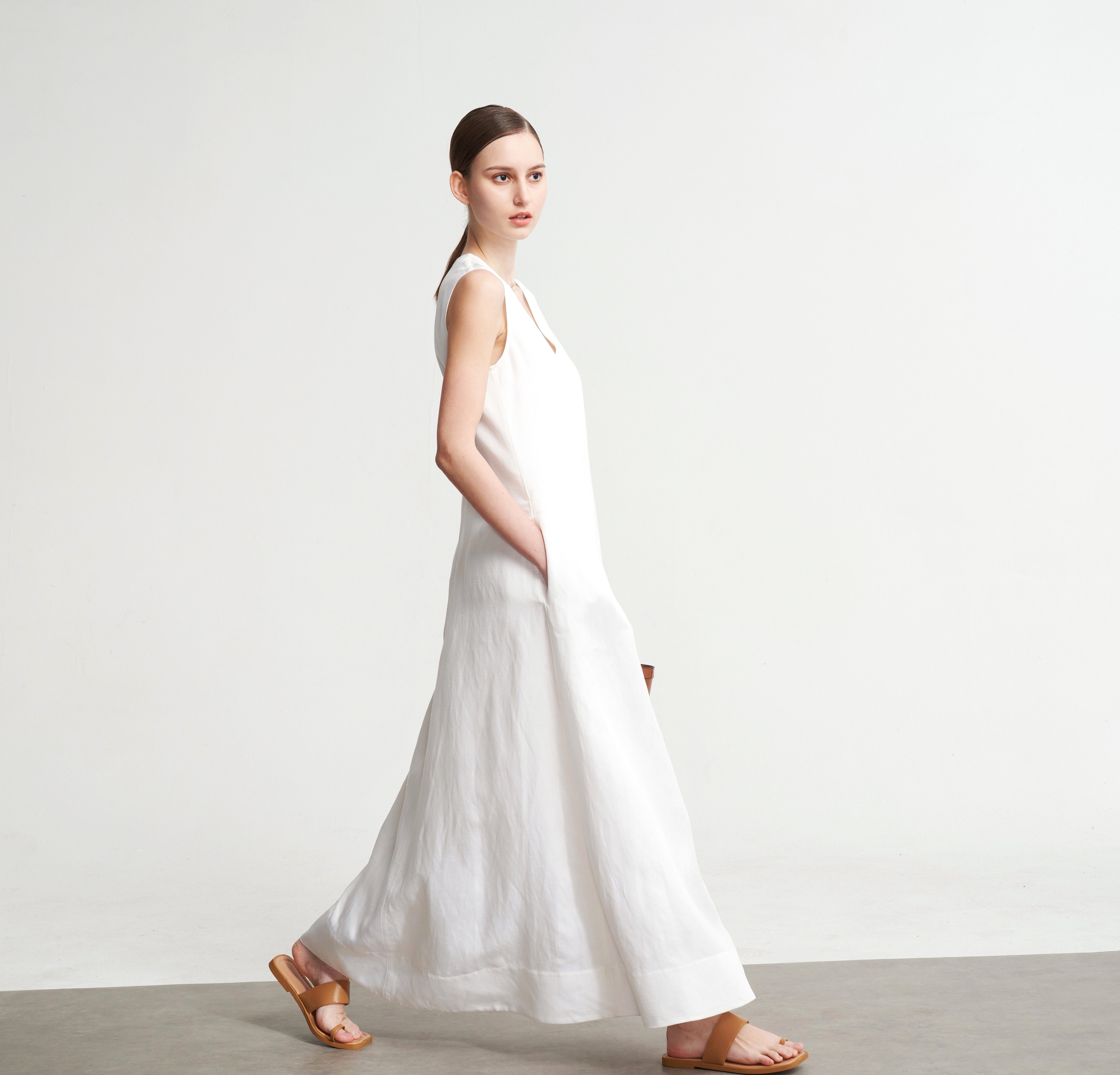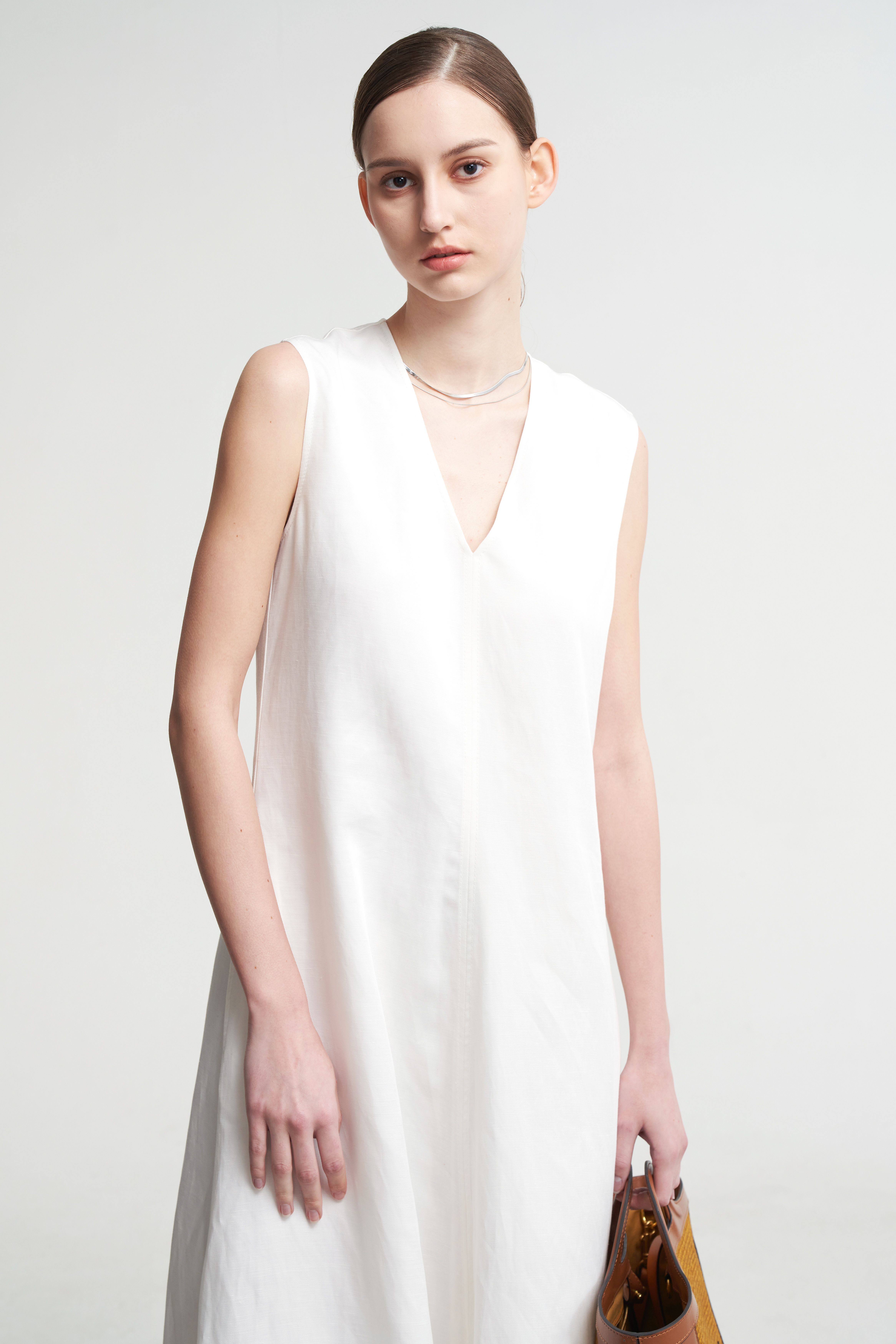 LIAC ROC2025款夏季亞麻V領無袖連衣裙女白色萊賽爾優雅長裙