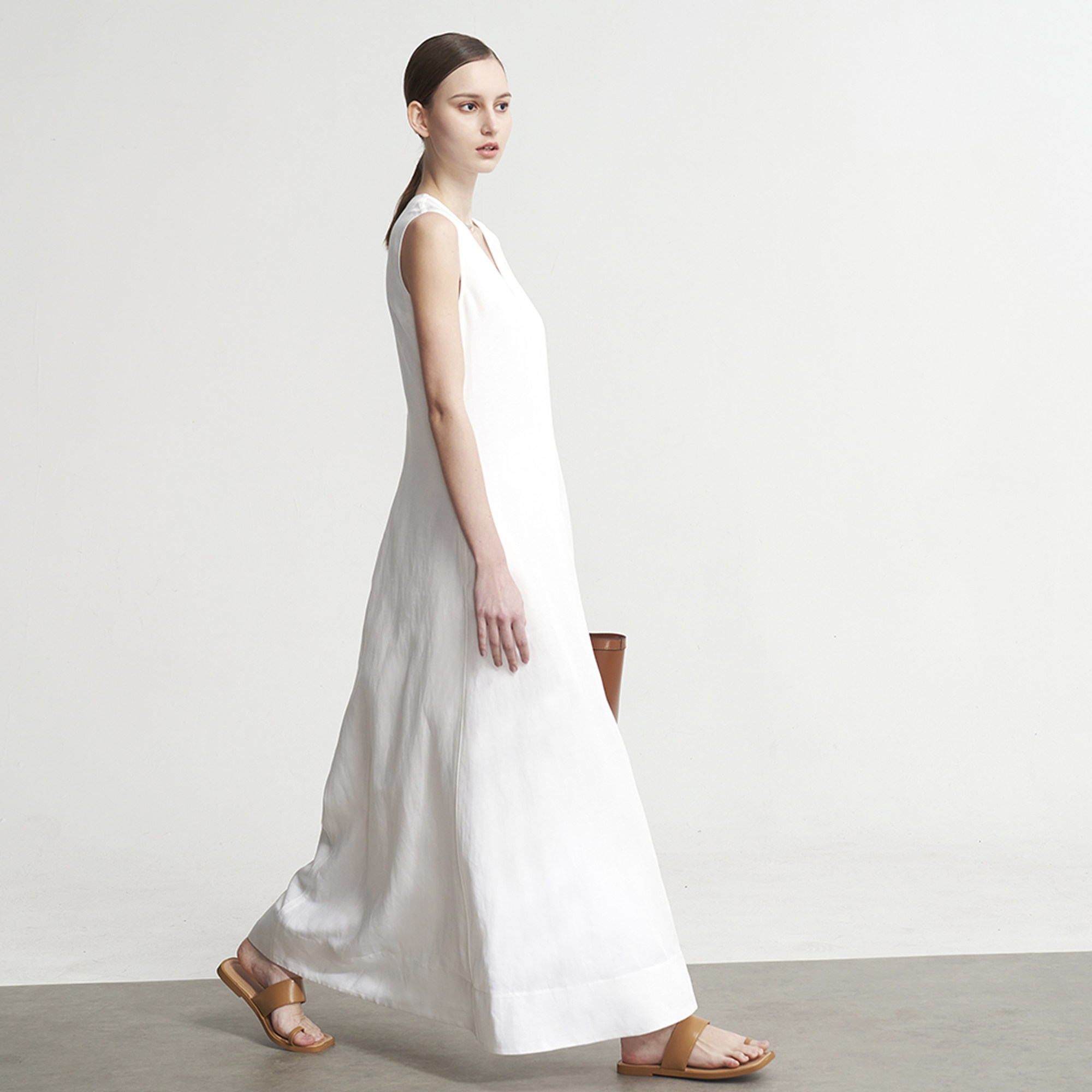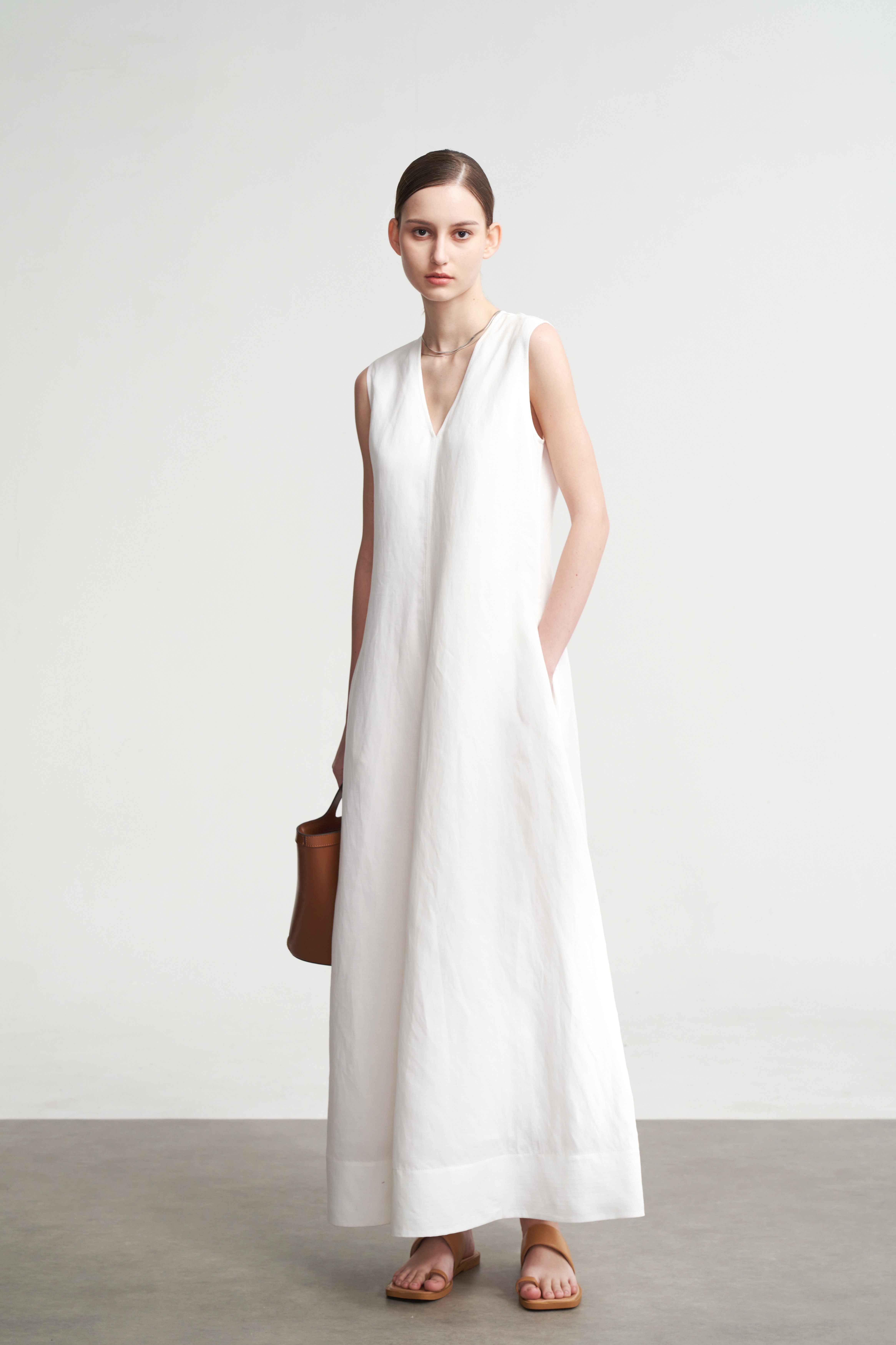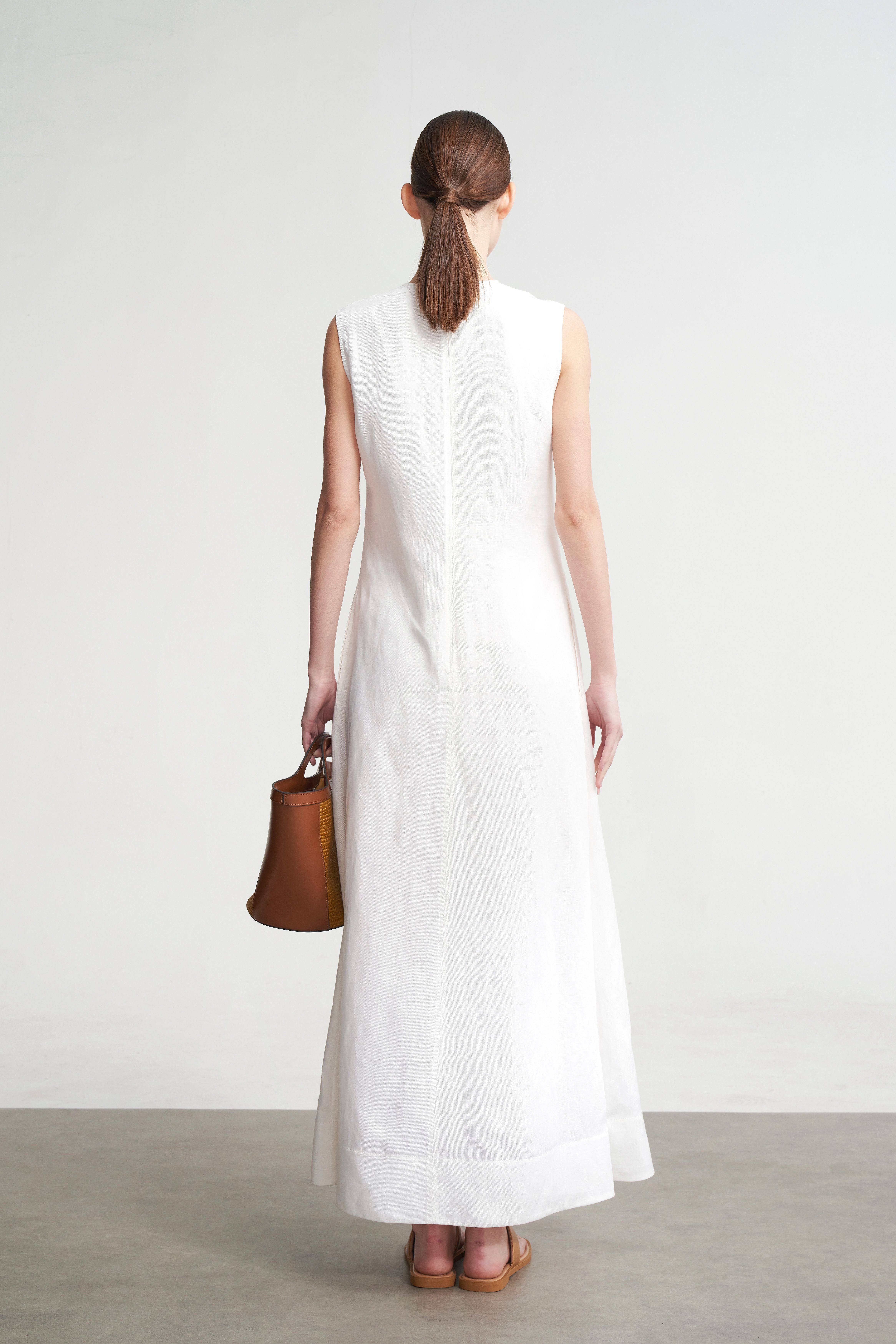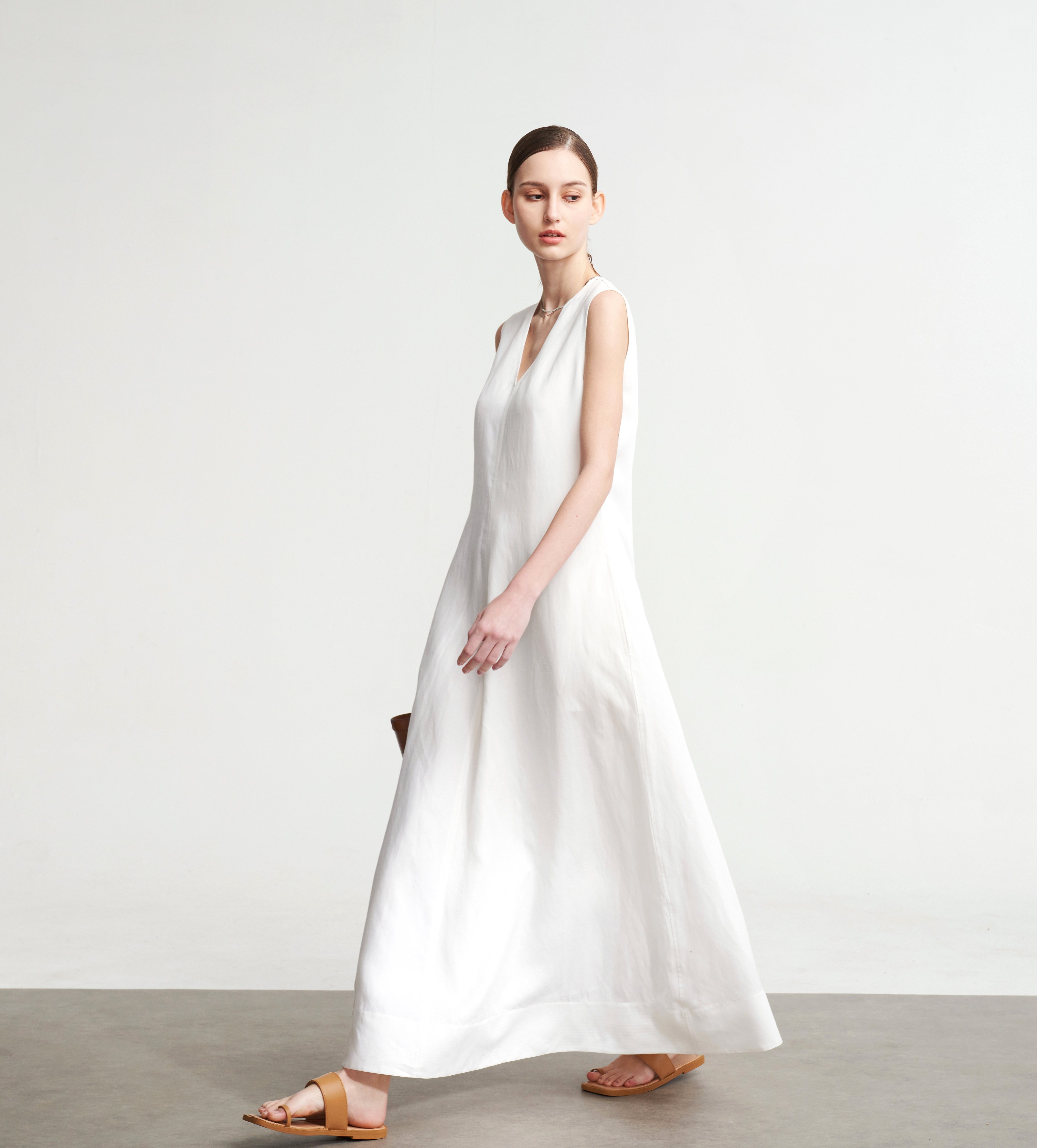 LIAC ROC2025款夏季亞麻V領無袖連衣裙女白色萊賽爾優雅長裙