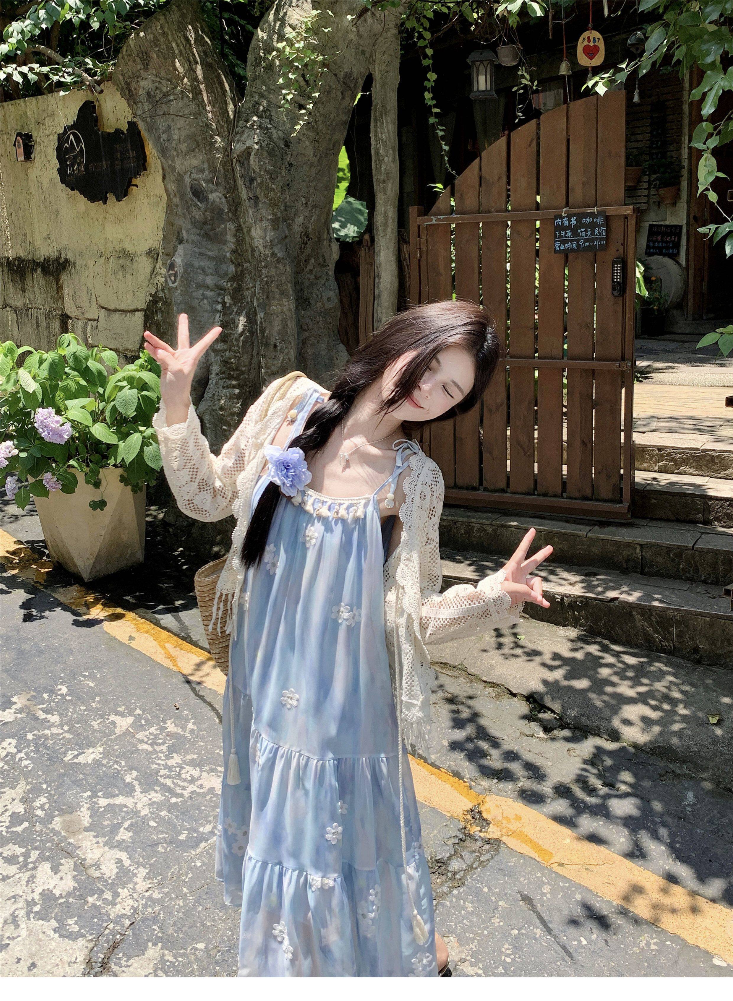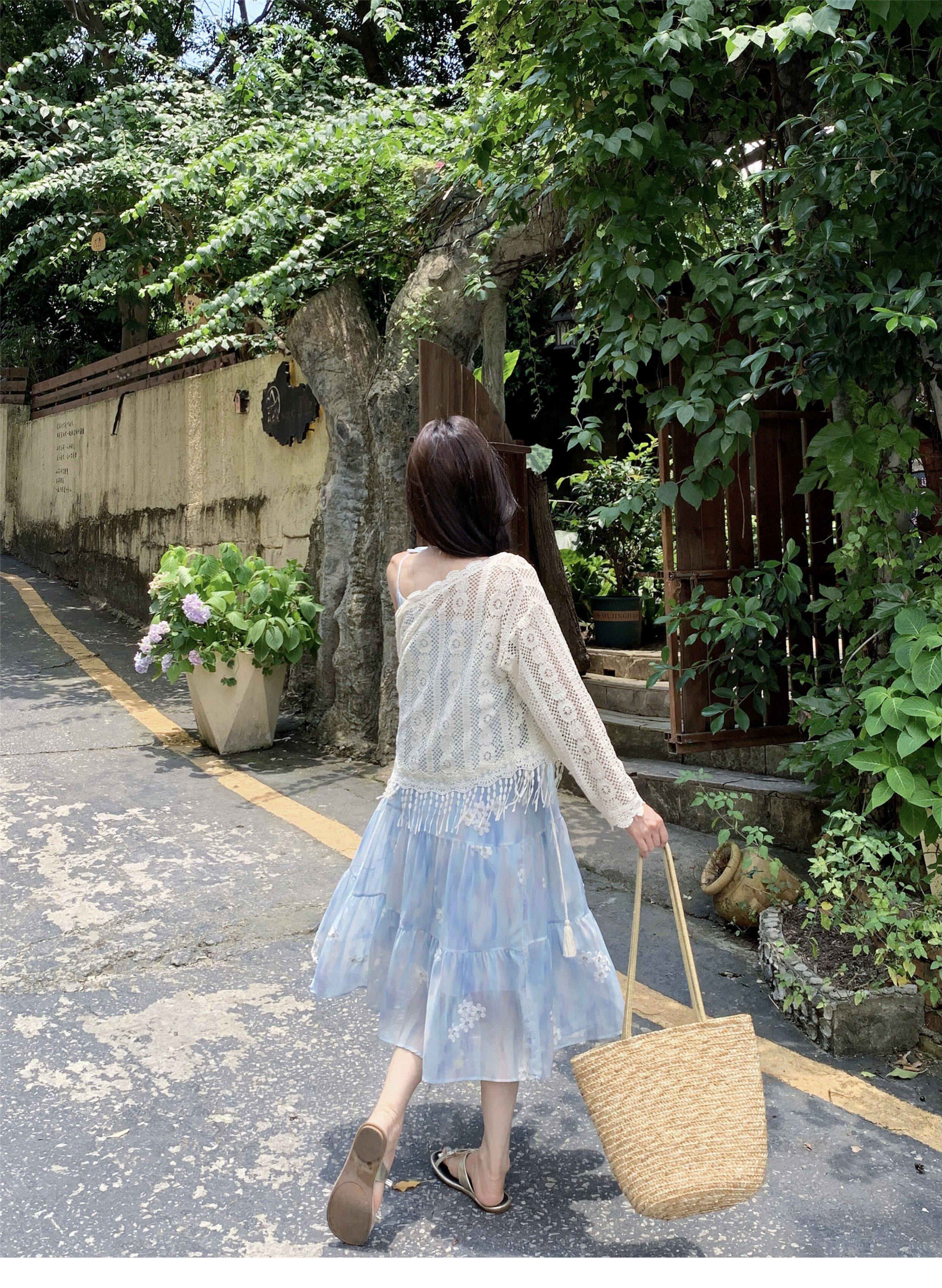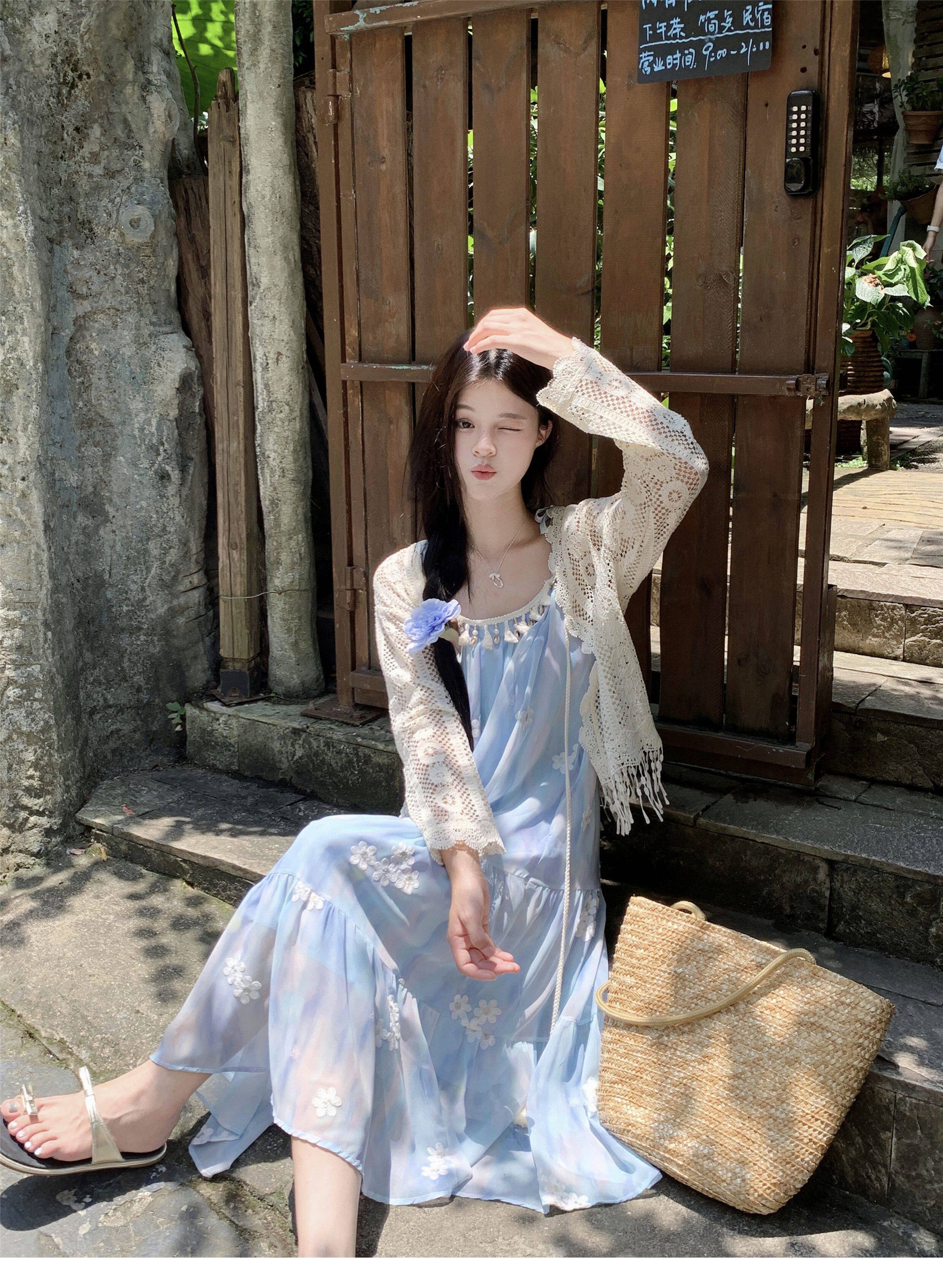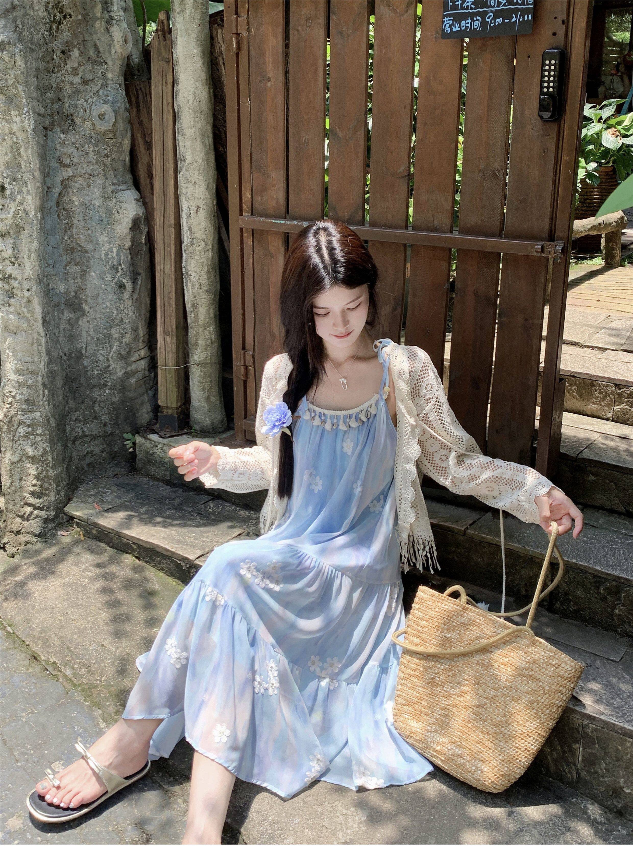 今年流行漂亮套裝裙度假風吊帶連衣裙兩件套流蘇鏤空長裙吊帶裙