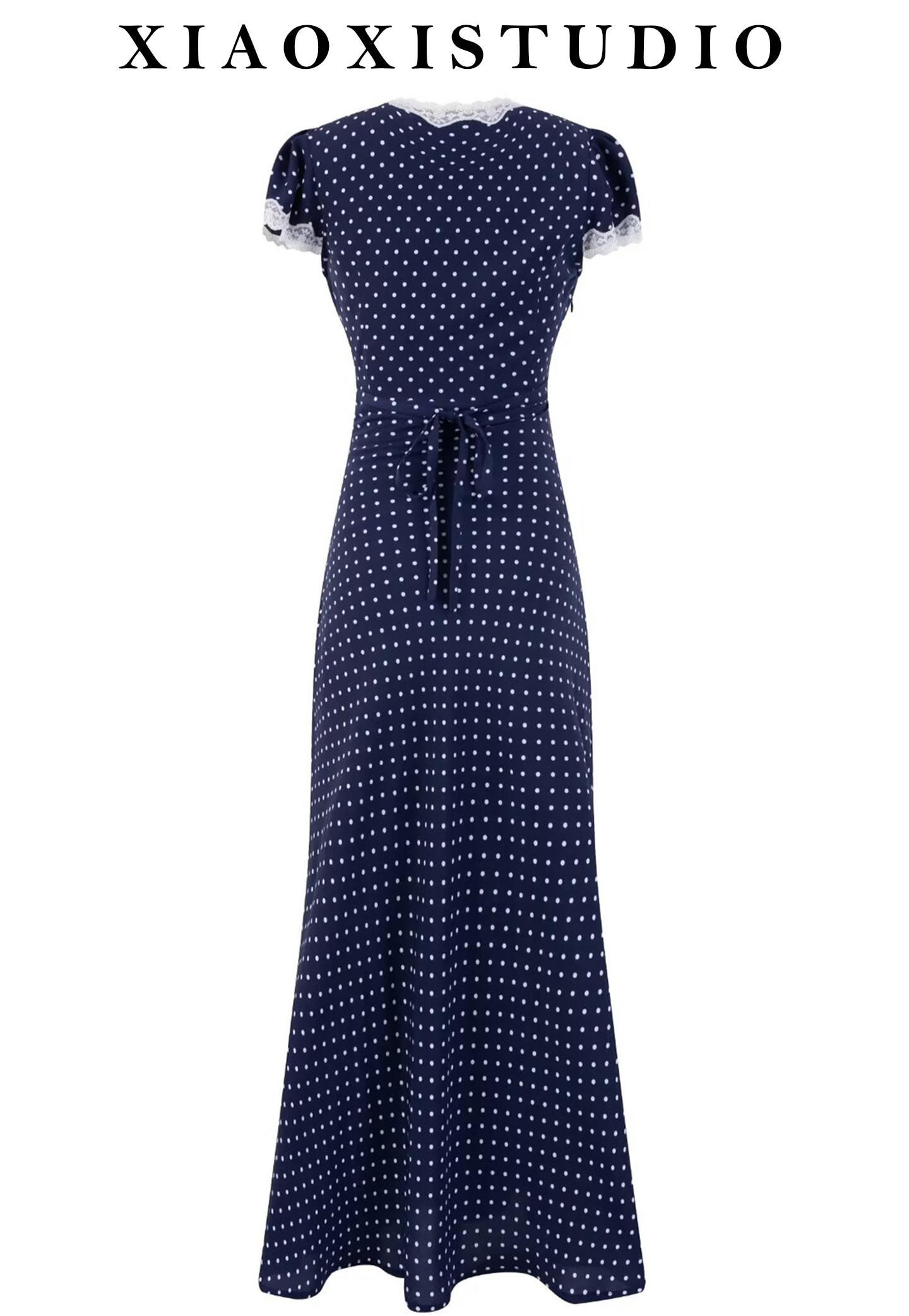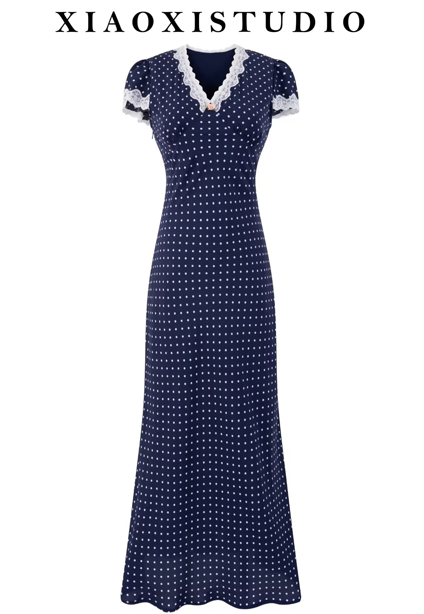 小夕自製 2025夏季新款女裝藍色波點法式V領復古氣質長款連衣裙女