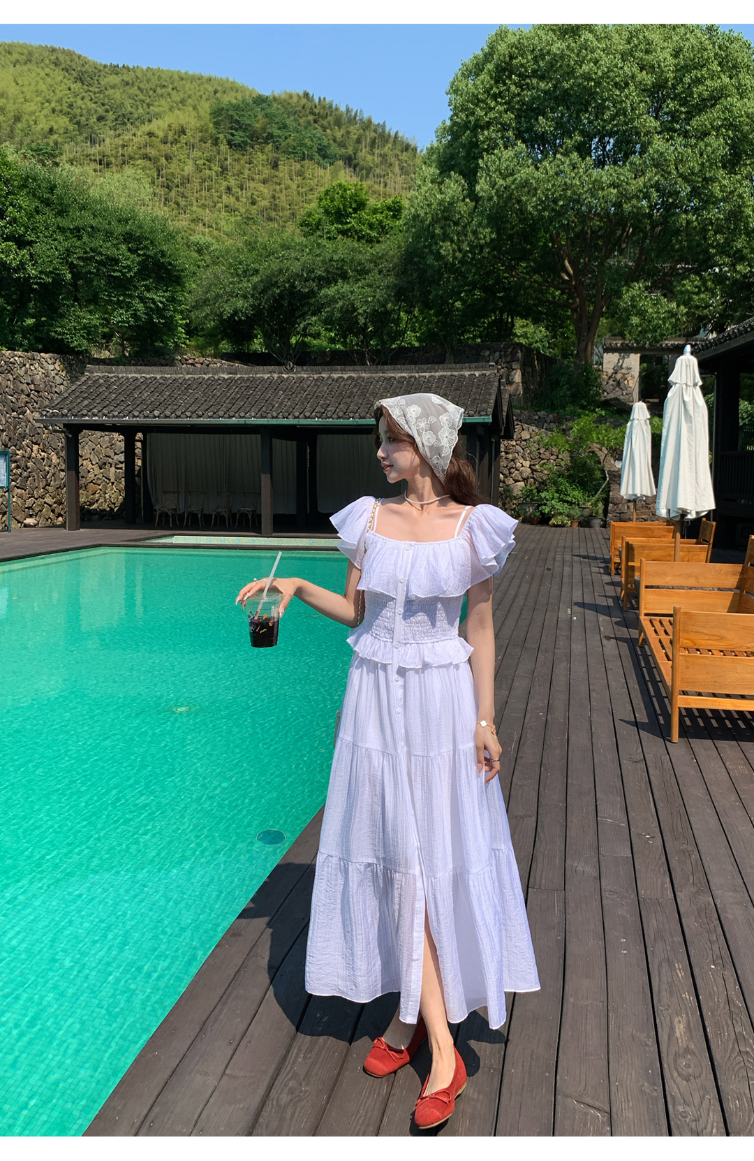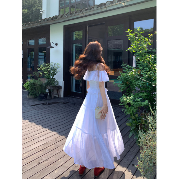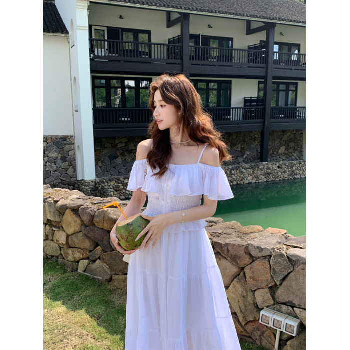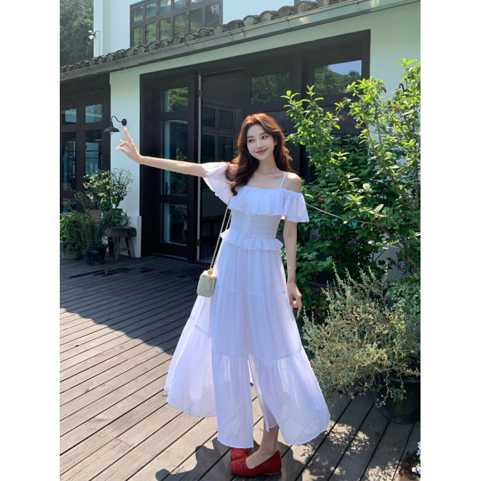 夏季法式兩穿一字肩天絲打攬松緊腰吊帶連衣裙女中長款a字度假裙