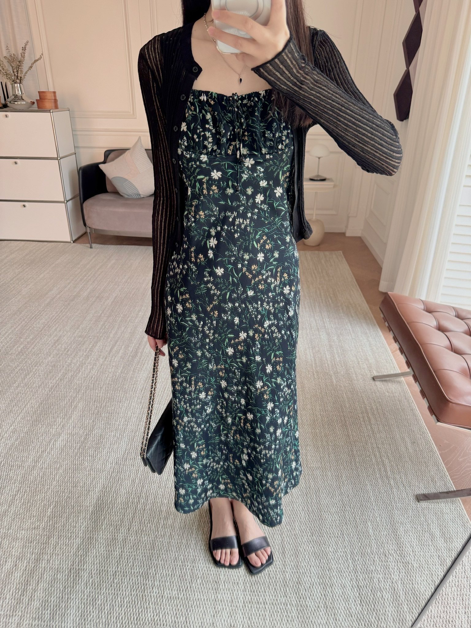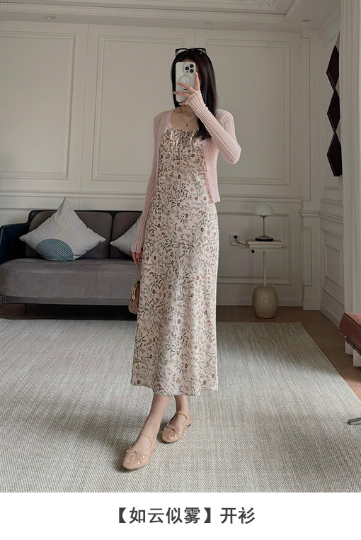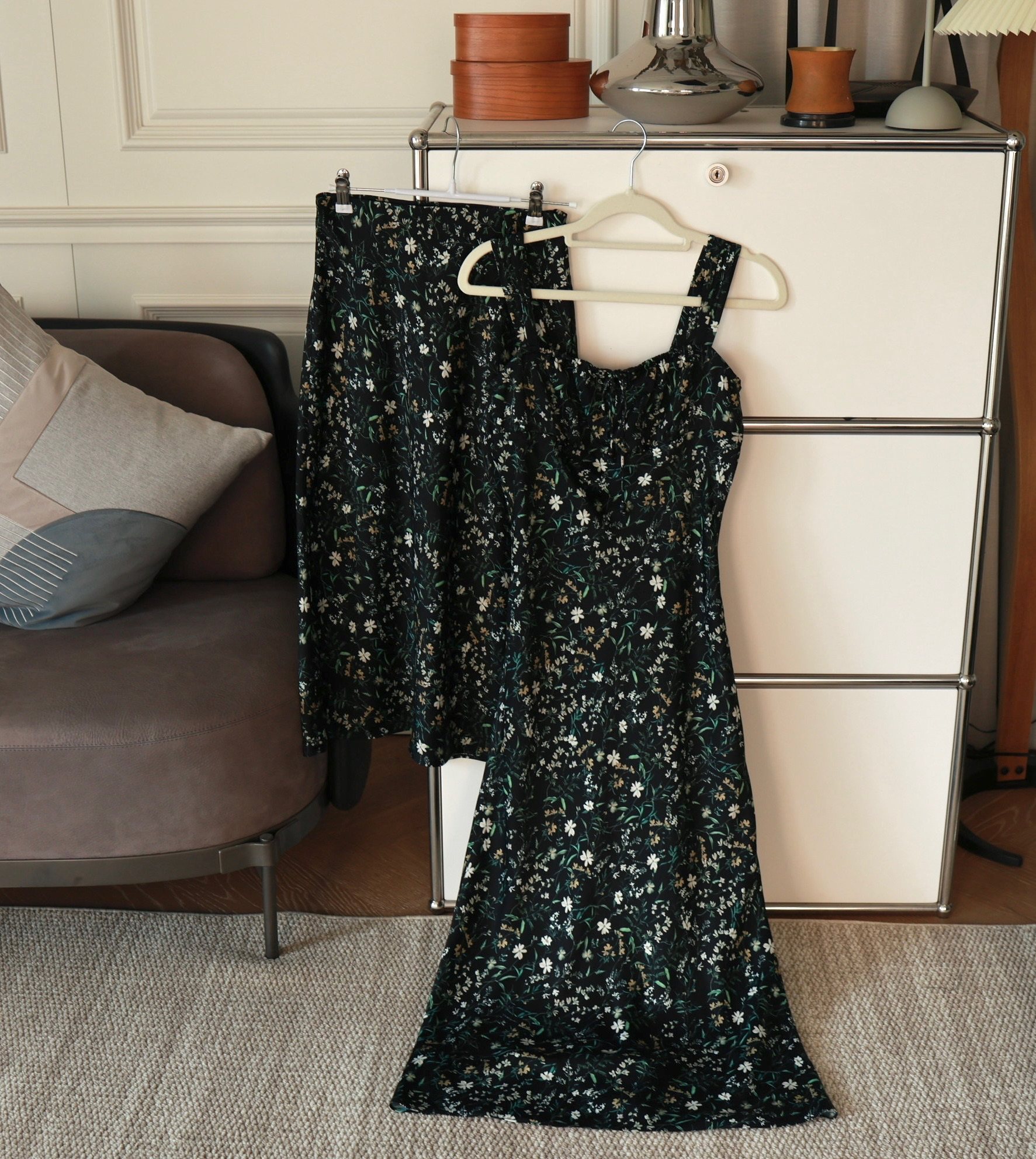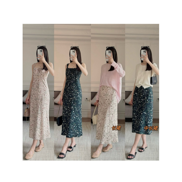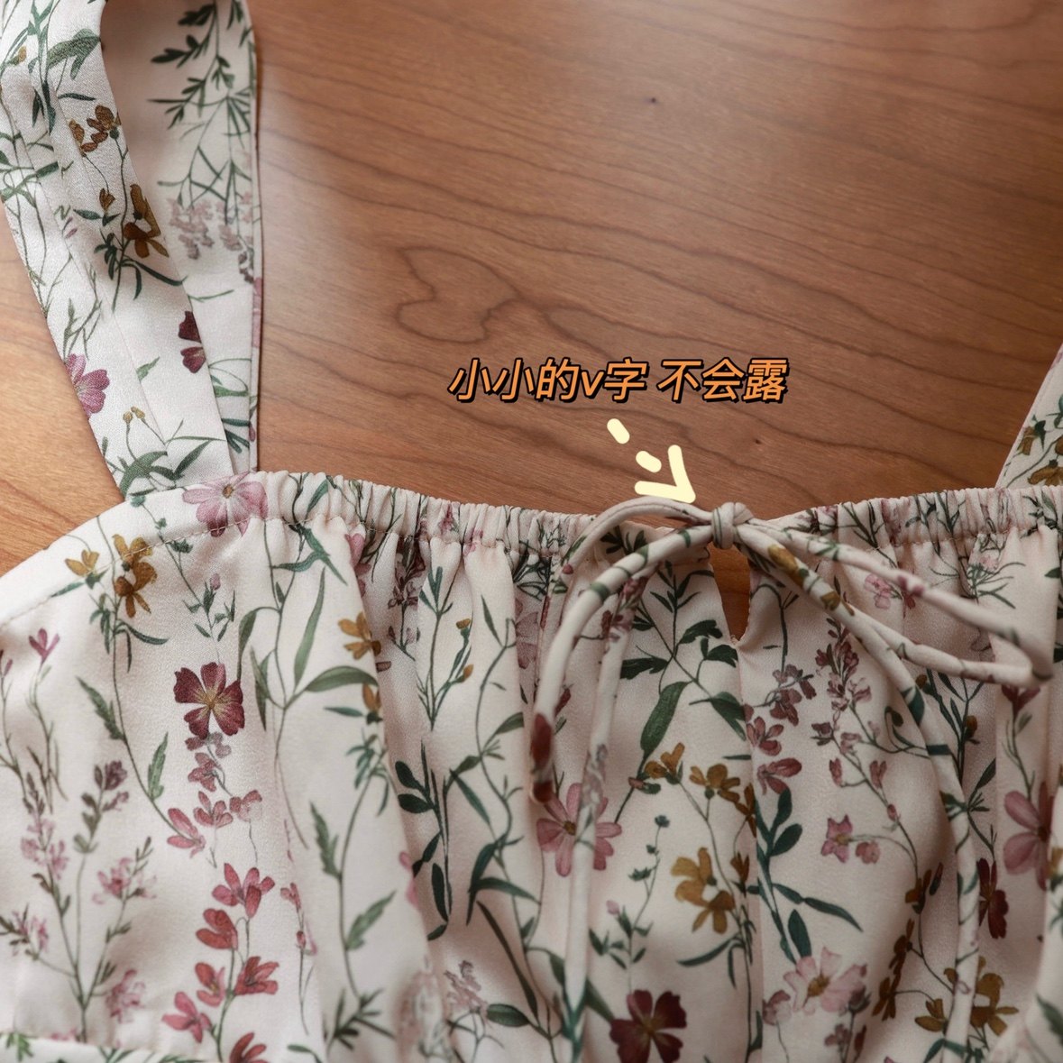 跳轉新店拍南法少女清新手繪碎花吊帶方領連衣裙+高腰A字魚尾半裙