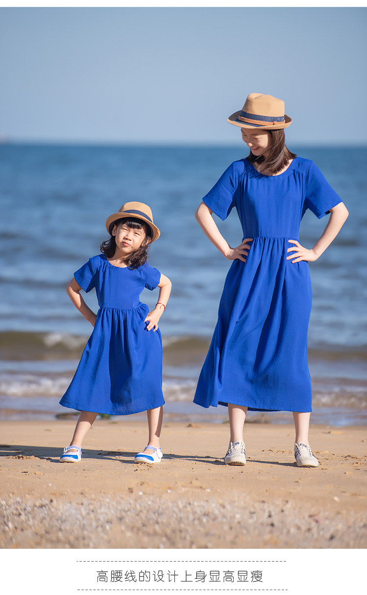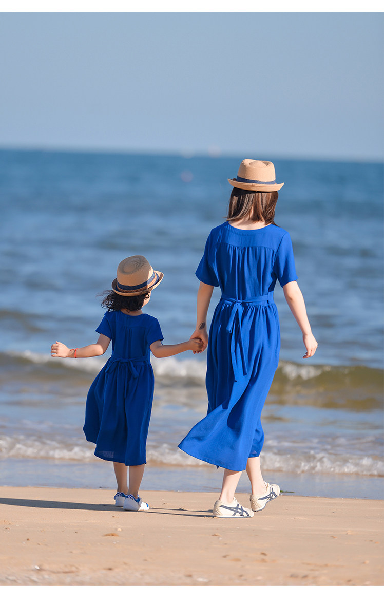 小樂往原創親子裝124課 夏寶藍色文藝母女裝海邊度假拍照連衣裙