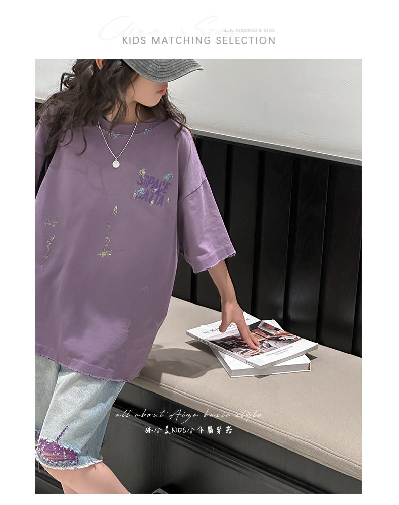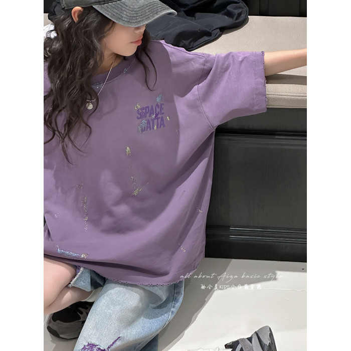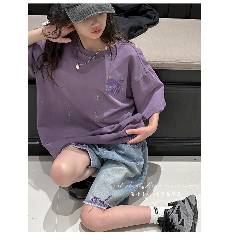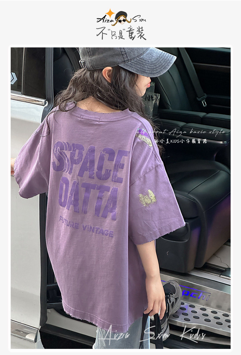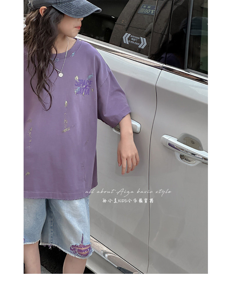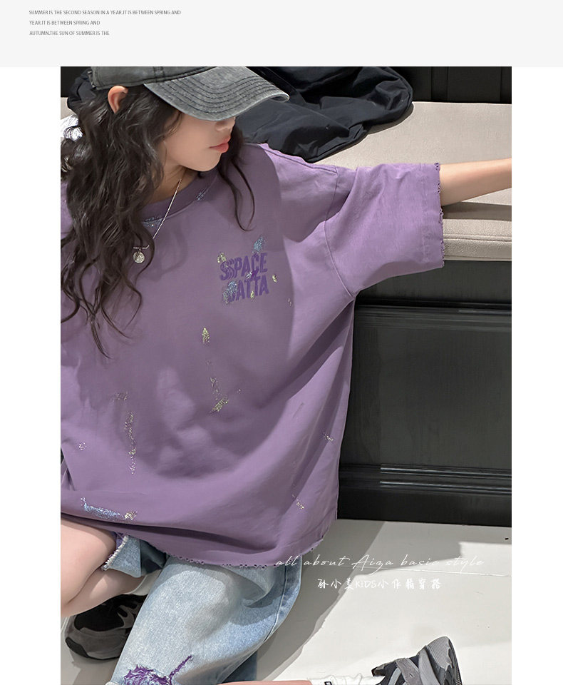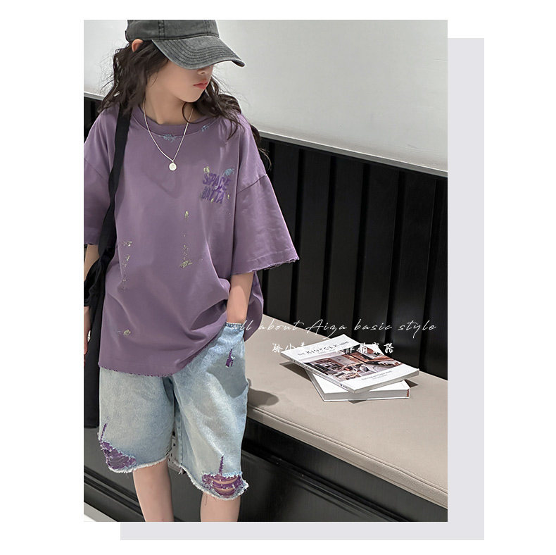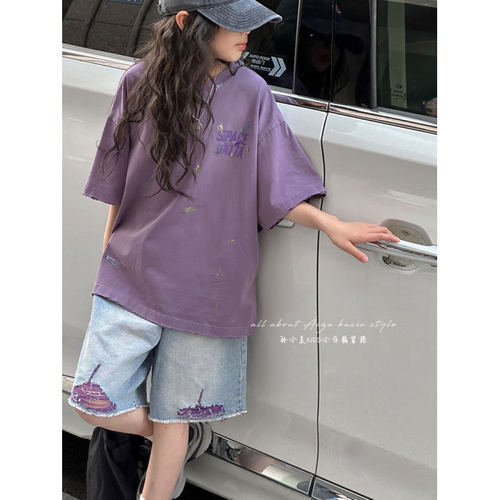 彩銀設計女童夏季短袖T恤2025新款兒童上衣女大童做舊半袖洋氣薄t