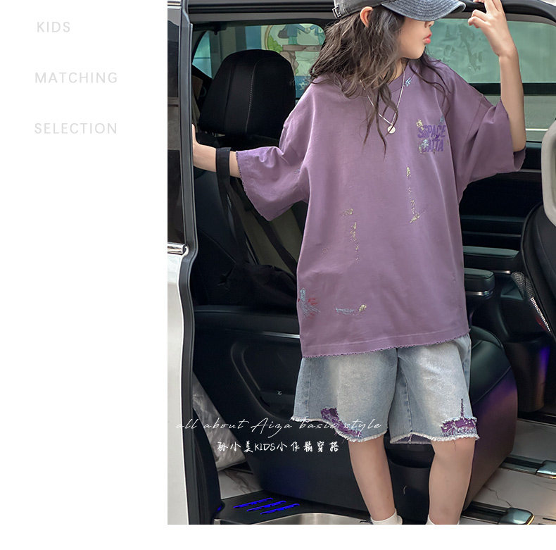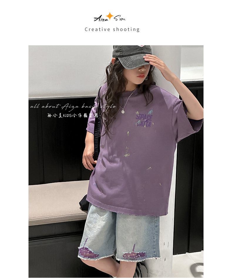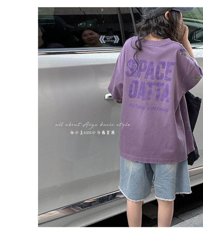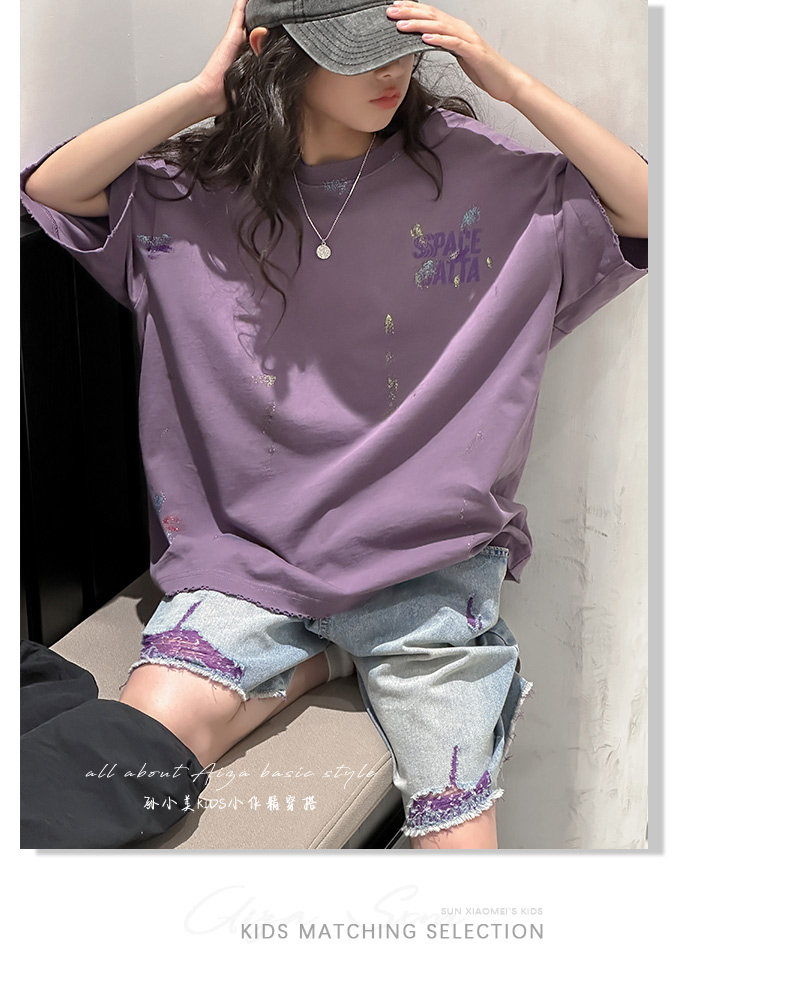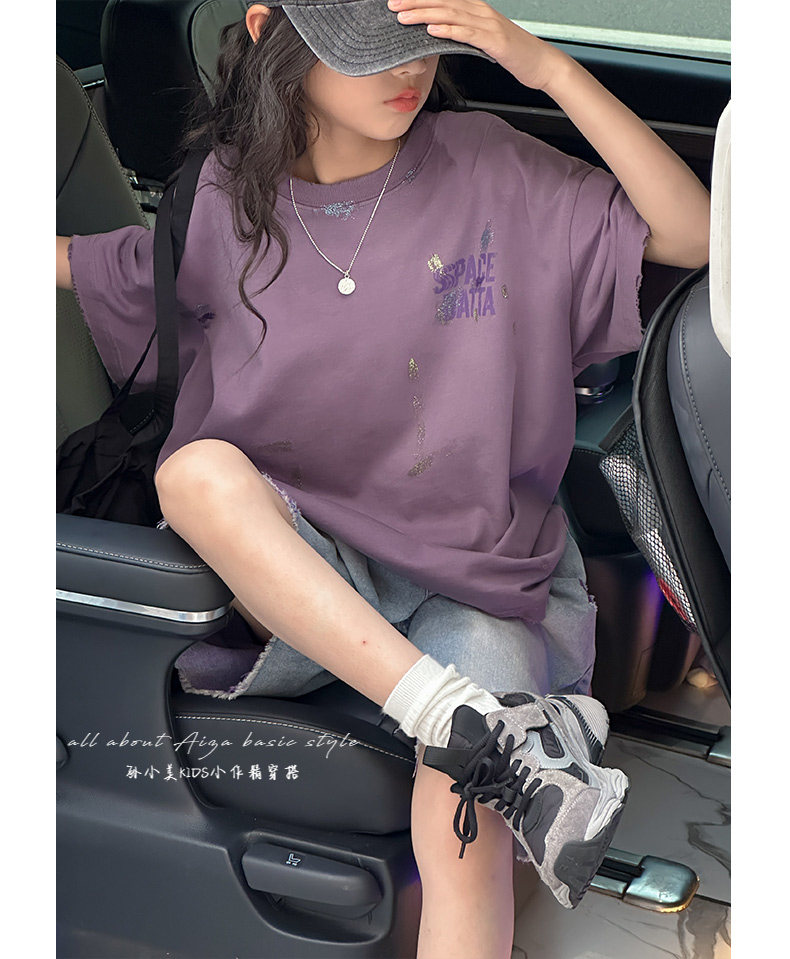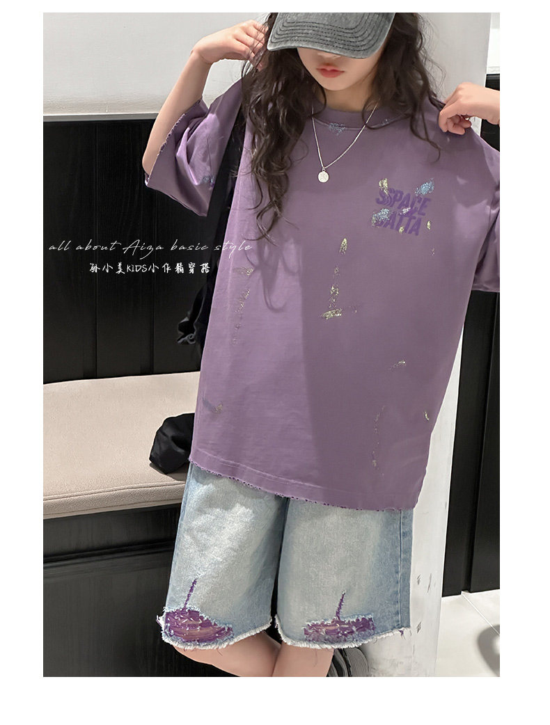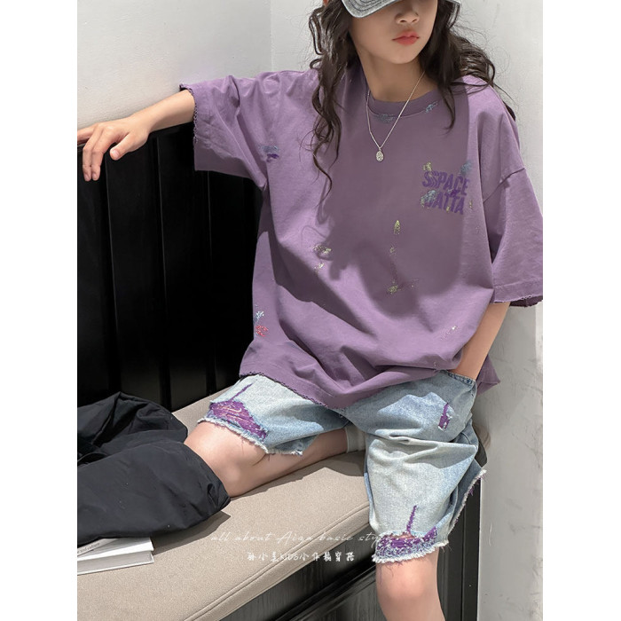 彩銀設計女童夏季短袖T恤2025新款兒童上衣女大童做舊半袖洋氣薄t