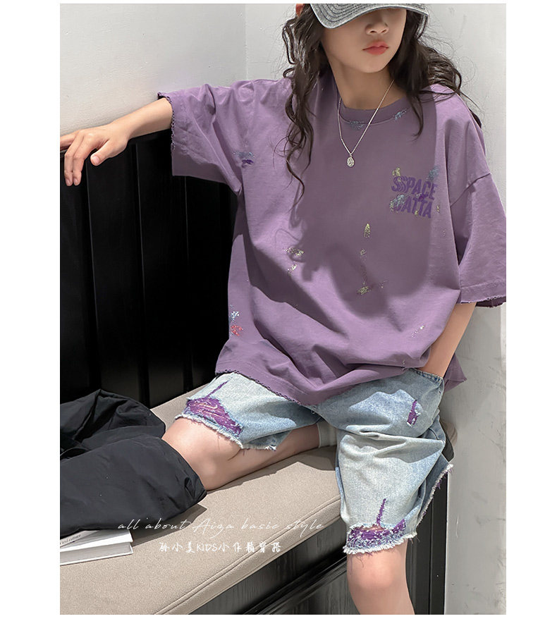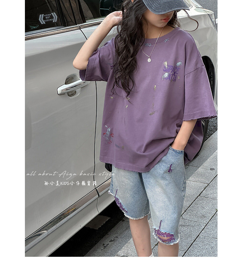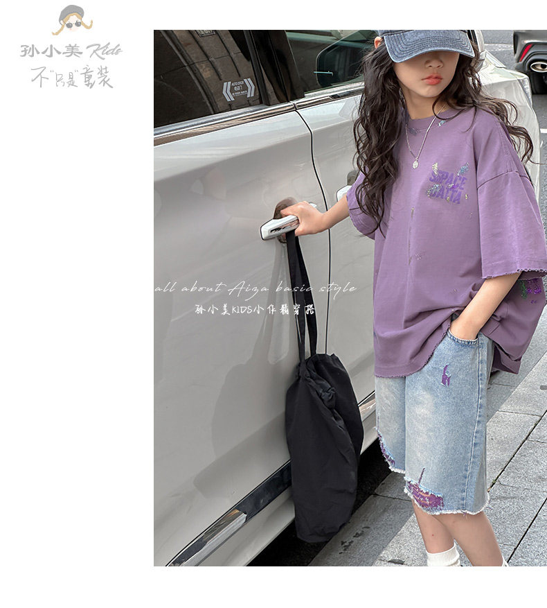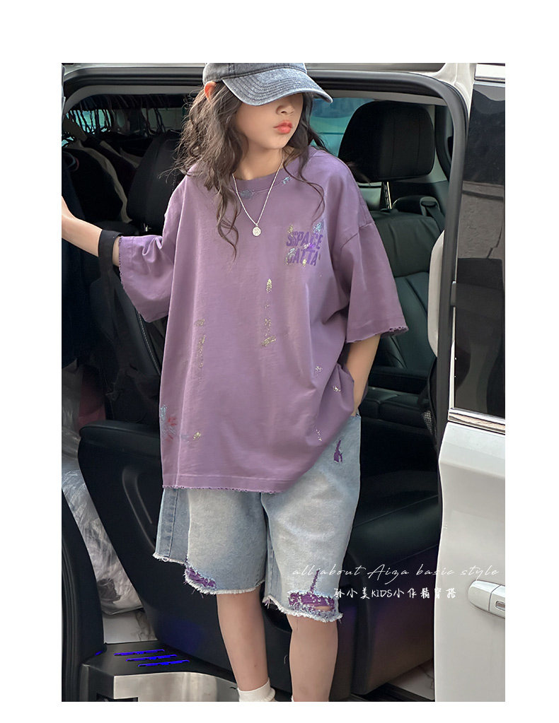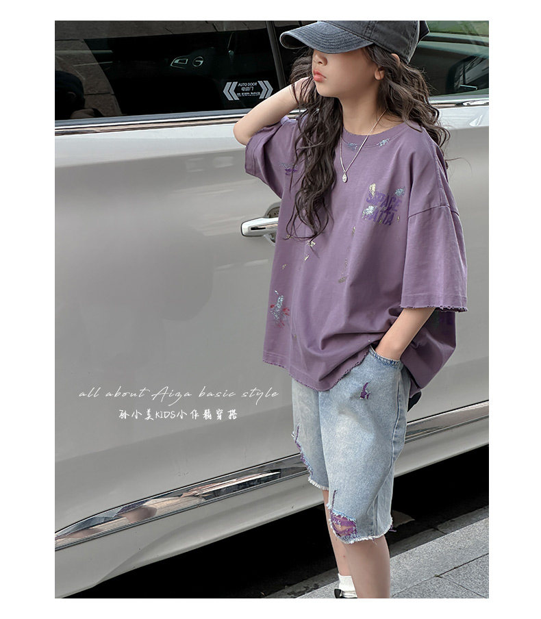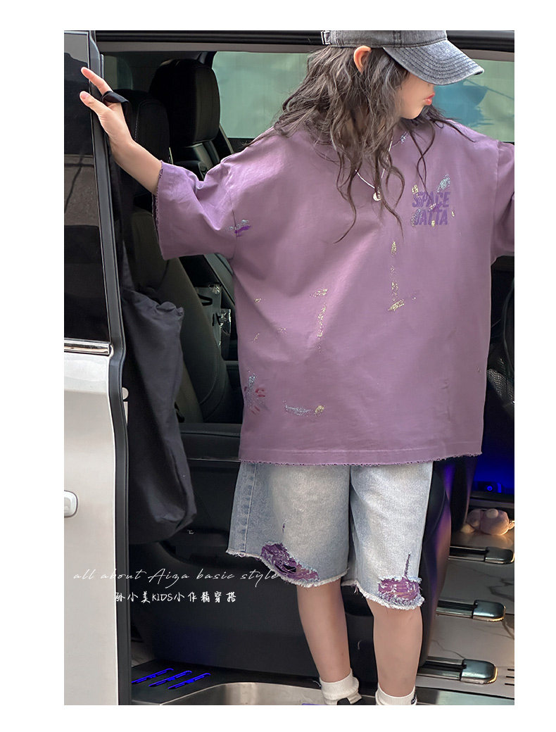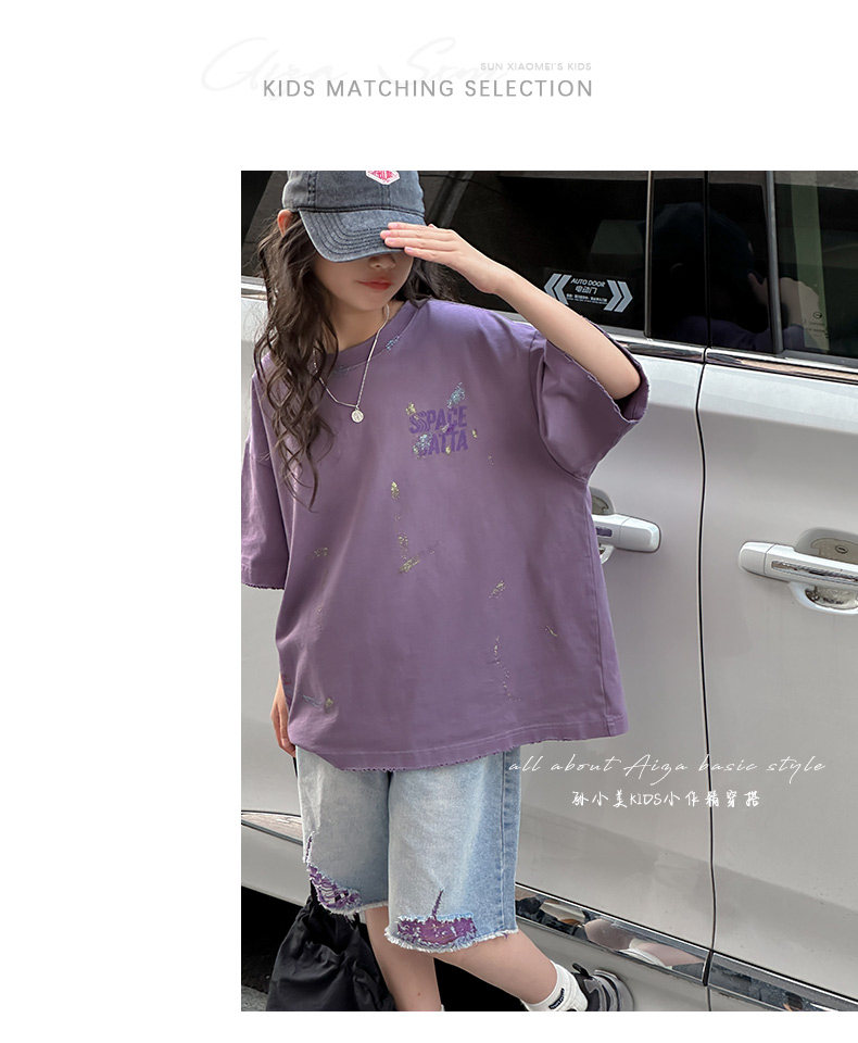 彩銀設計女童夏季短袖T恤2025新款兒童上衣女大童做舊半袖洋氣薄t