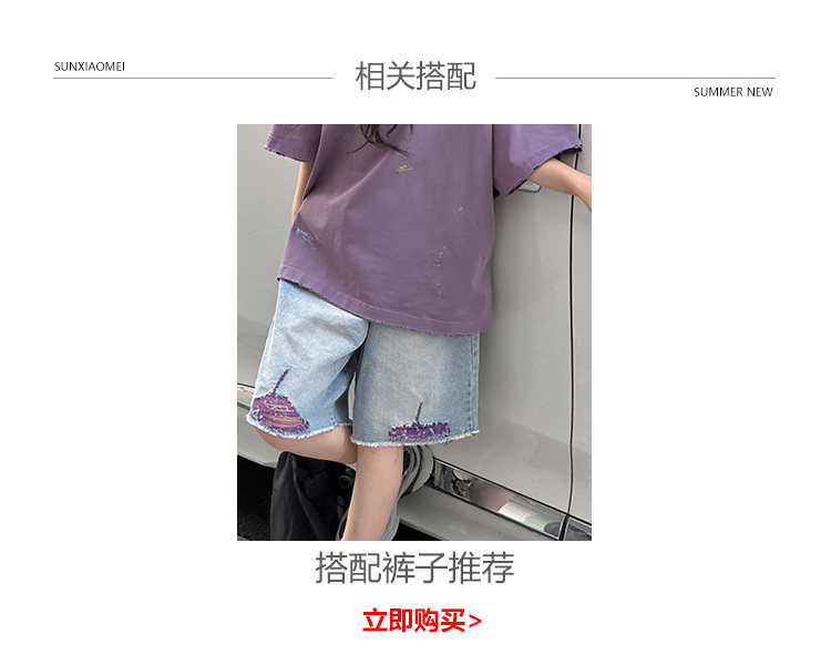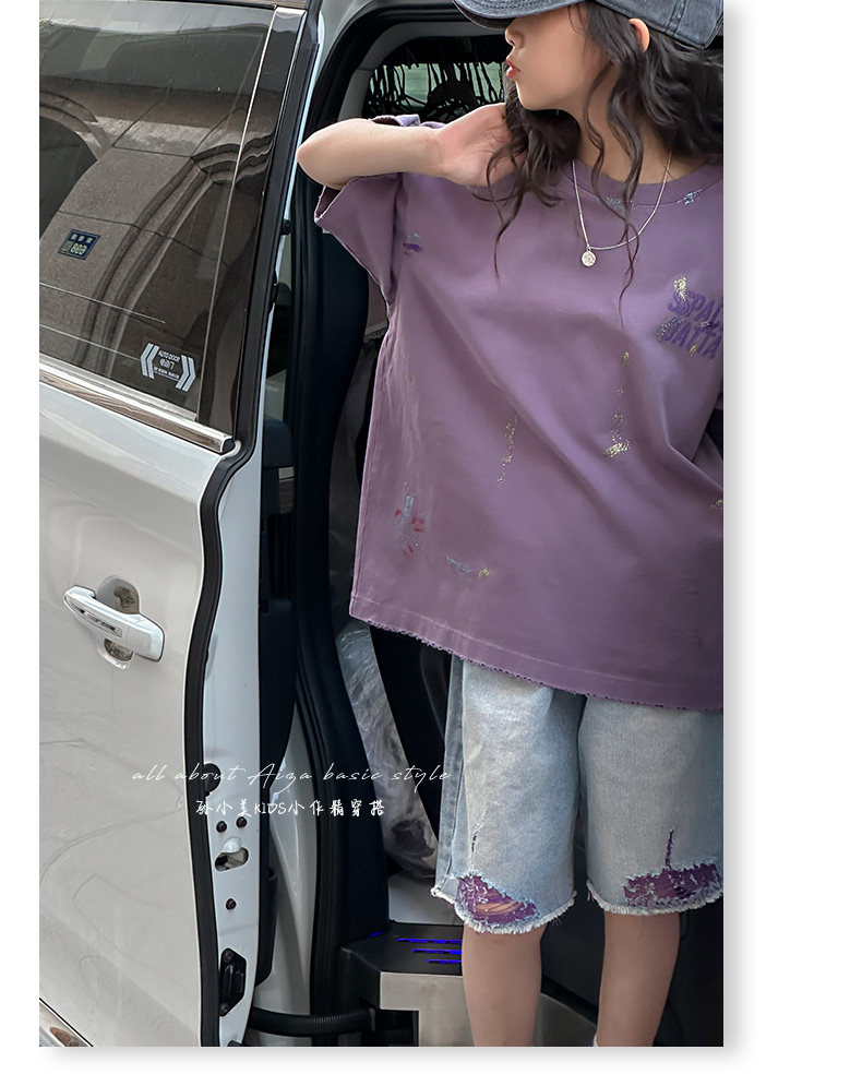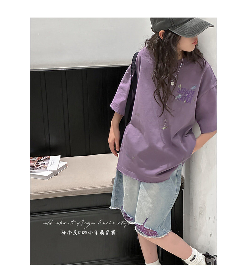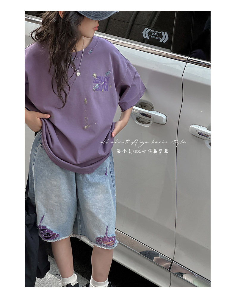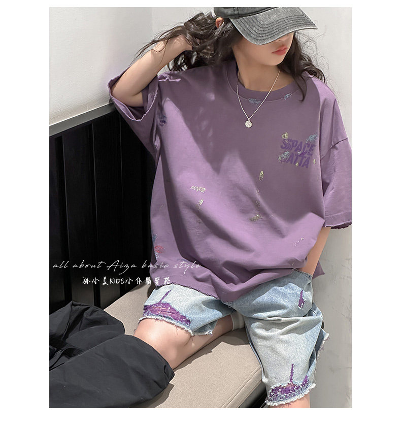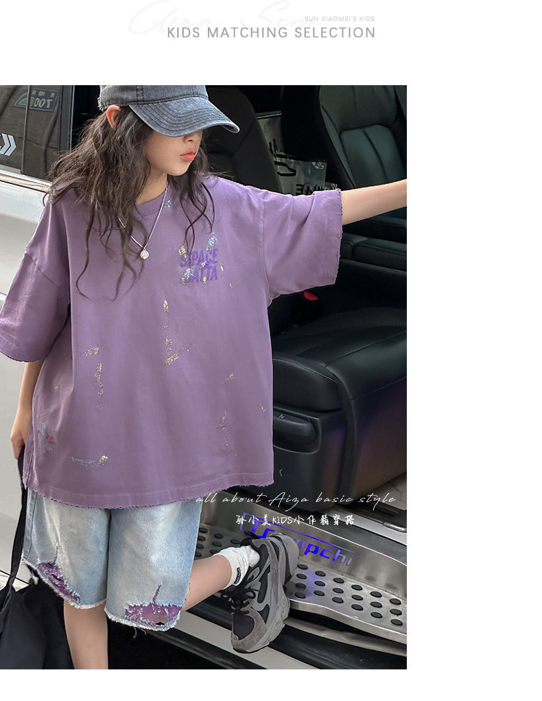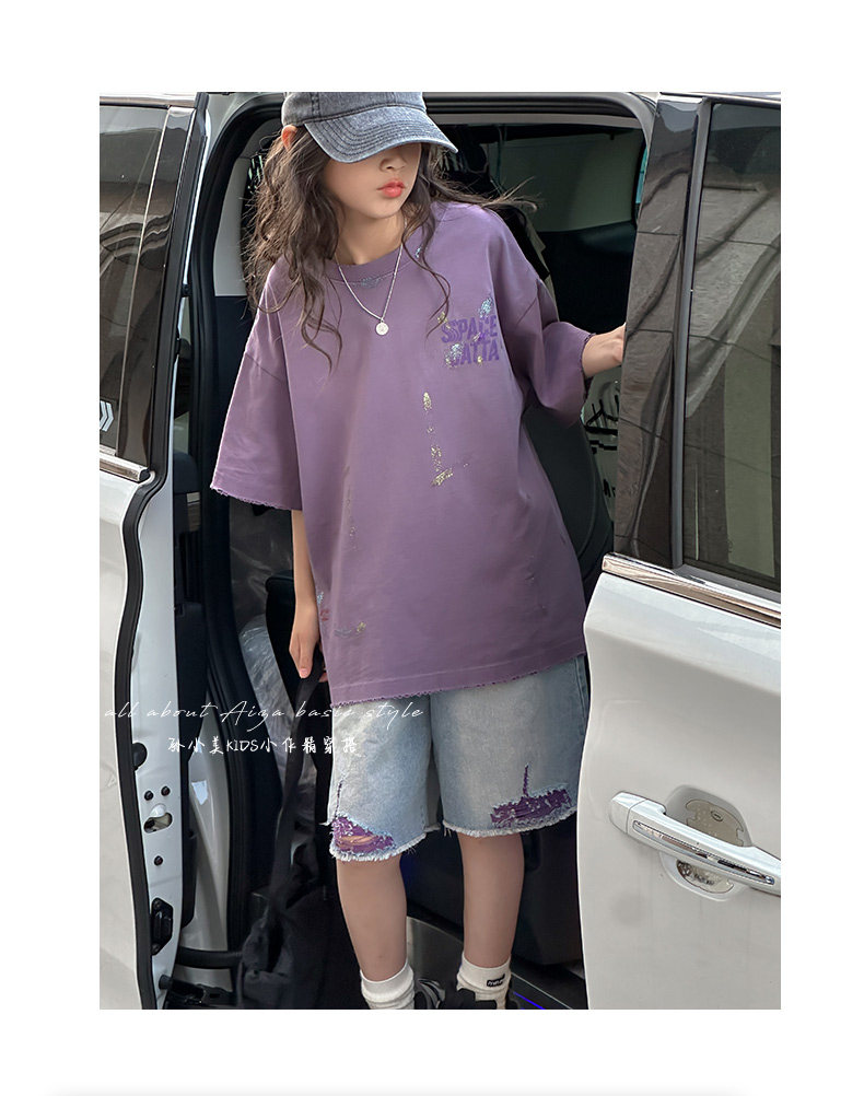 彩銀設計女童夏季短袖T恤2025新款兒童上衣女大童做舊半袖洋氣薄t