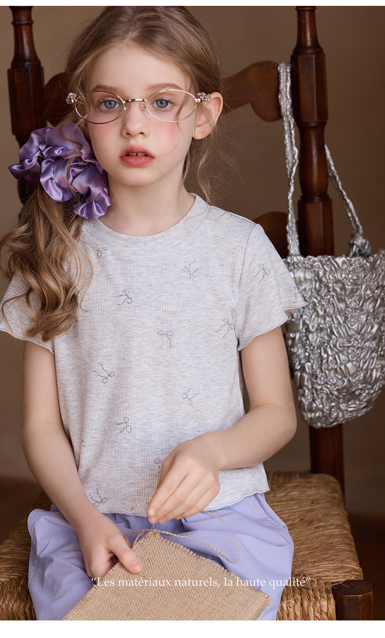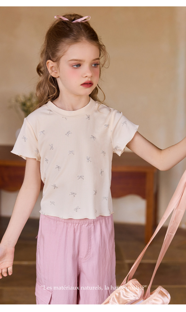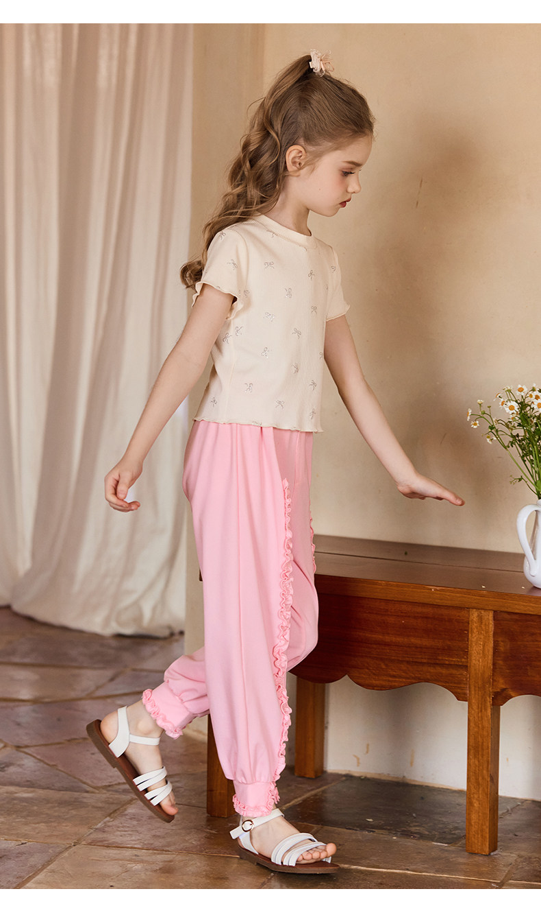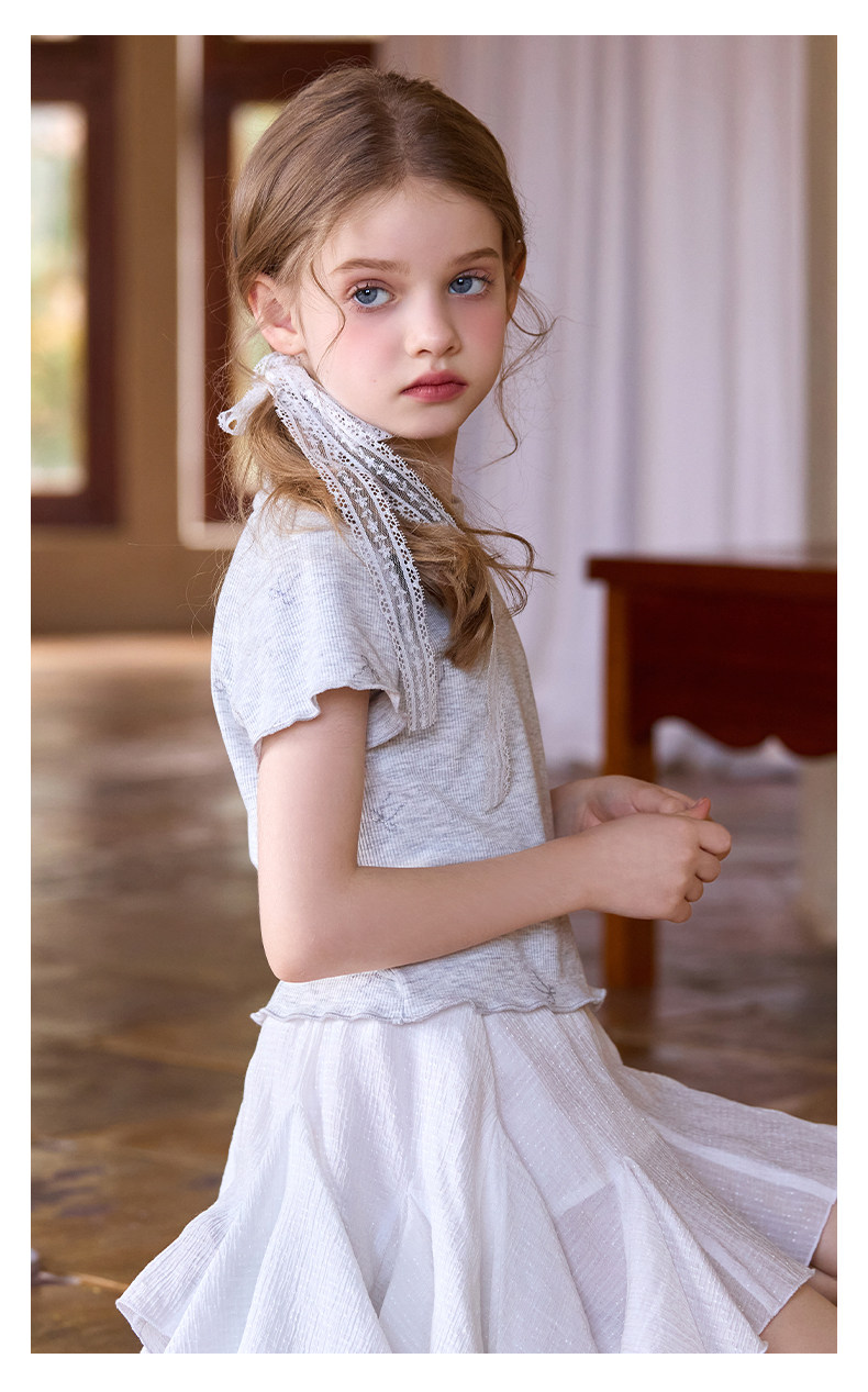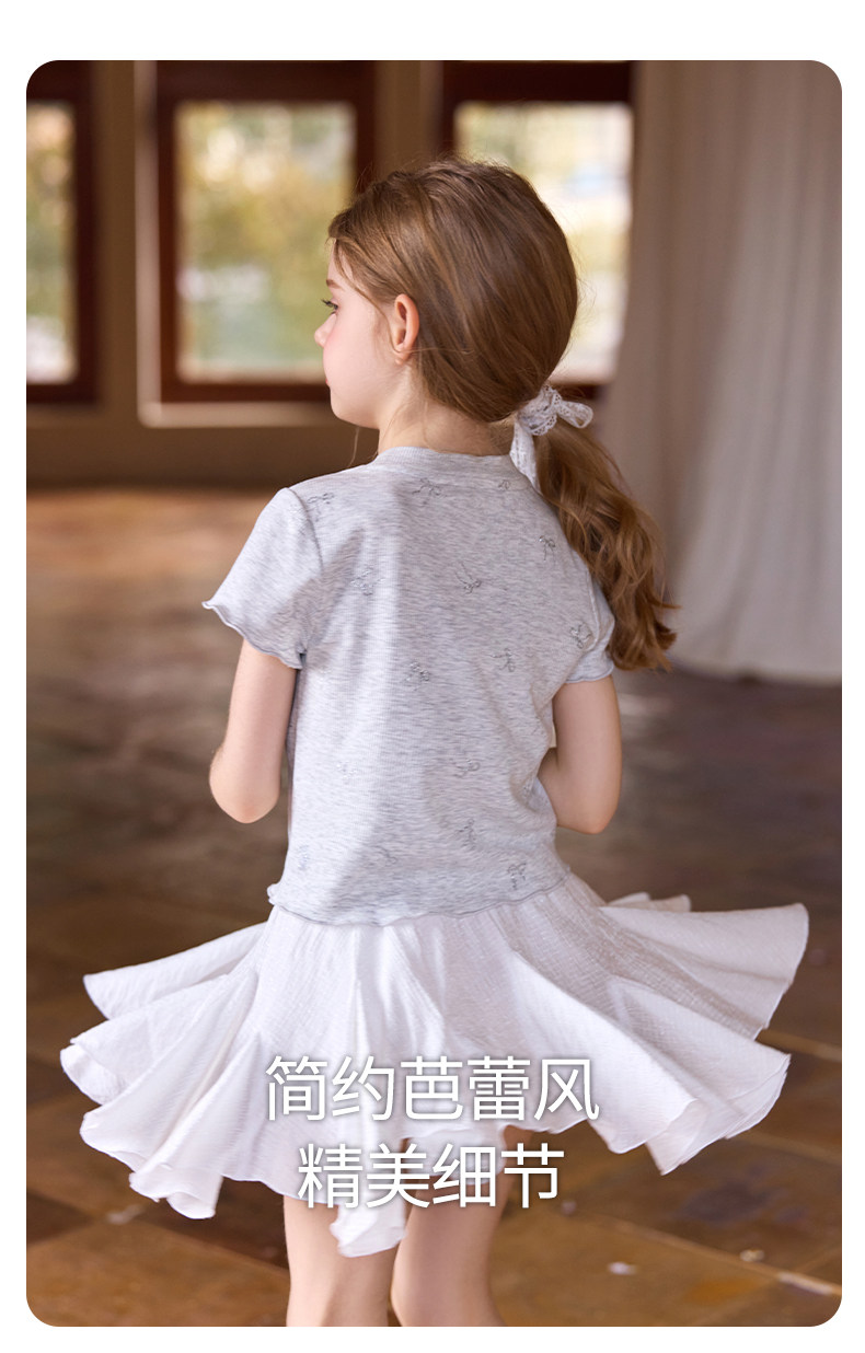 Little Naive女童T恤夏季新款甜美芭蕾風閃閃上衣兒童木耳邊短袖