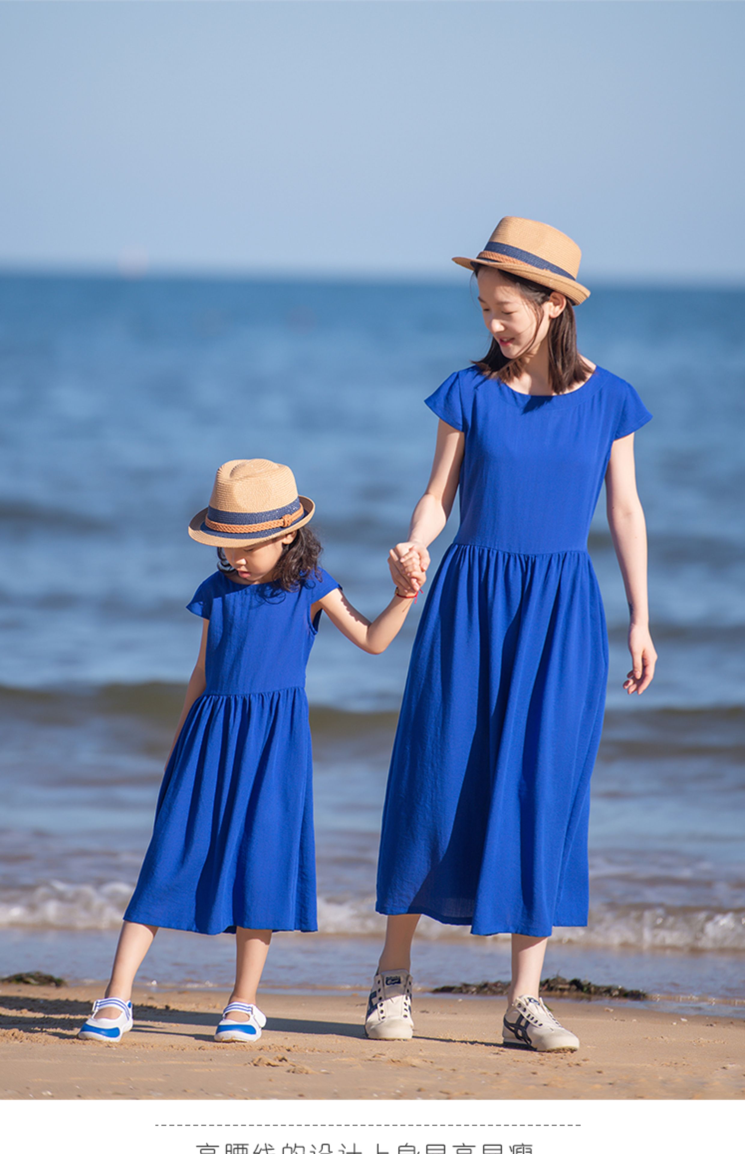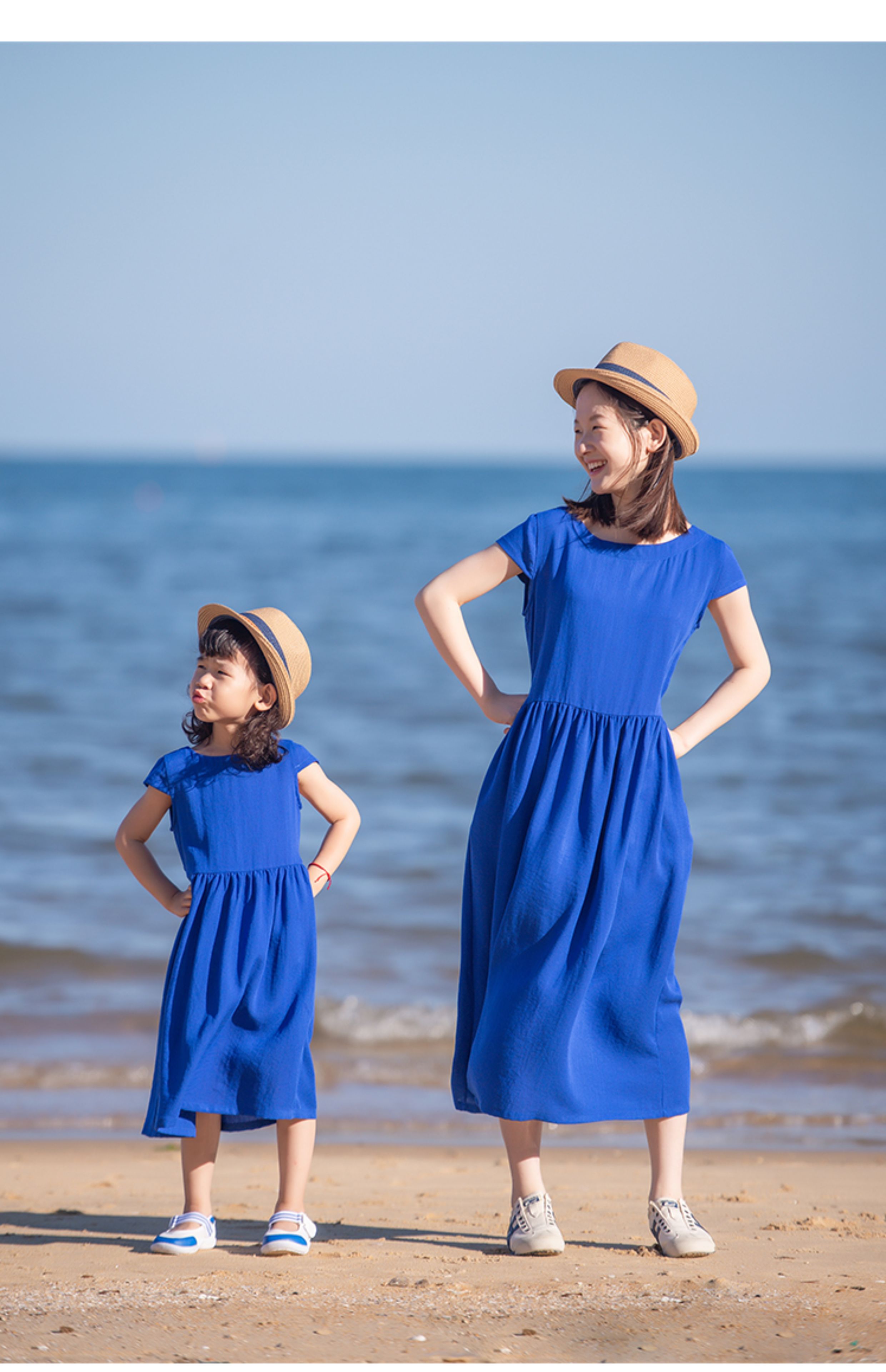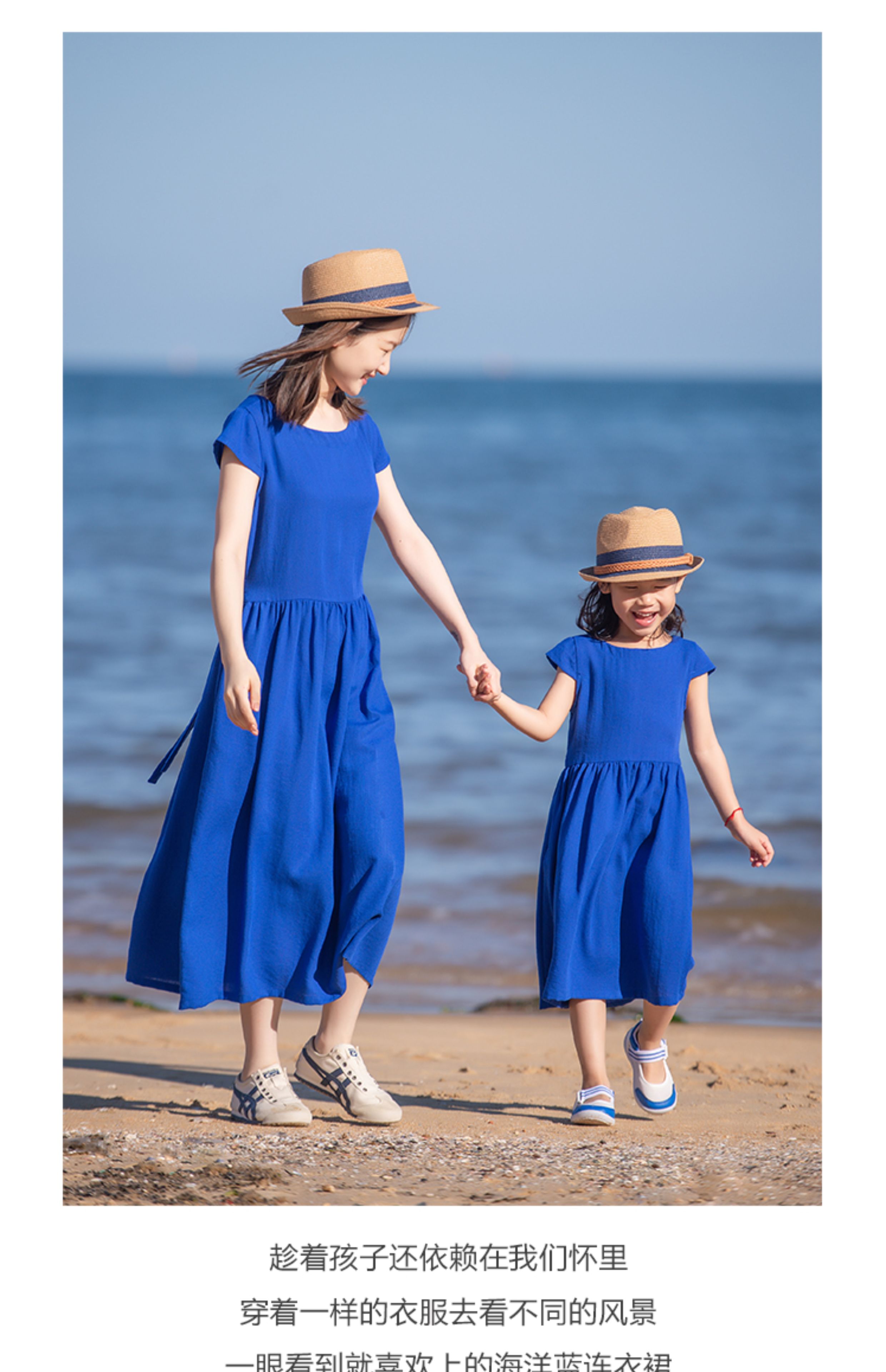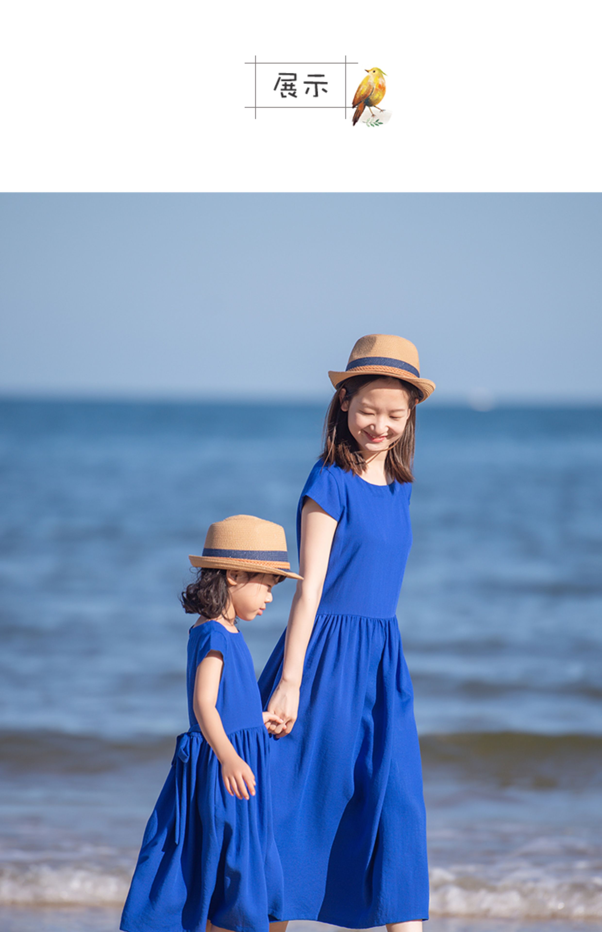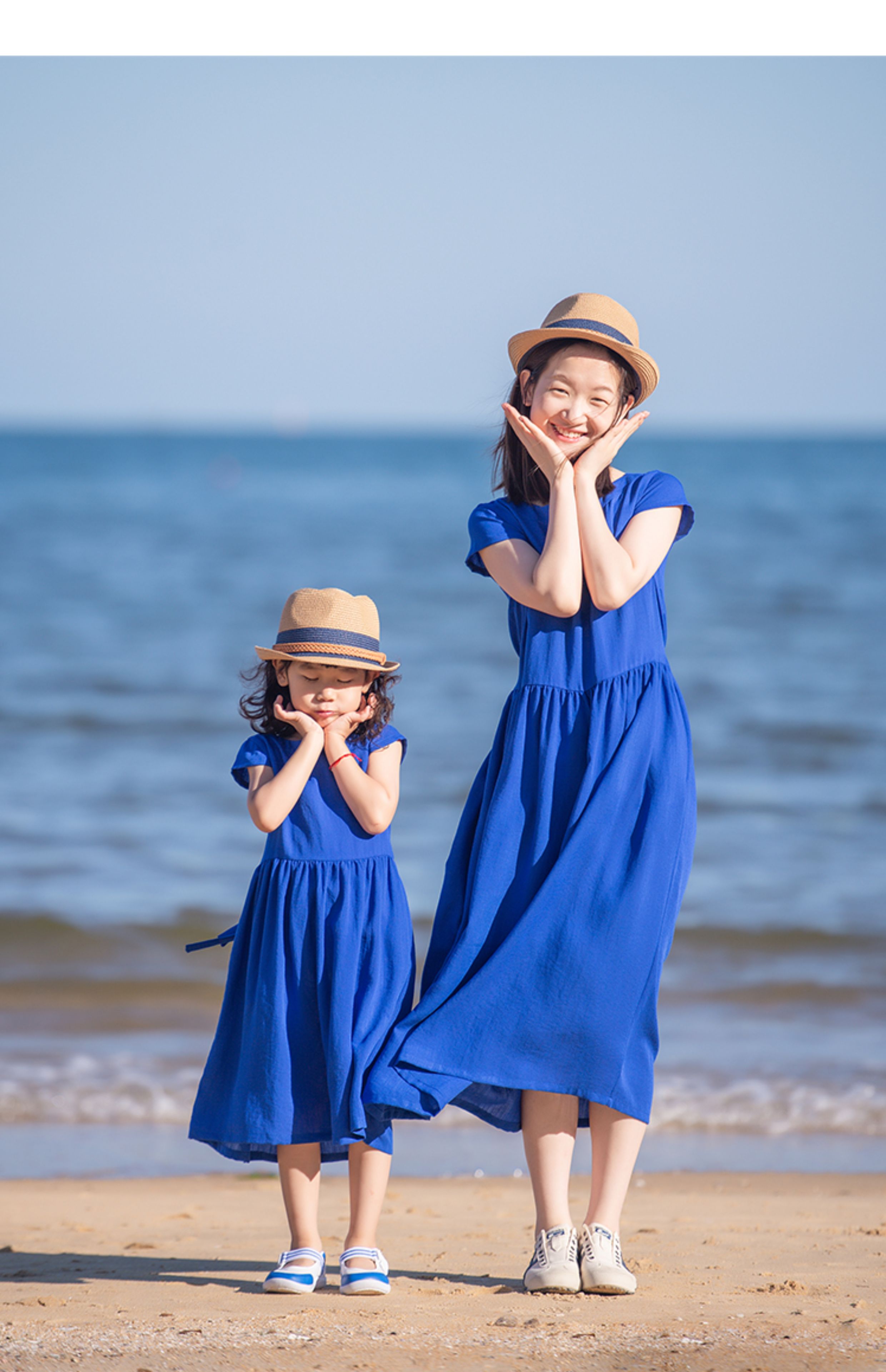 小樂往親子裝125 夏小清新女童姐妹藍色連衣裙母女裝度假海邊拍照
