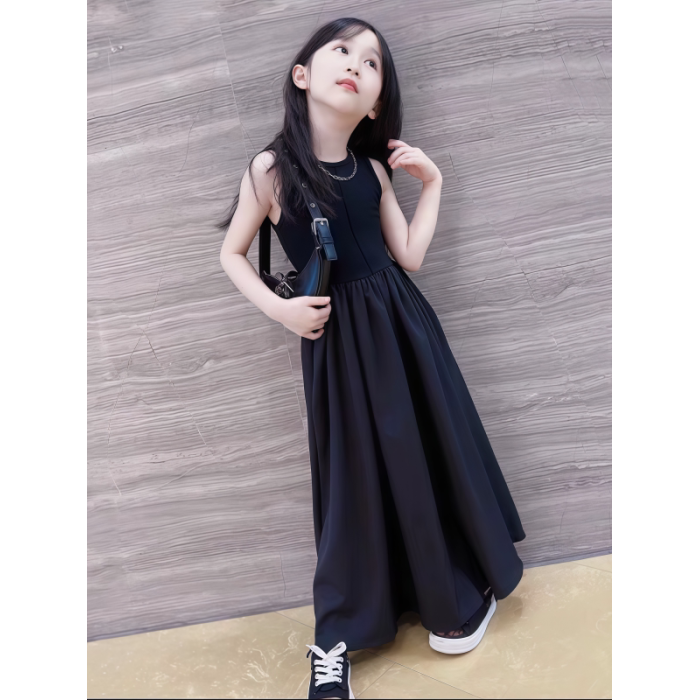 女童黑色連衣裙夏季女大童長裙背心裙赫本風小女孩夏裝裙子洋氣夏