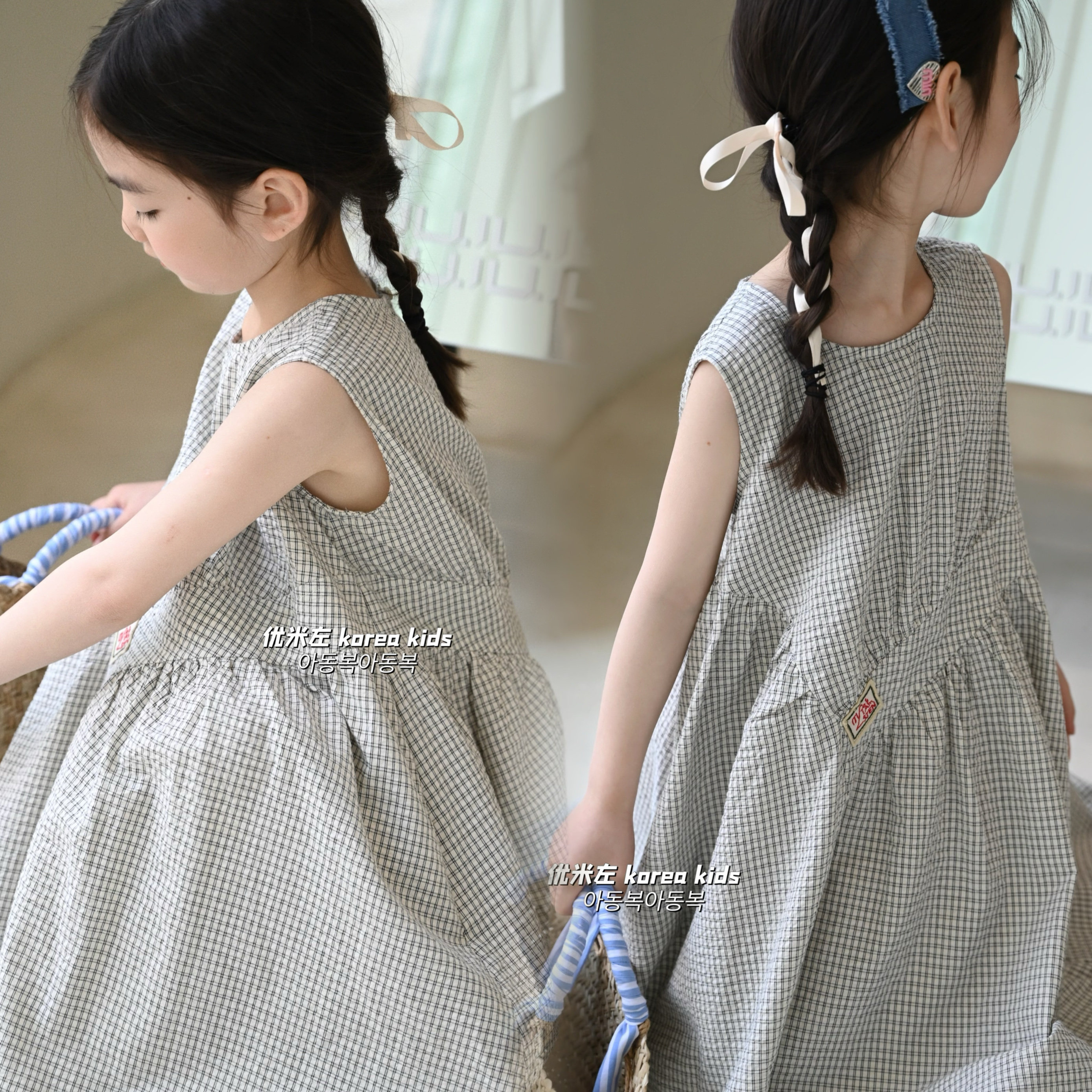 2025夏季新款韓版兒童設計感格子連衣裙女童簡約泡泡棉無袖背心裙