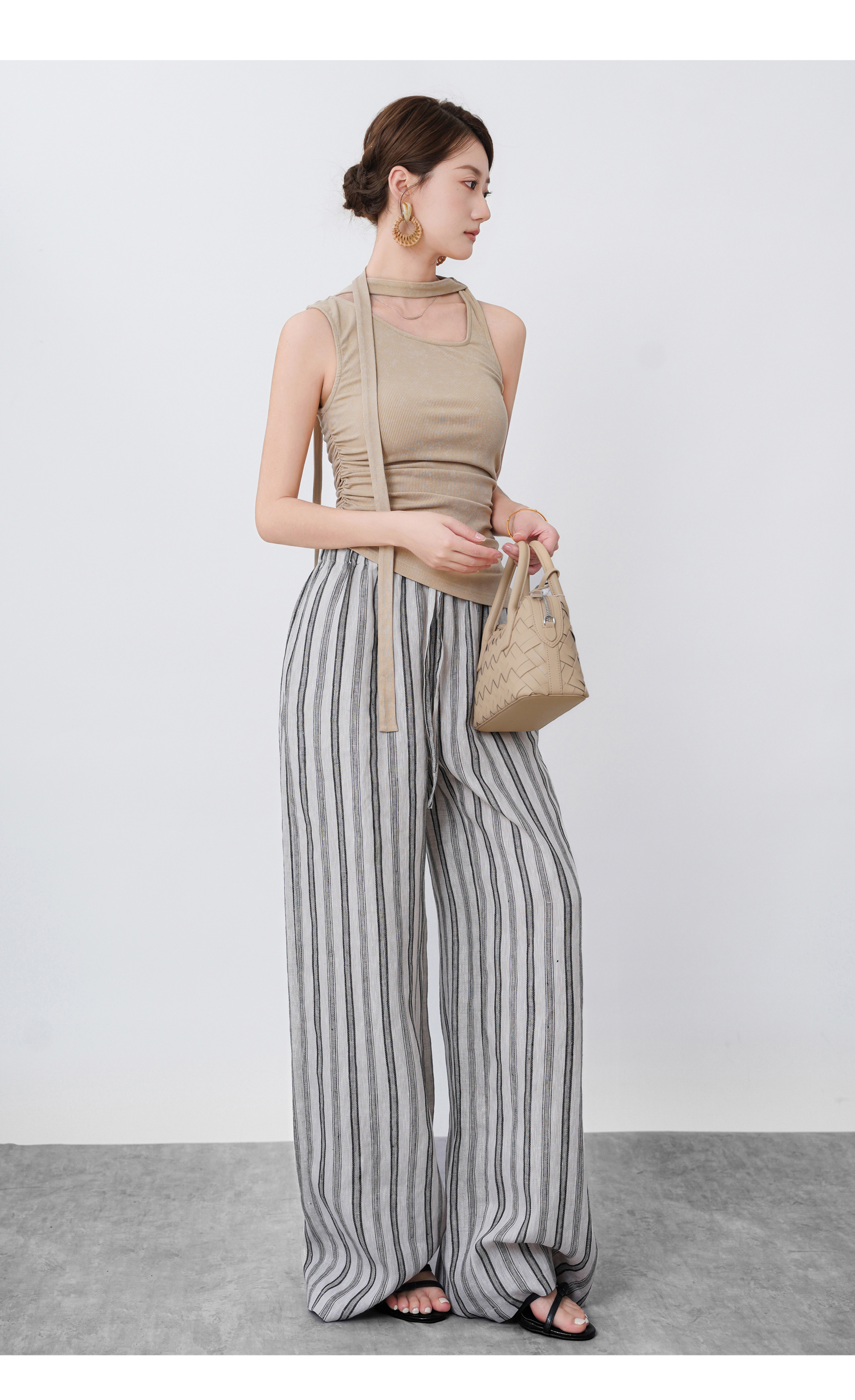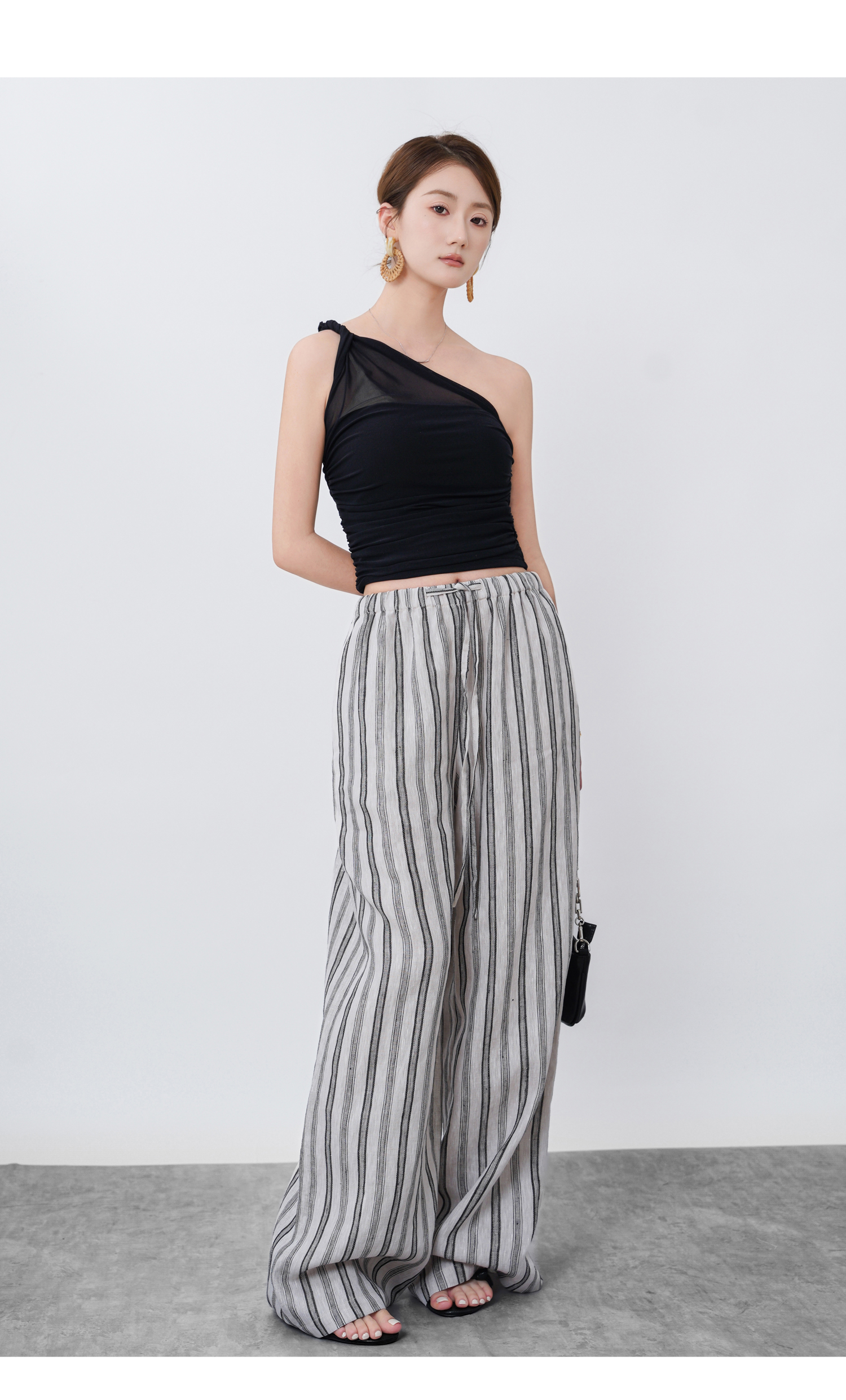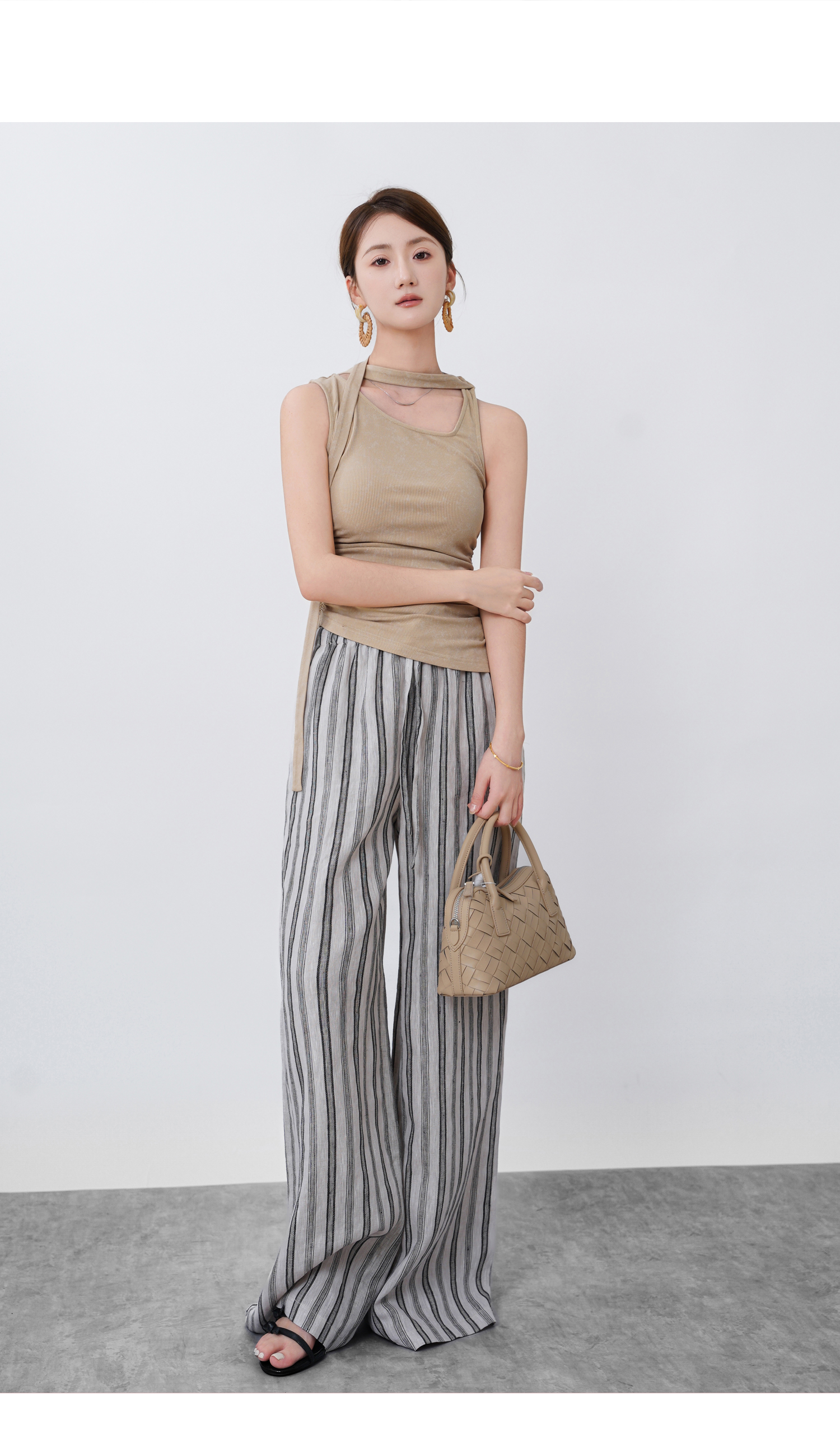 2025新款夏季條紋濶腿褲女高腰垂感寬松顯瘦百搭直筒褲休閒拖地褲