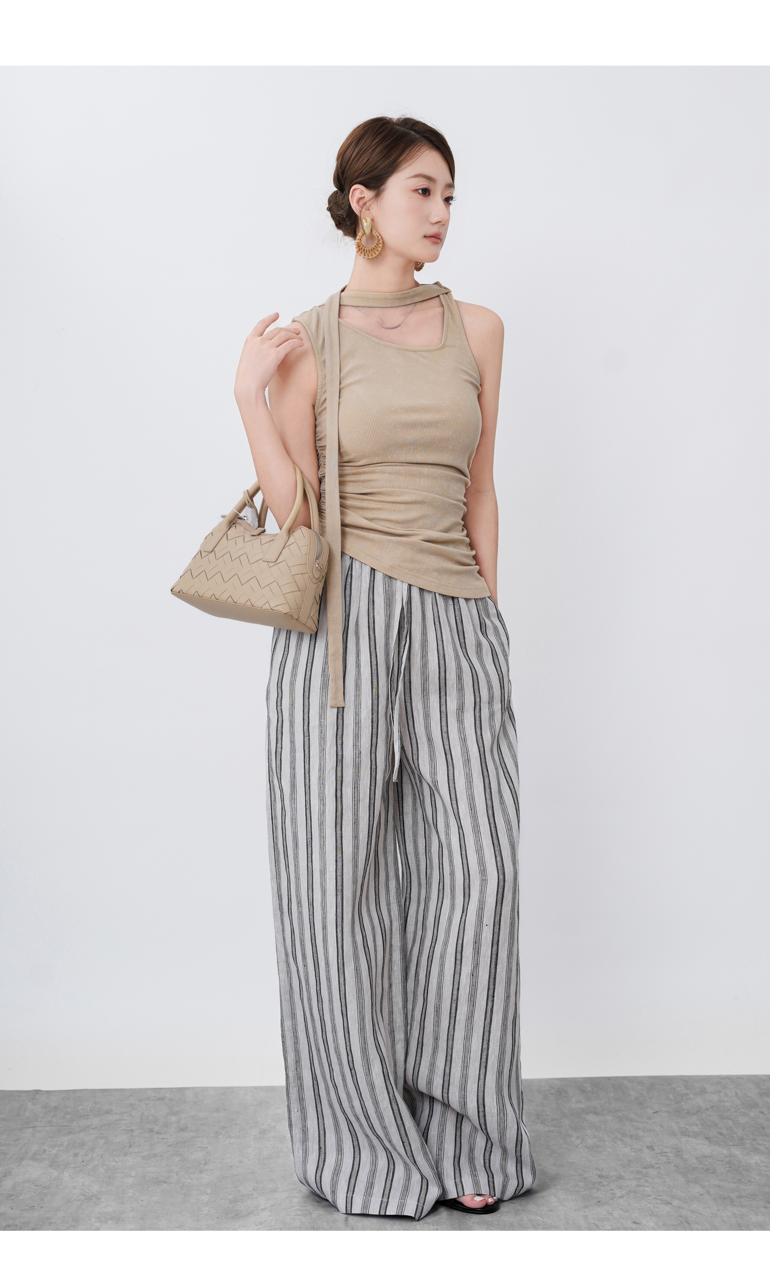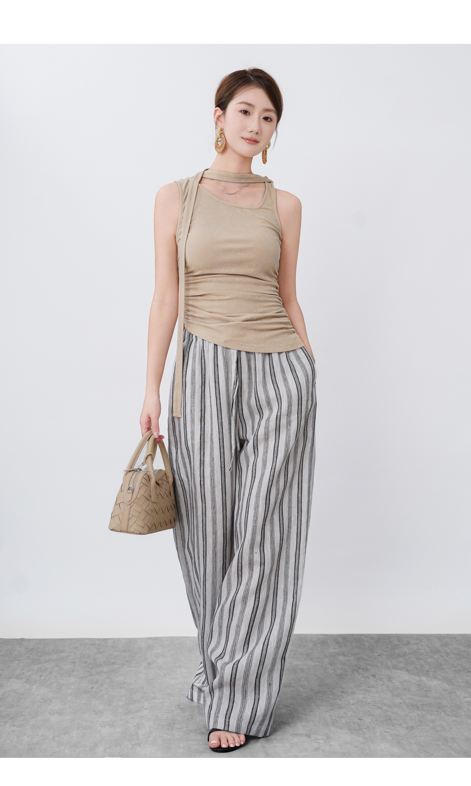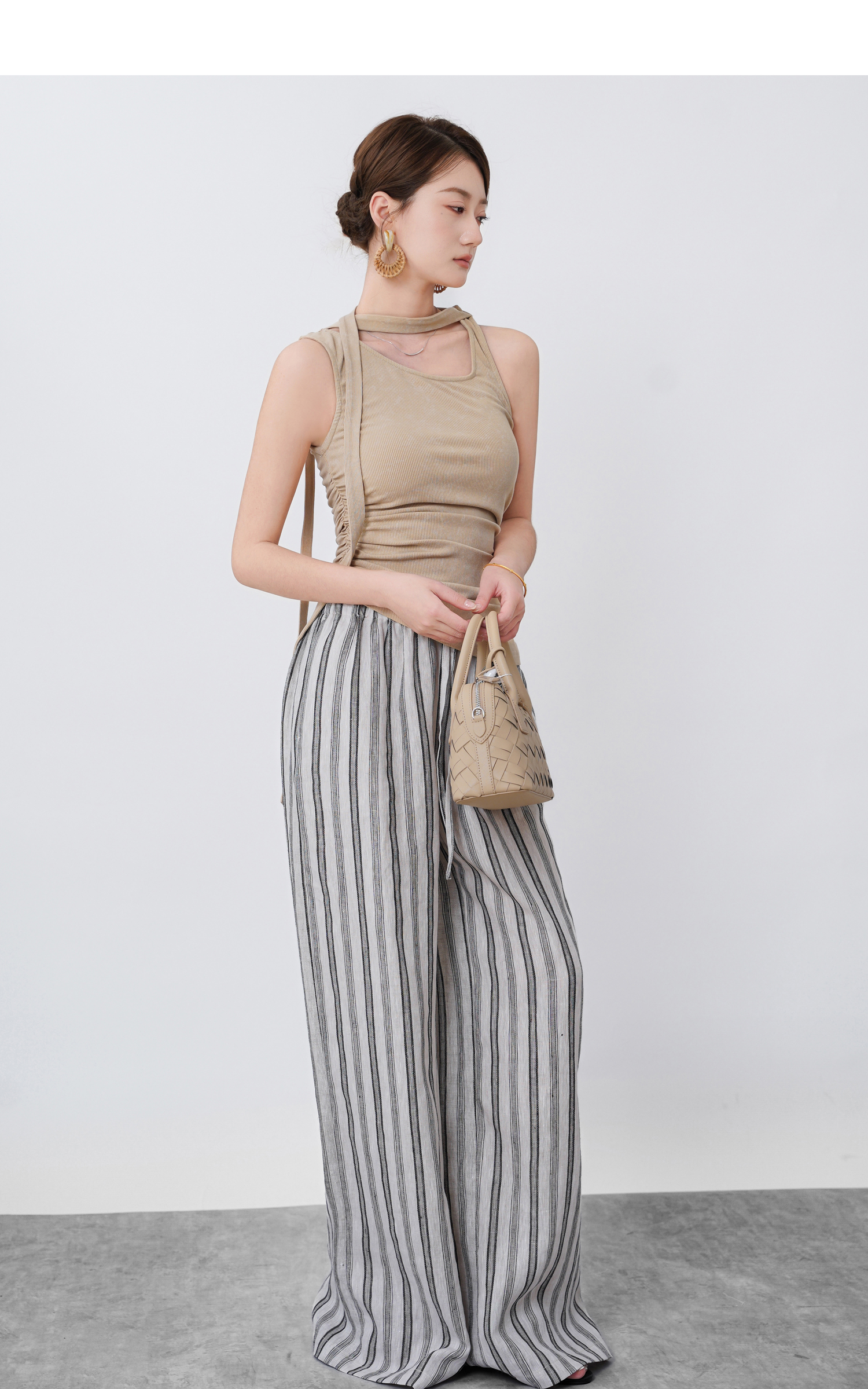 2025新款夏季條紋濶腿褲女高腰垂感寬松顯瘦百搭直筒褲休閒拖地褲
