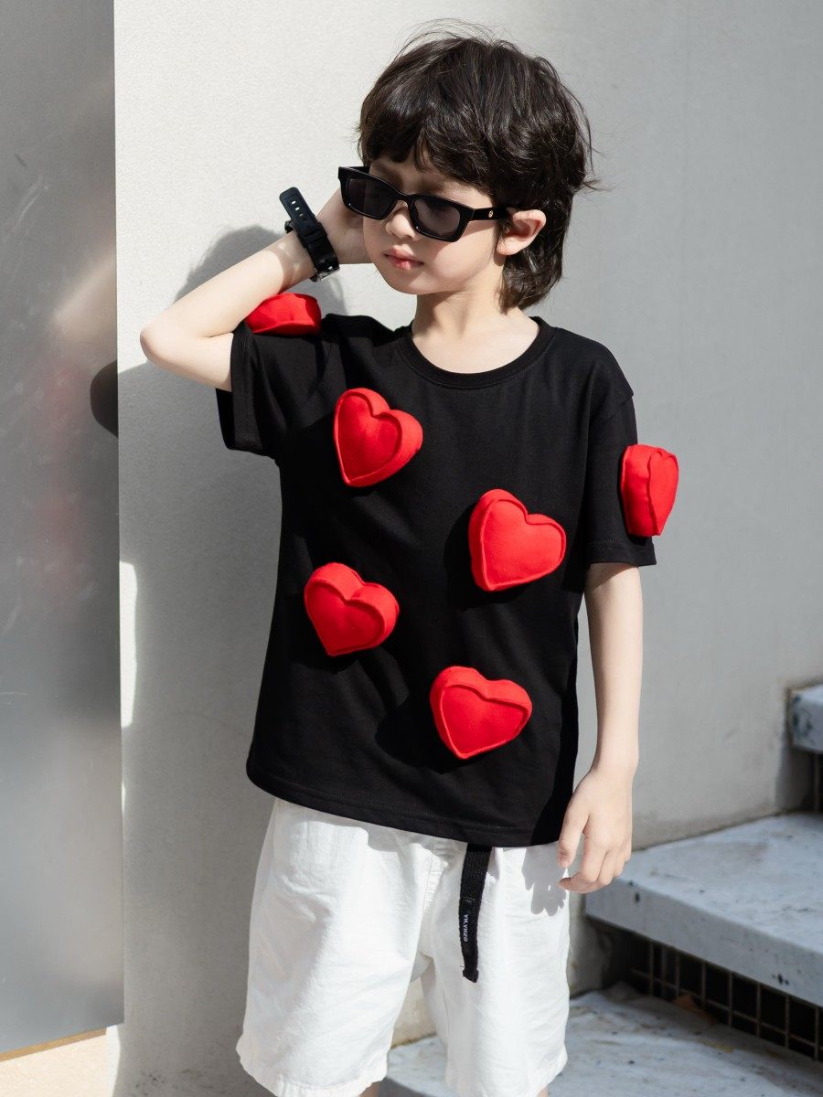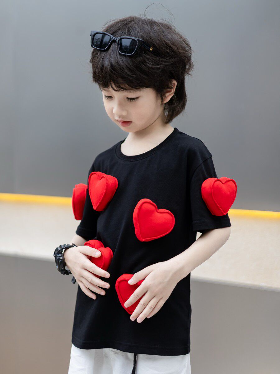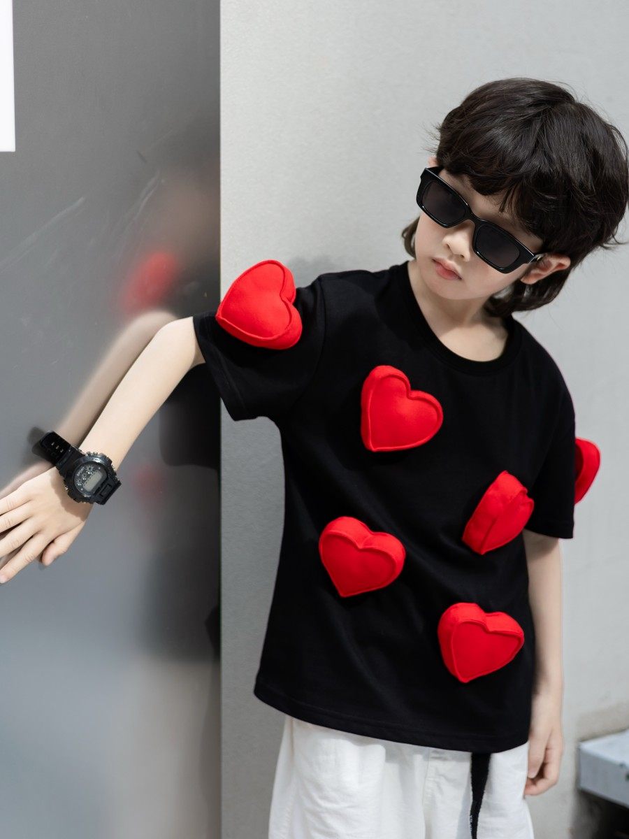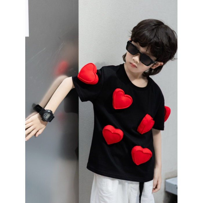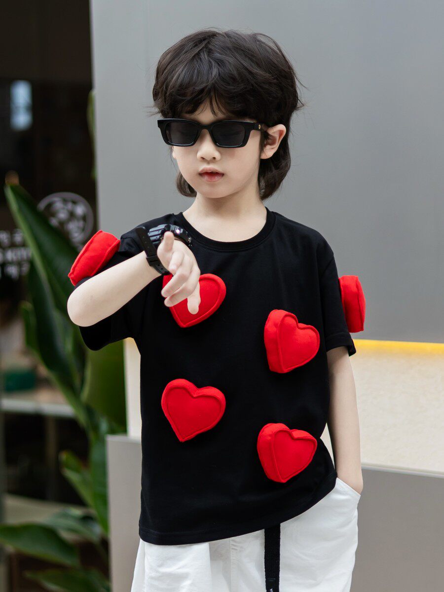 2025新款兒童T恤短袖潮酷痞帥洋氣發光立體愛心上衣親子男童女童