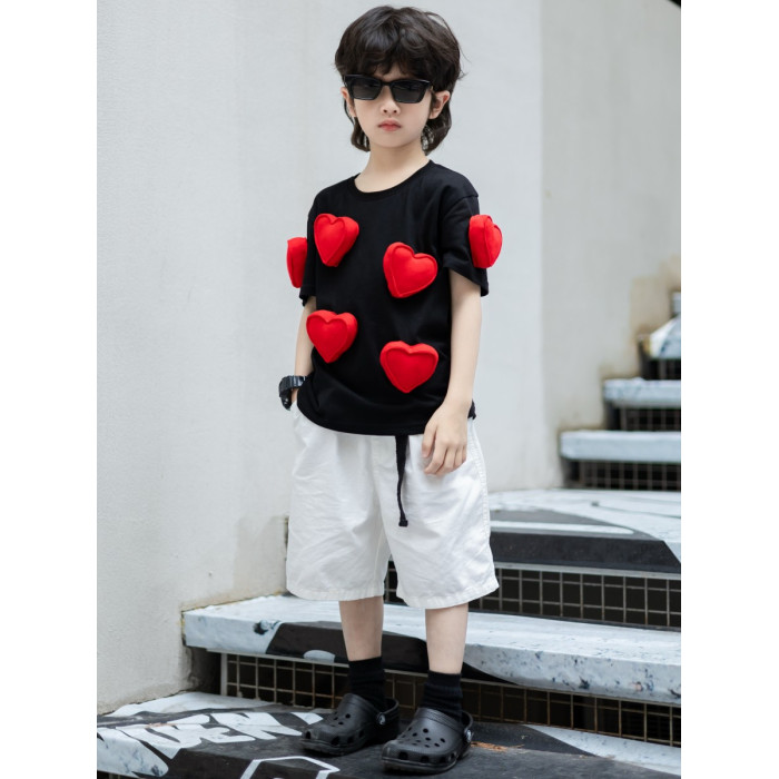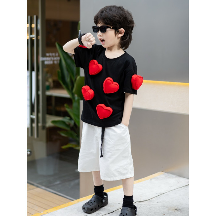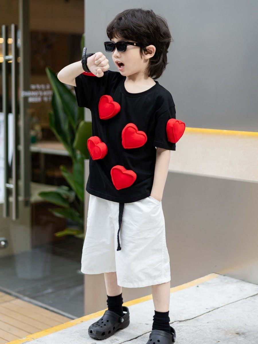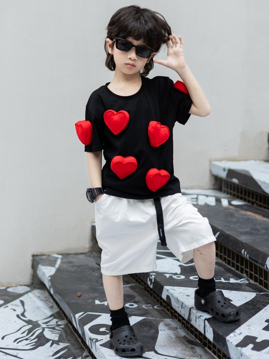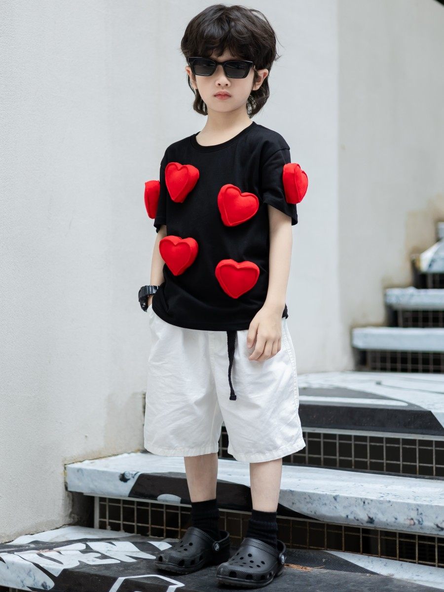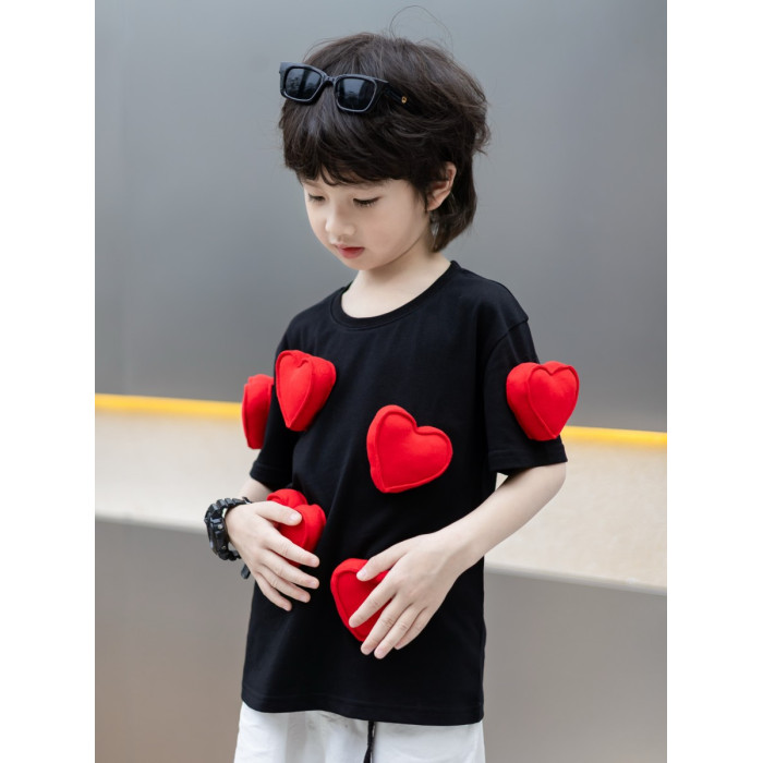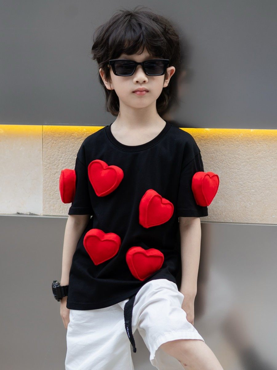 2025新款兒童T恤短袖潮酷痞帥洋氣發光立體愛心上衣親子男童女童