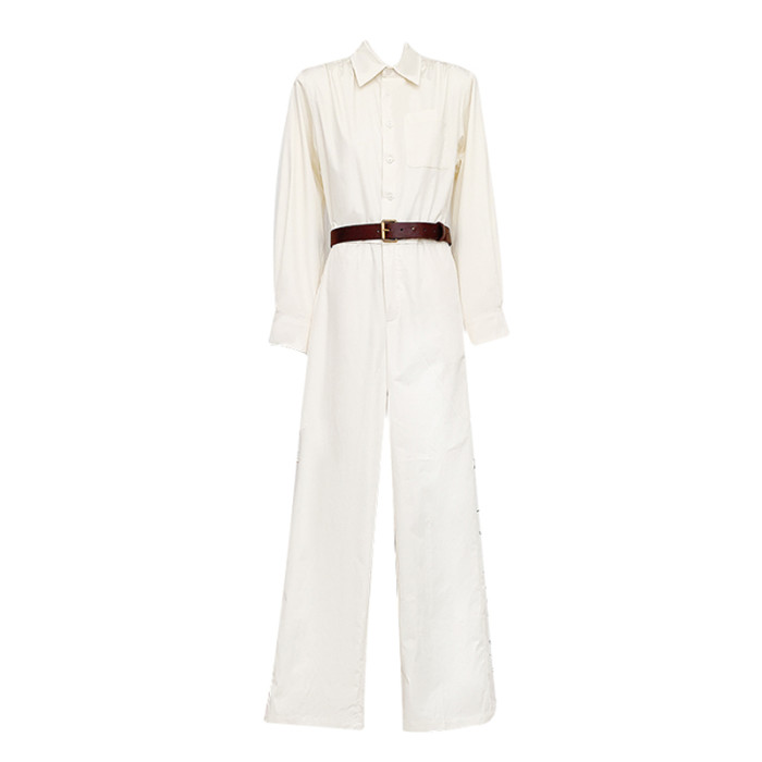 極簡設計繙領單排釦收腰襯衣連體衣春法式復古狩獵裝濶腿連體褲長