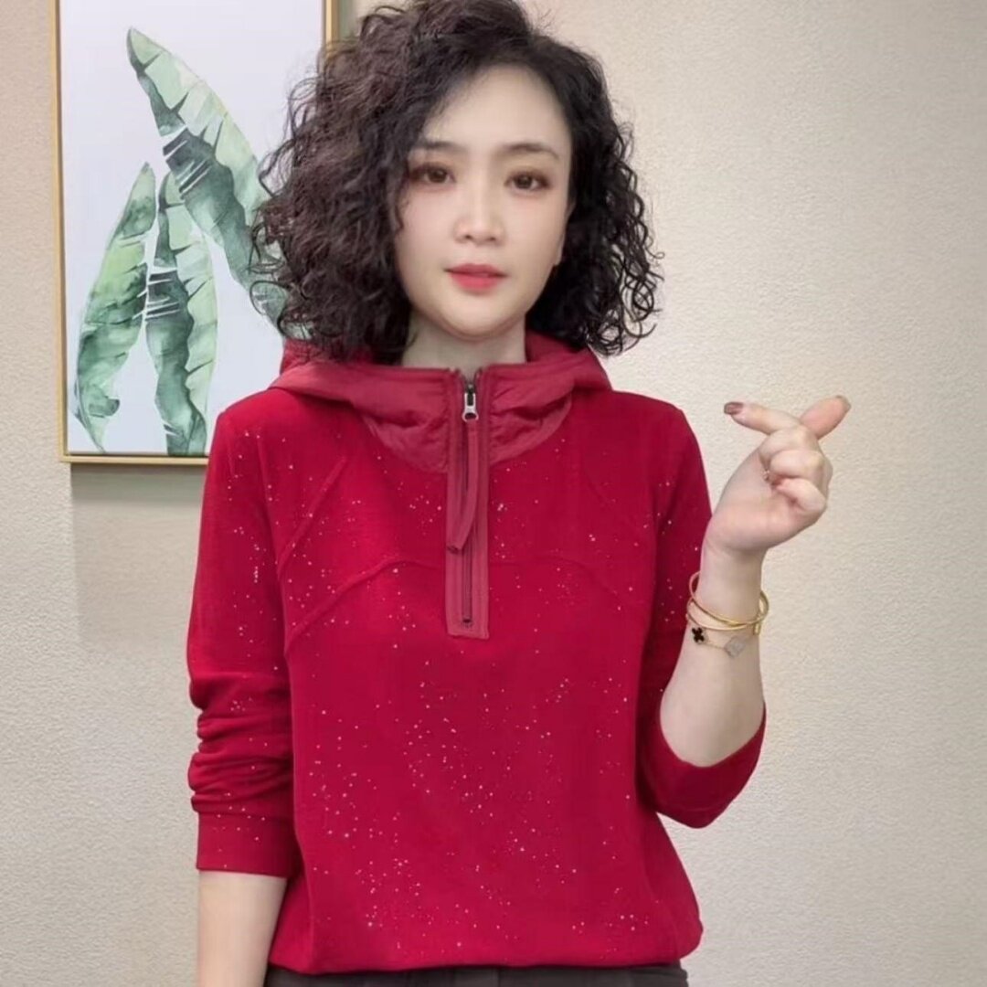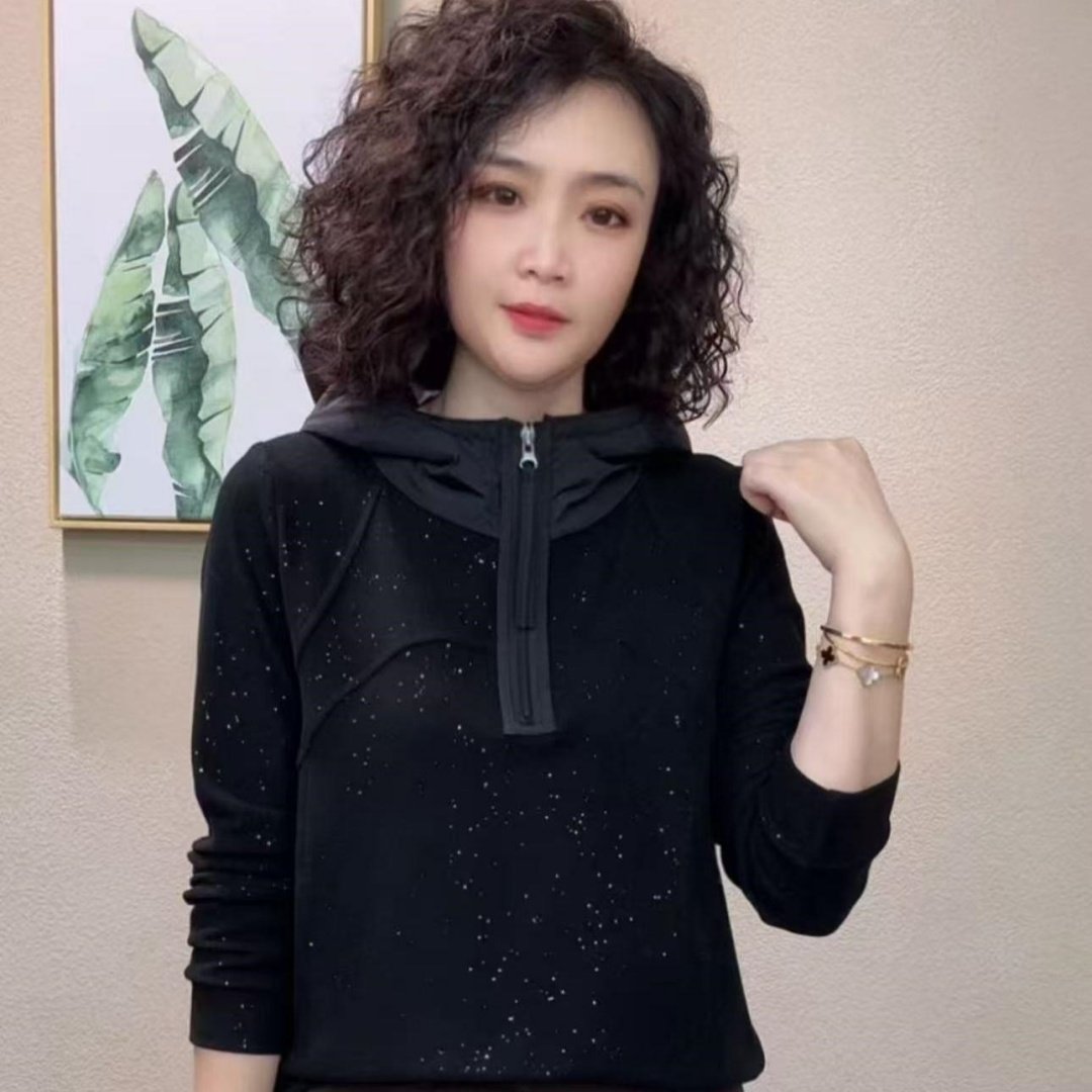 秋冬新款亮片雙面絨拉鍊連帽衛衣洋氣媽媽裝T恤百搭顯瘦減齡上衣