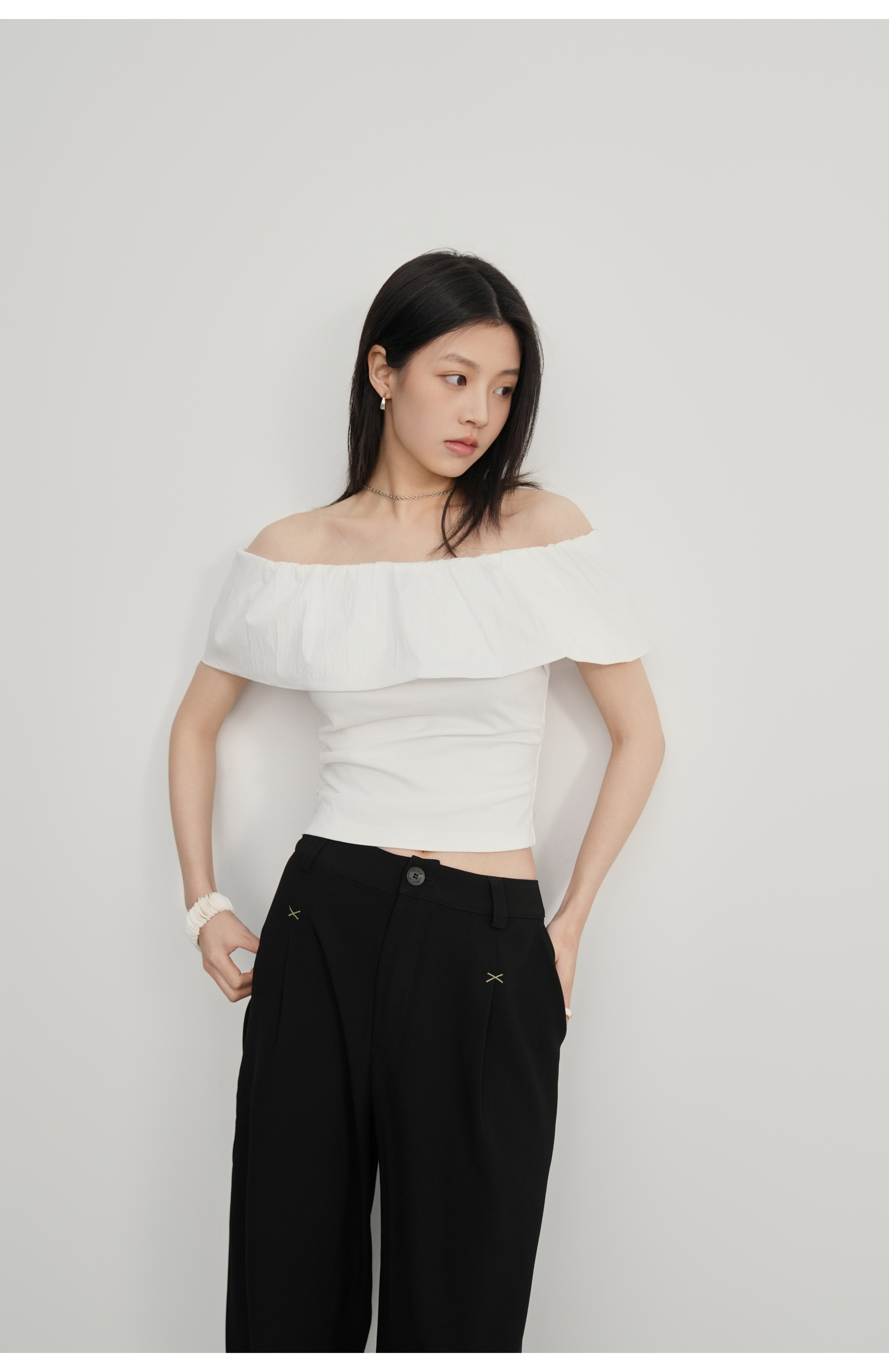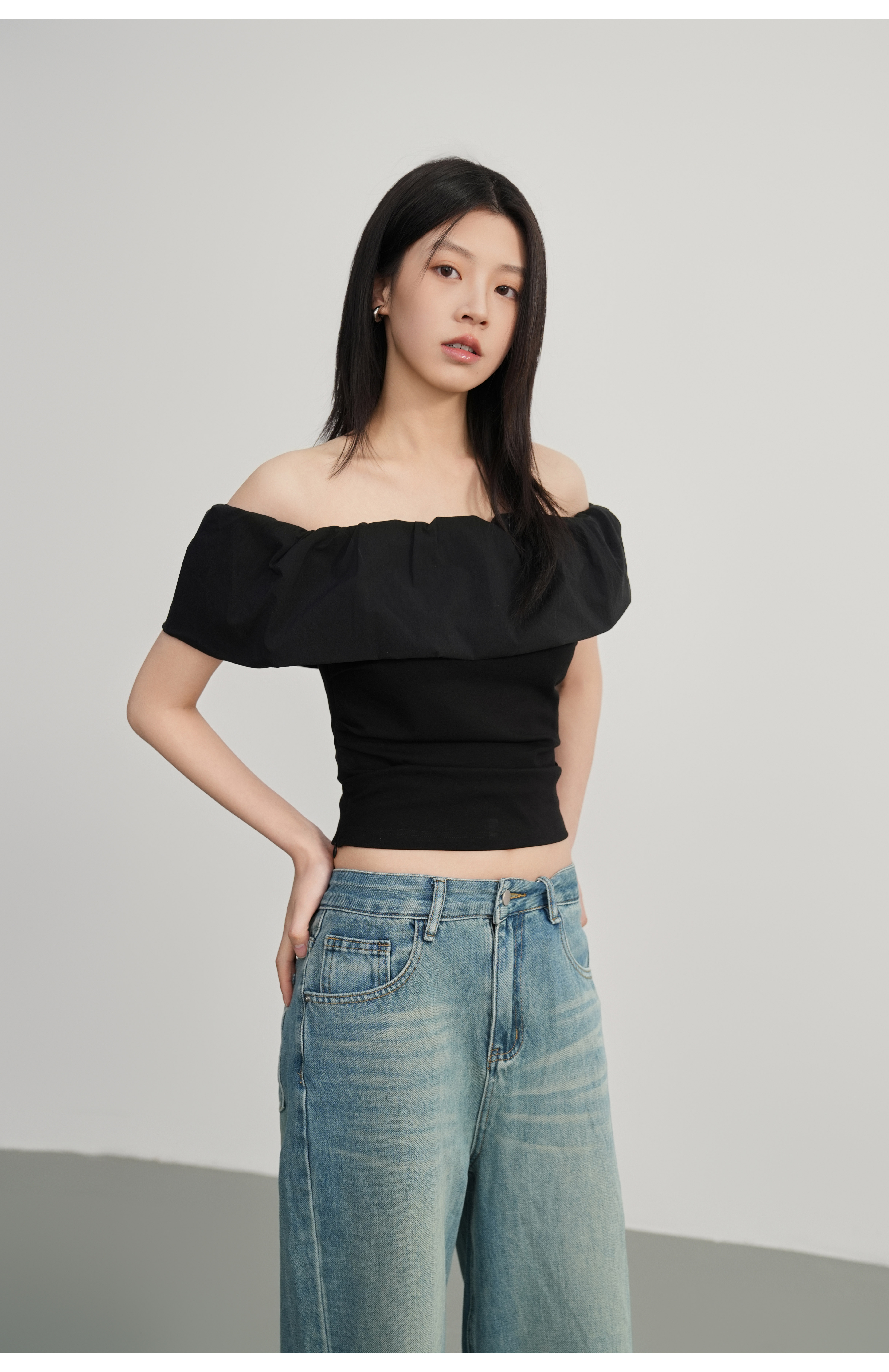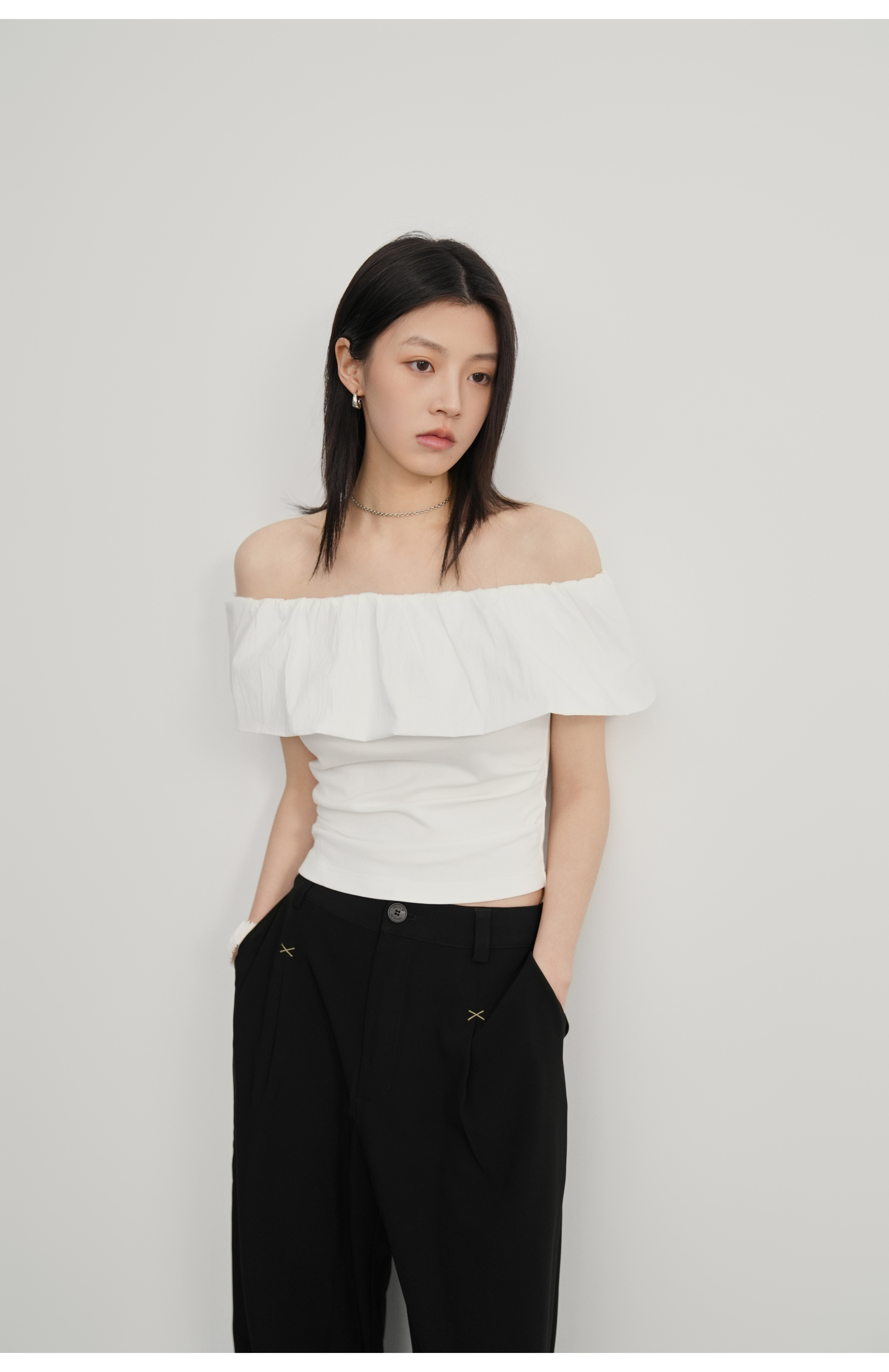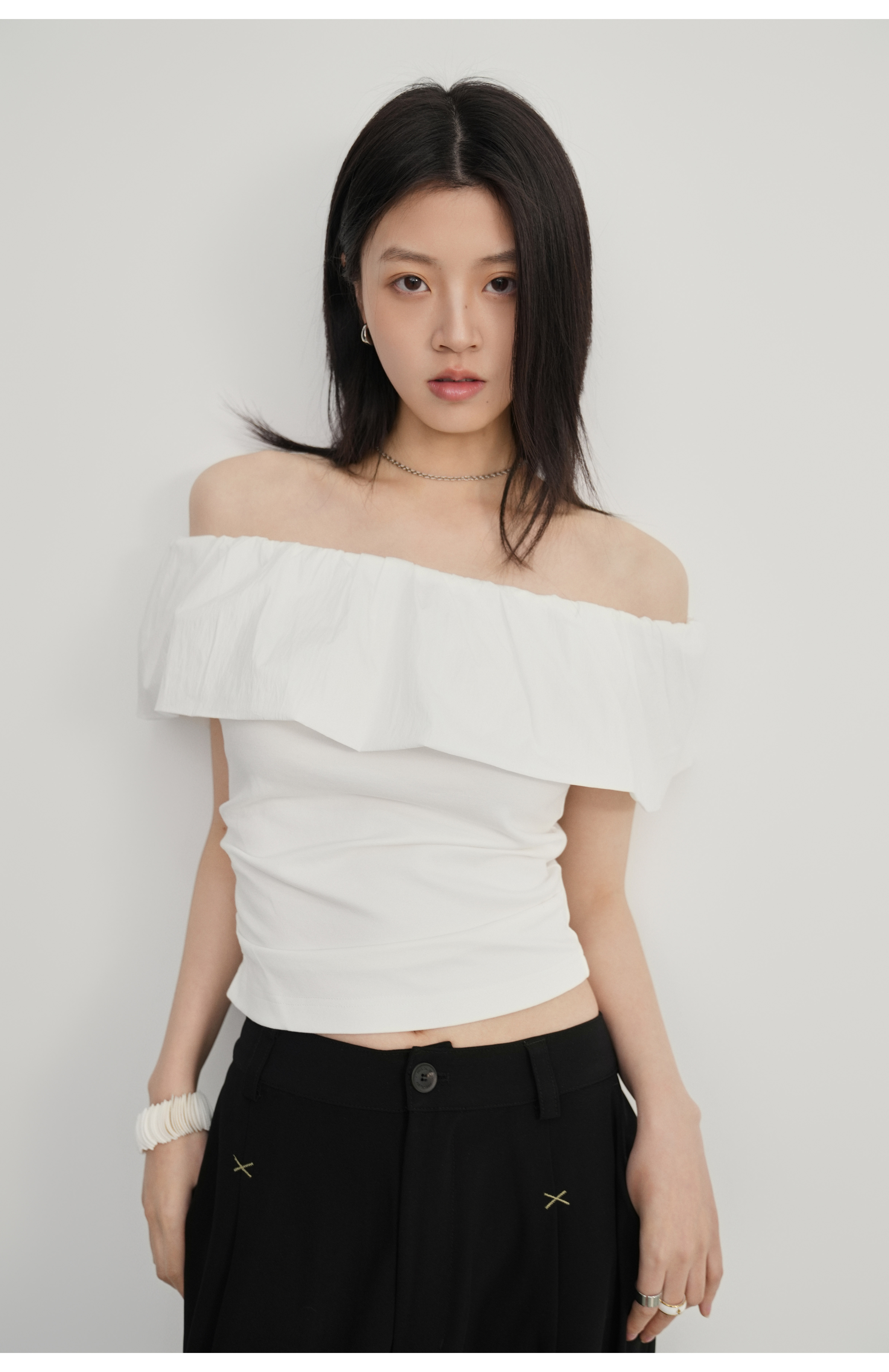 夏季氣質設計感荷葉邊絕美一字肩修身露肩T恤女高級感巨好看上衣