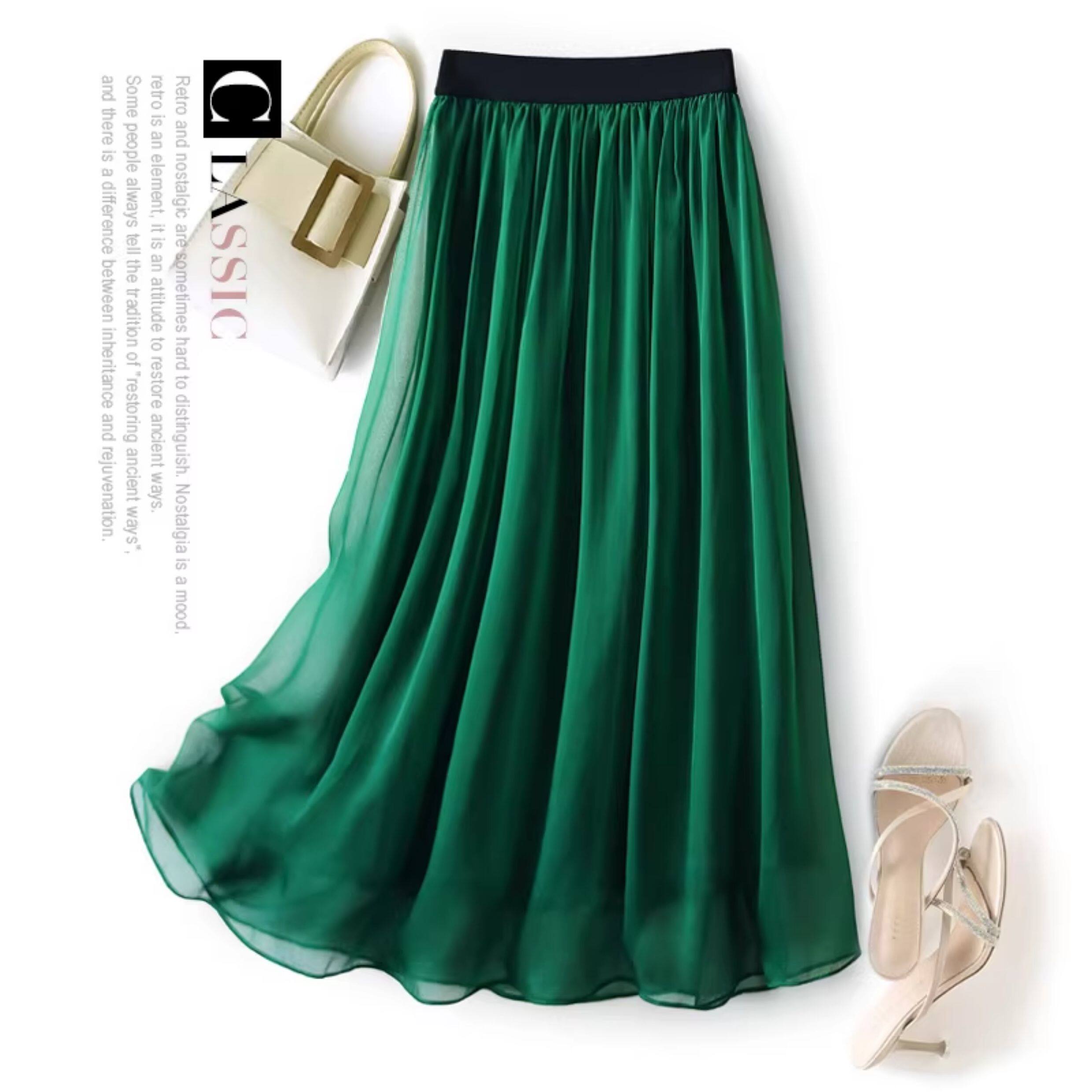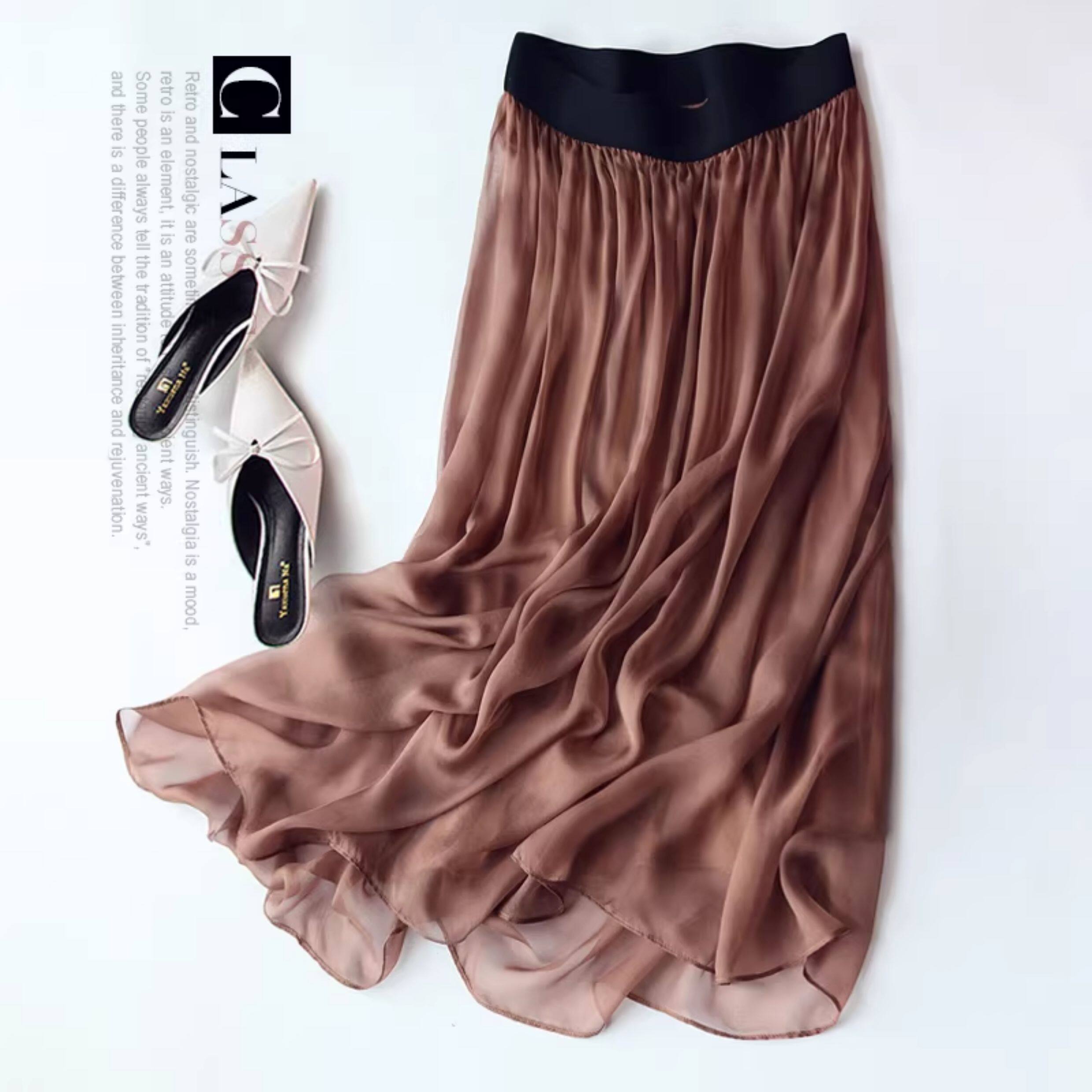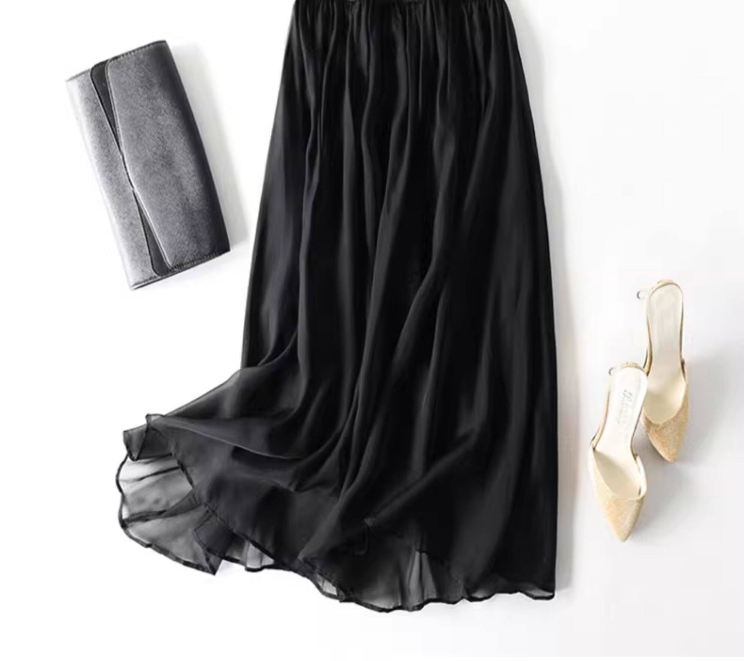 時尚高級桑蠶絲真絲半身裙女夏黑色顯瘦百搭新款A字飄逸中長裙子