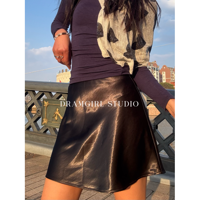高光澤感,2025年新夏季絲滑抓紋緞面花邊松緊半身短裙女高腰顯瘦