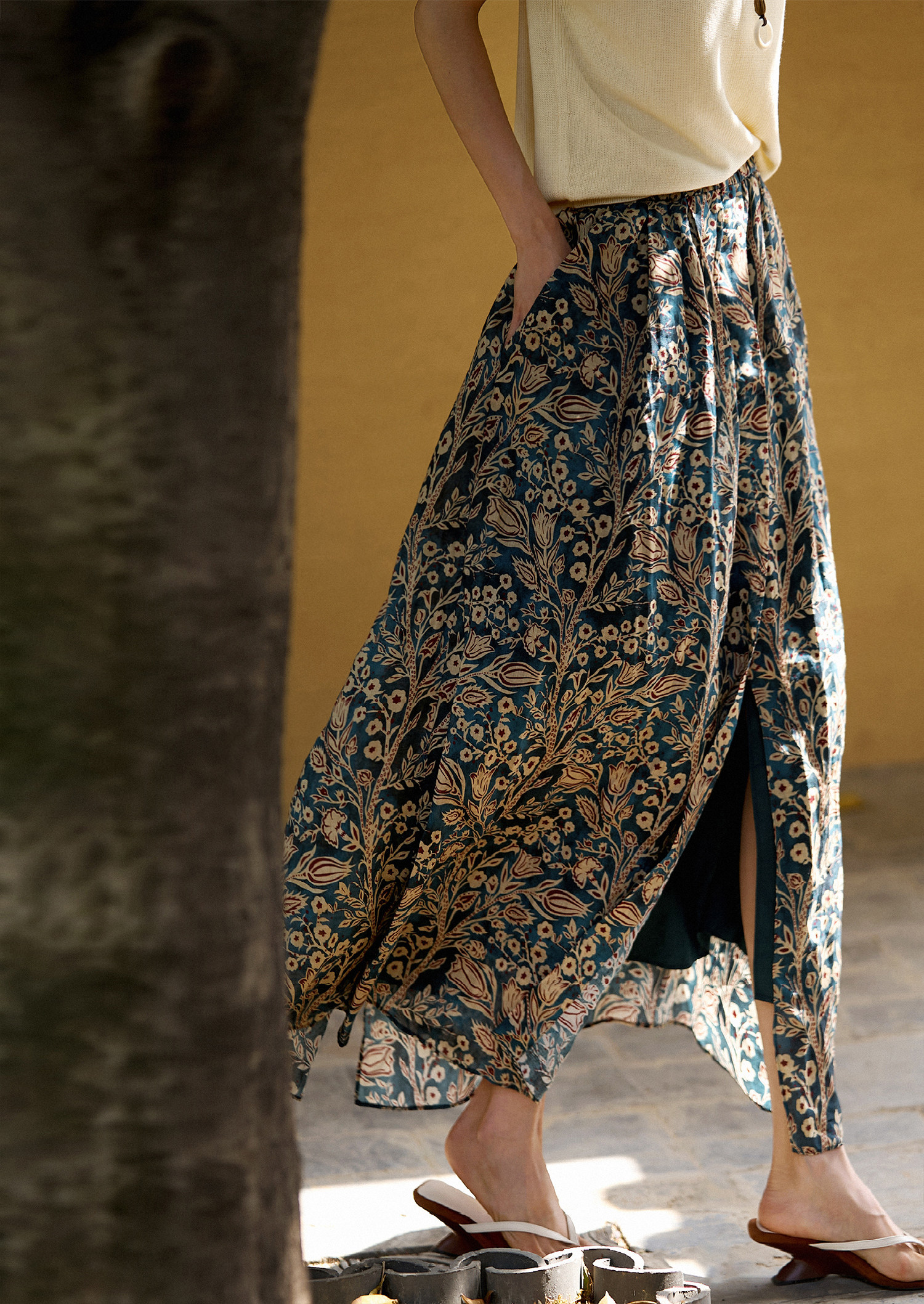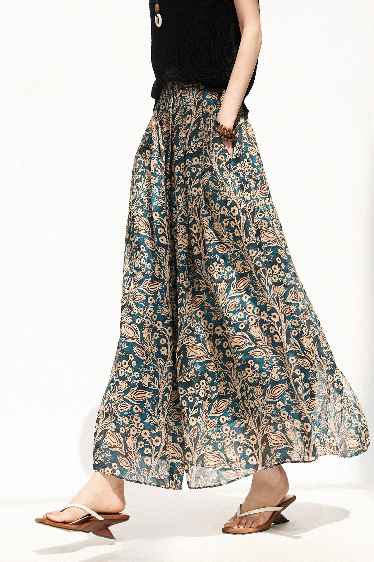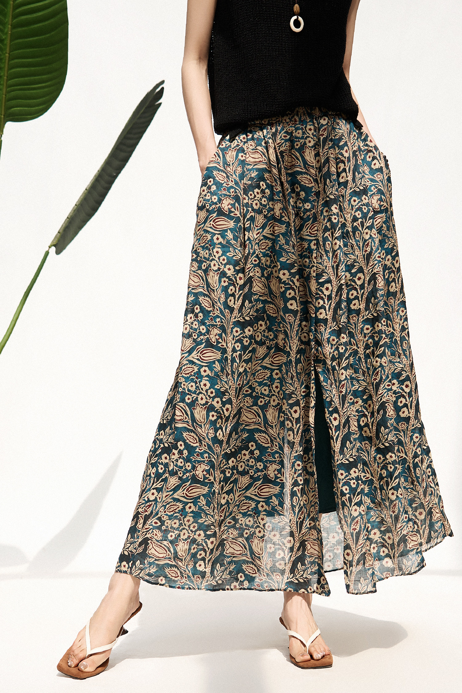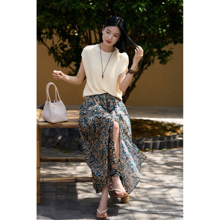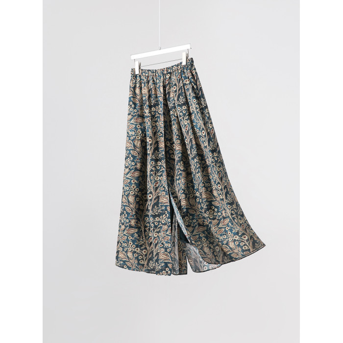 「步履生香」前後開叉設計+100%苧麻+珮斯利印花A字半身裙25年夏