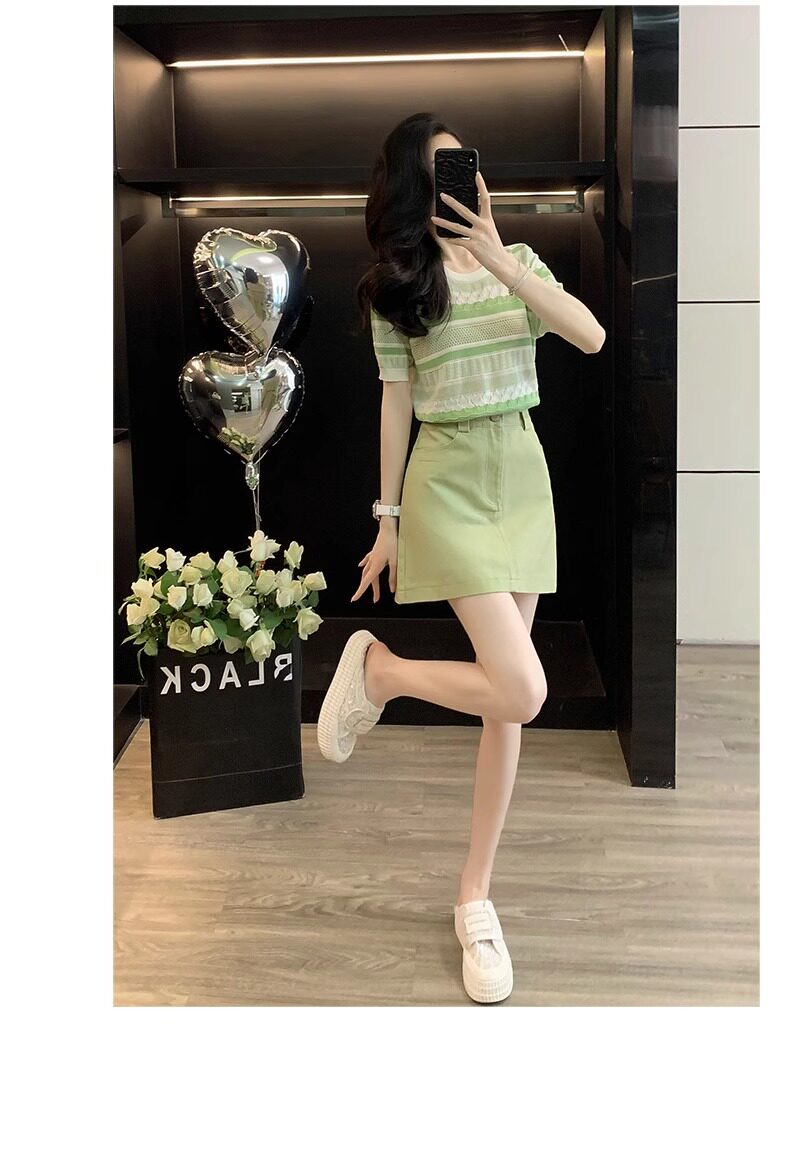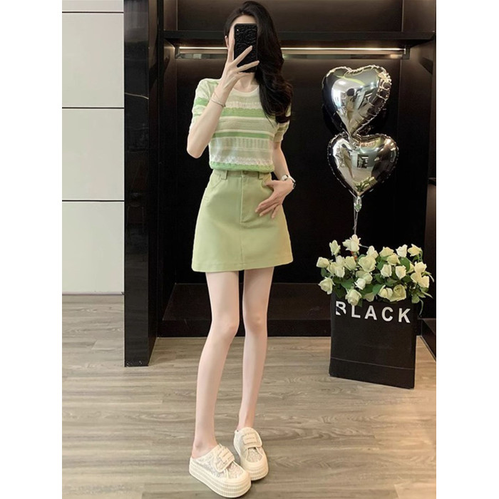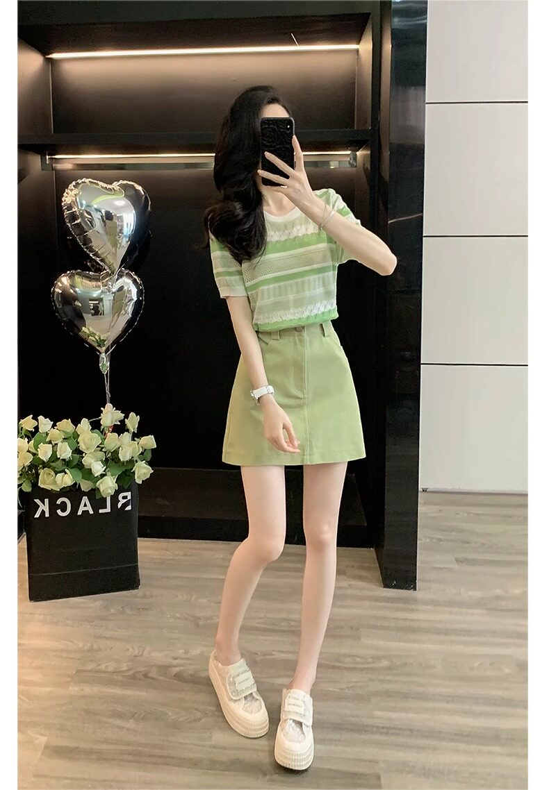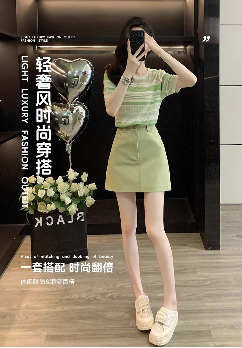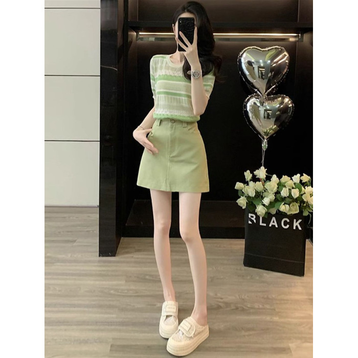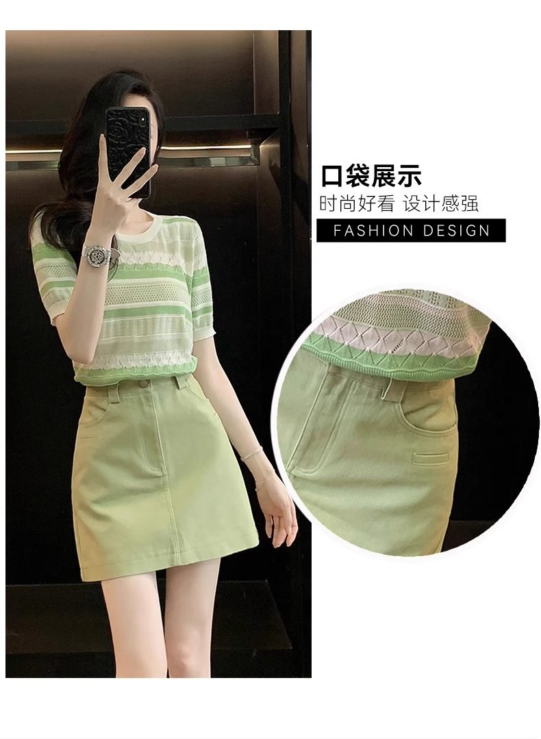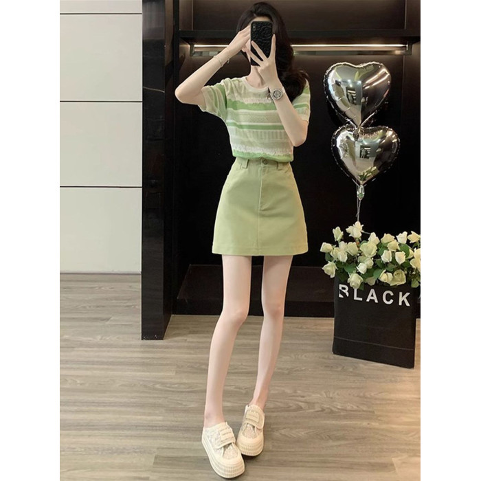 2025夏洋氣顯瘦條紋短袖T恤牛仔短裙兩件套小清新綠色時尚套裙女