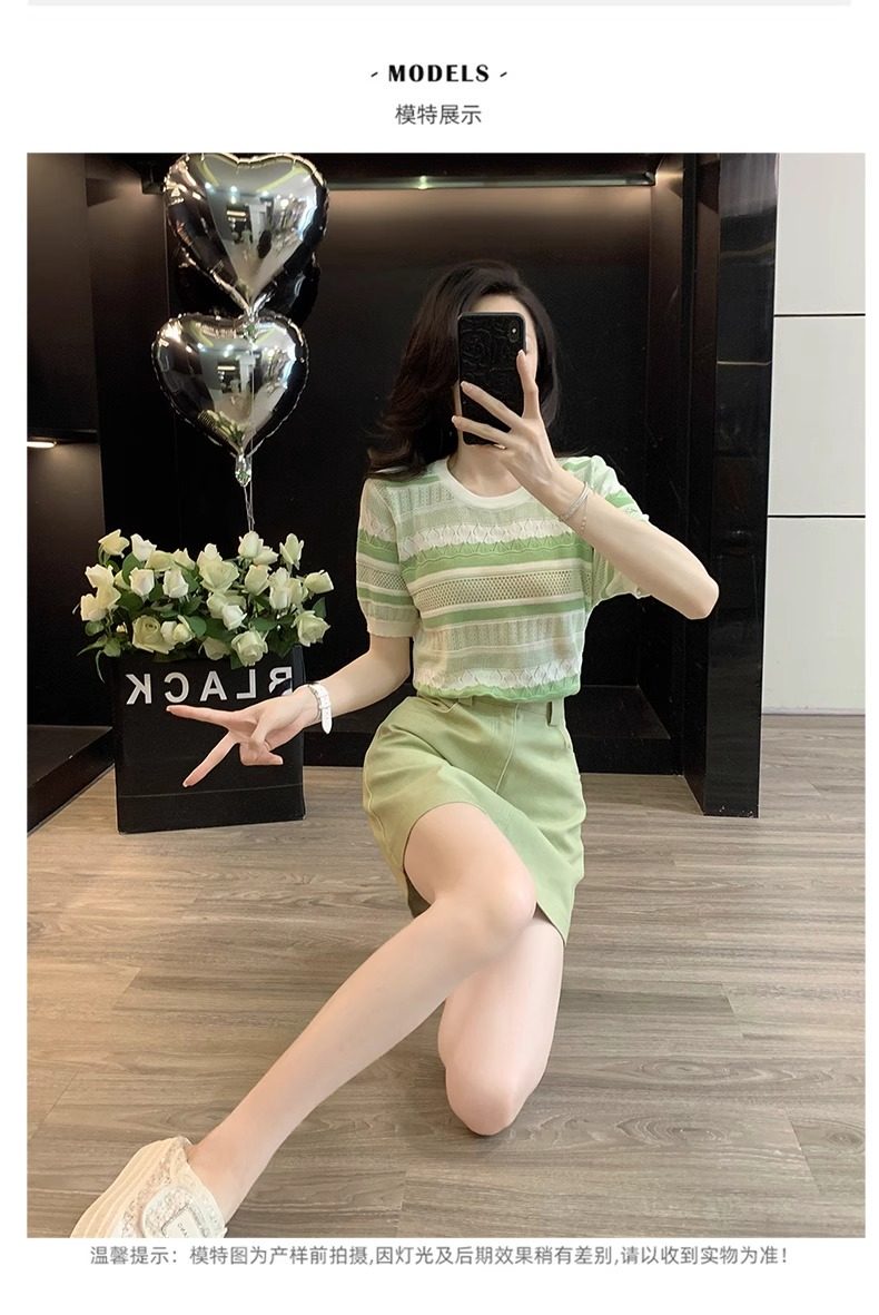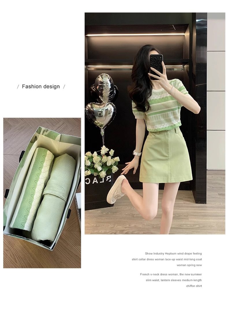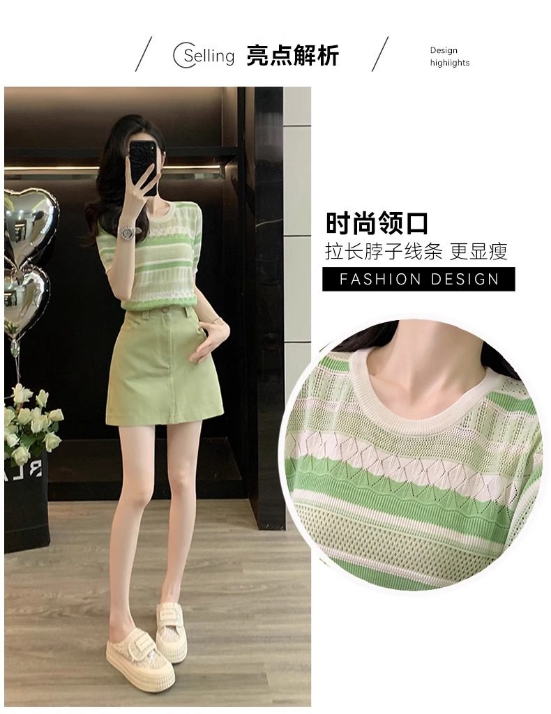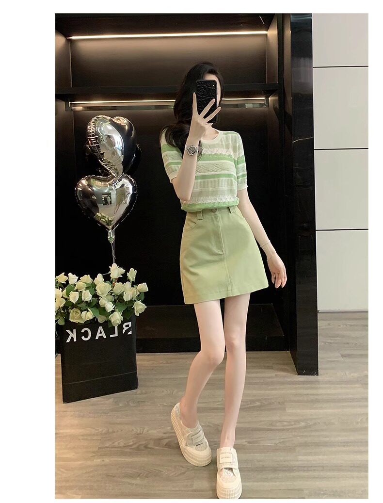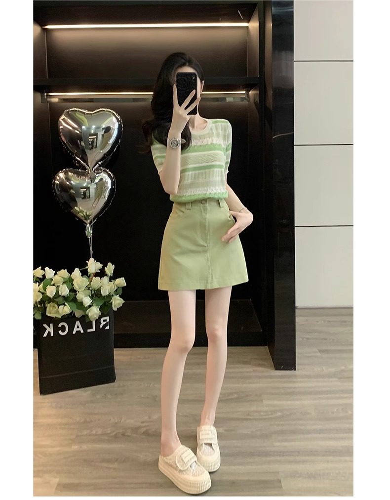 2025夏洋氣顯瘦條紋短袖T恤牛仔短裙兩件套小清新綠色時尚套裙女