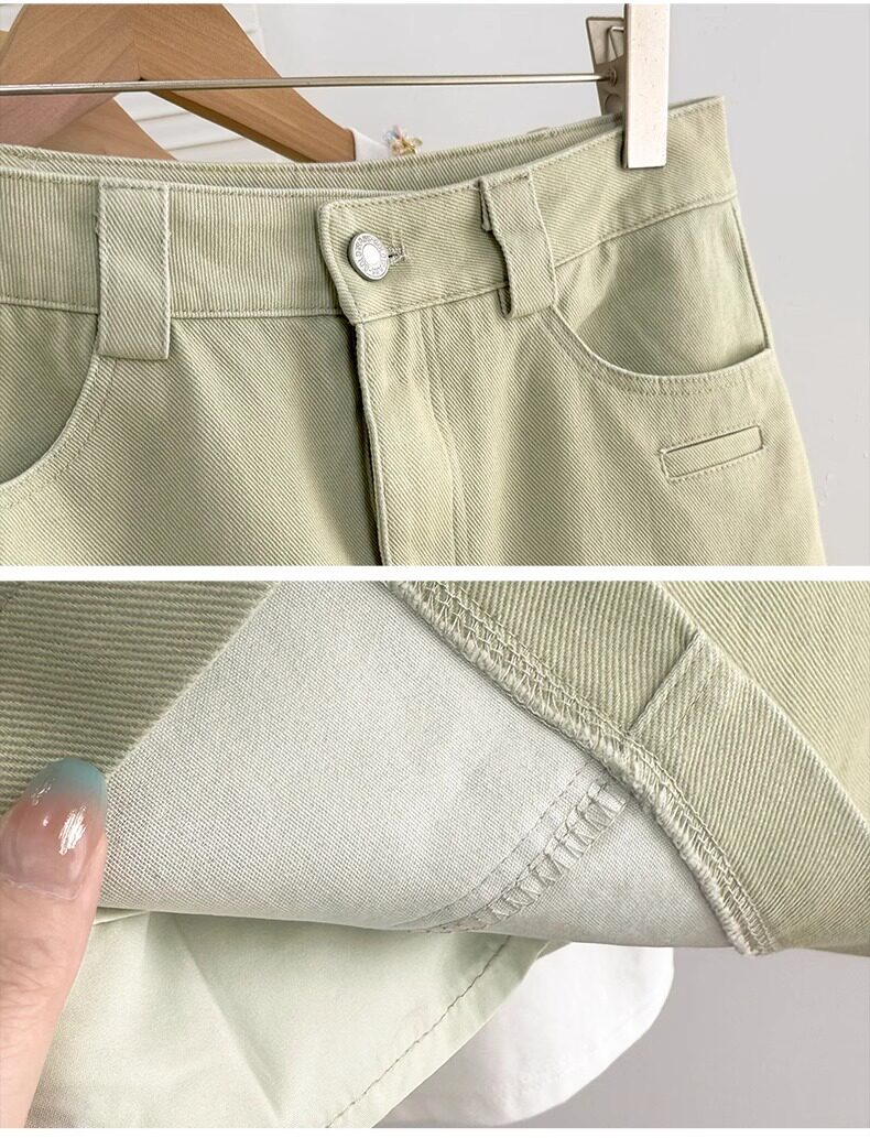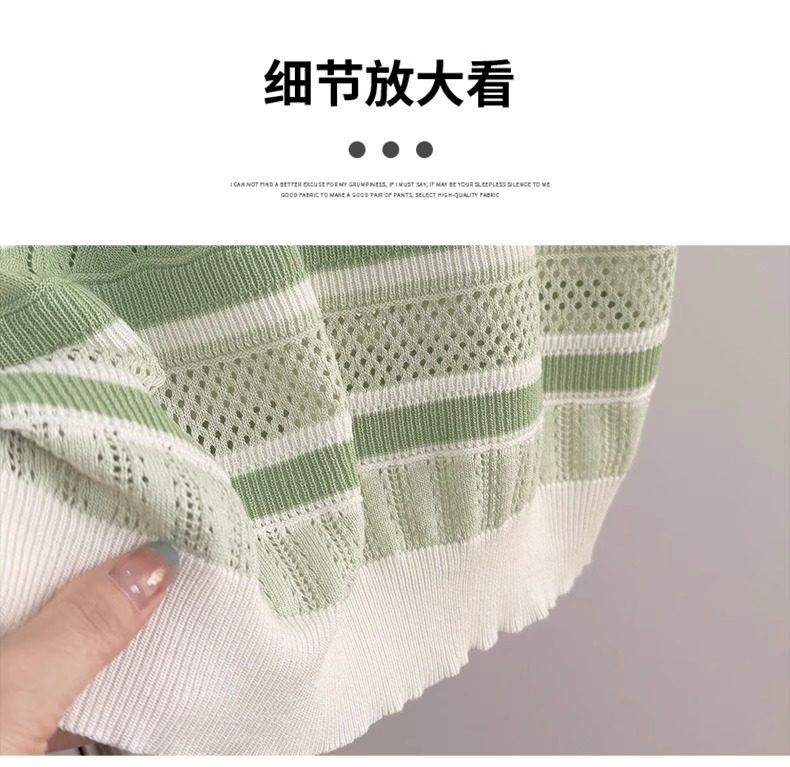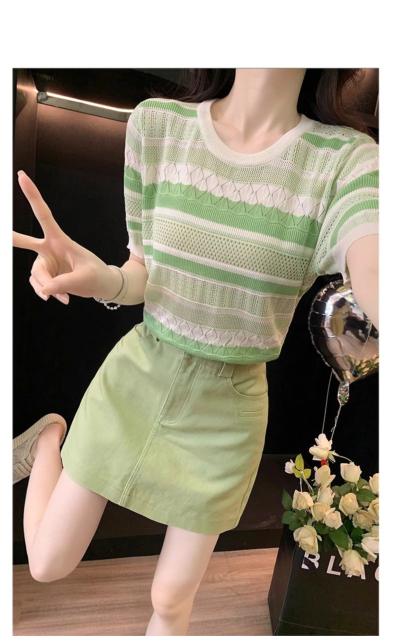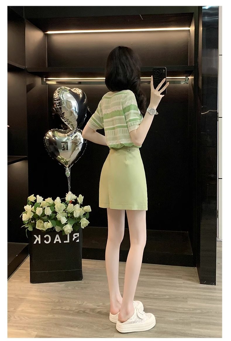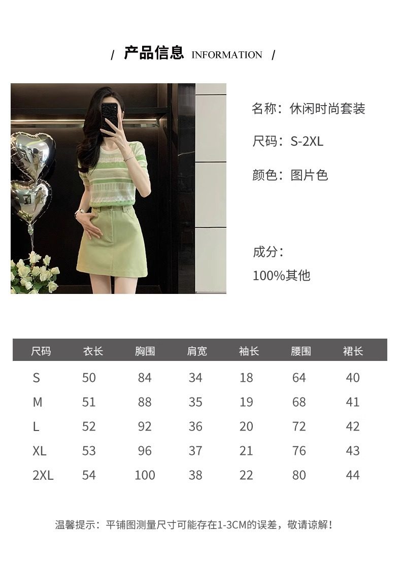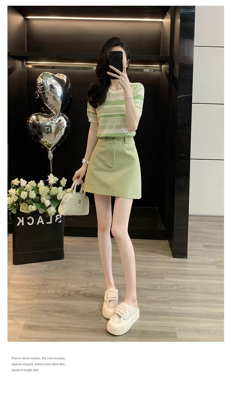 2025夏洋氣顯瘦條紋短袖T恤牛仔短裙兩件套小清新綠色時尚套裙女
