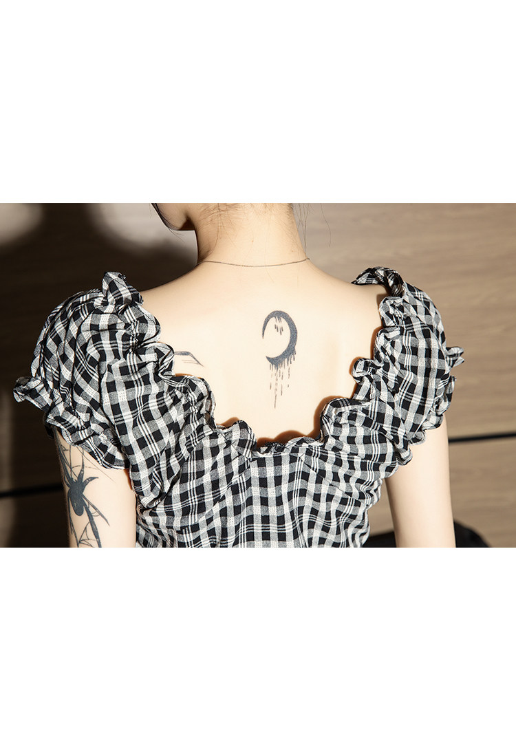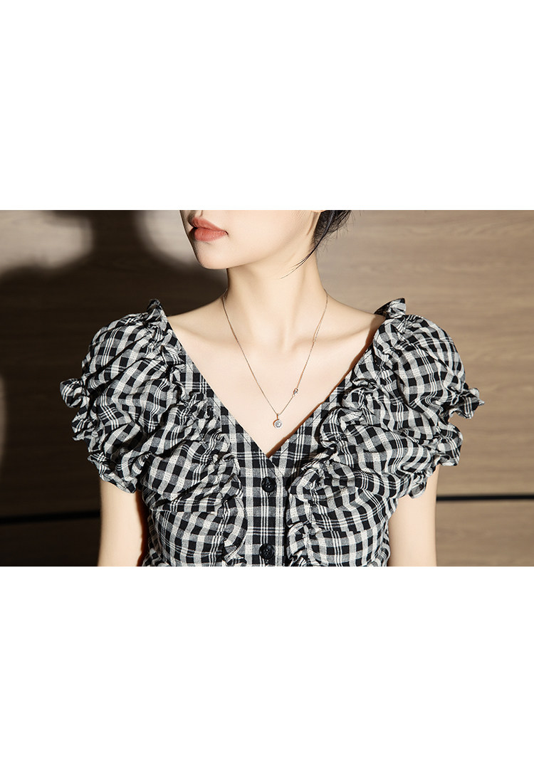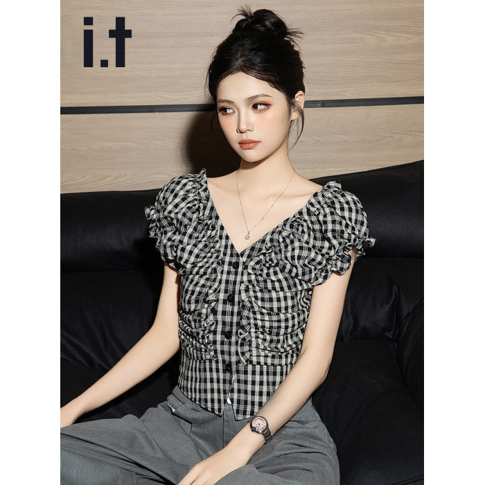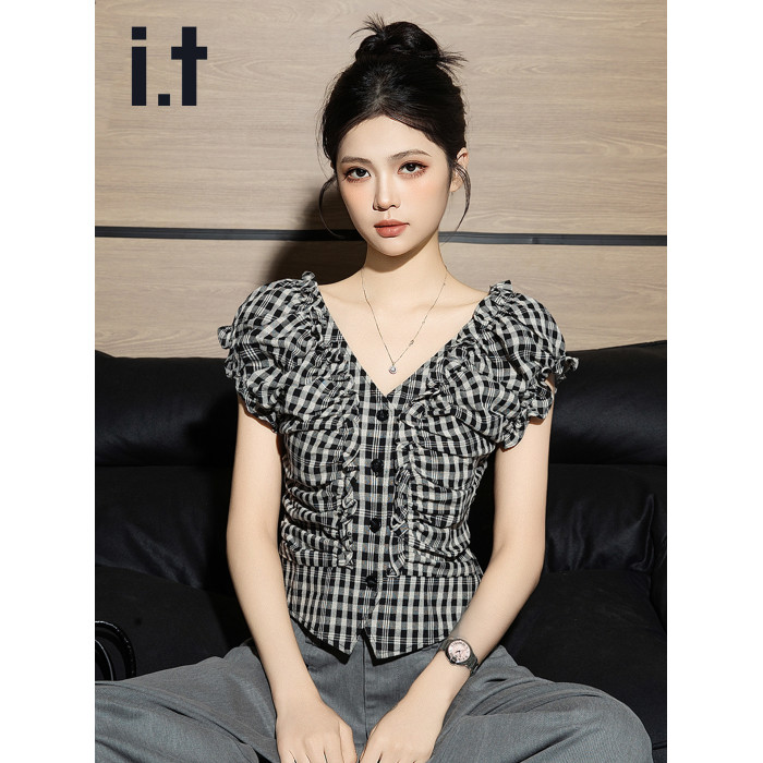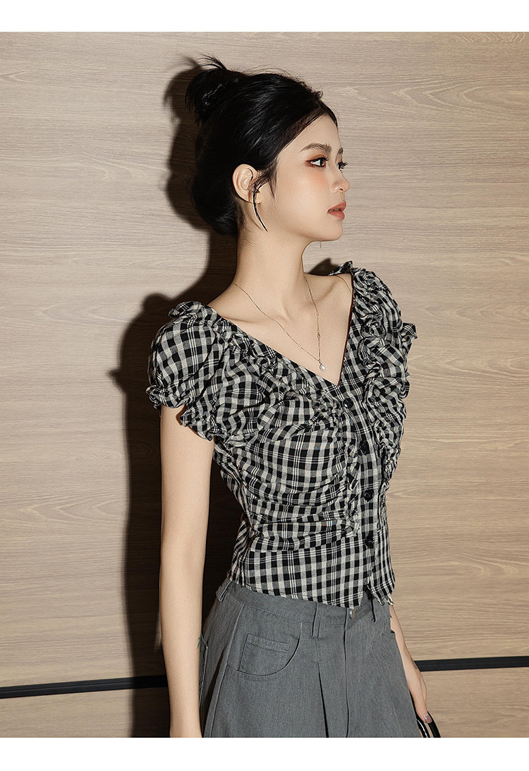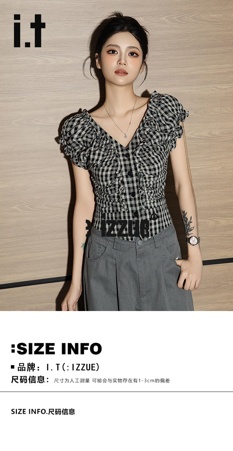 it izzue黑格V領泡泡短袖襯衫女2025夏季獨特小衫收腰甜辣上衣潮