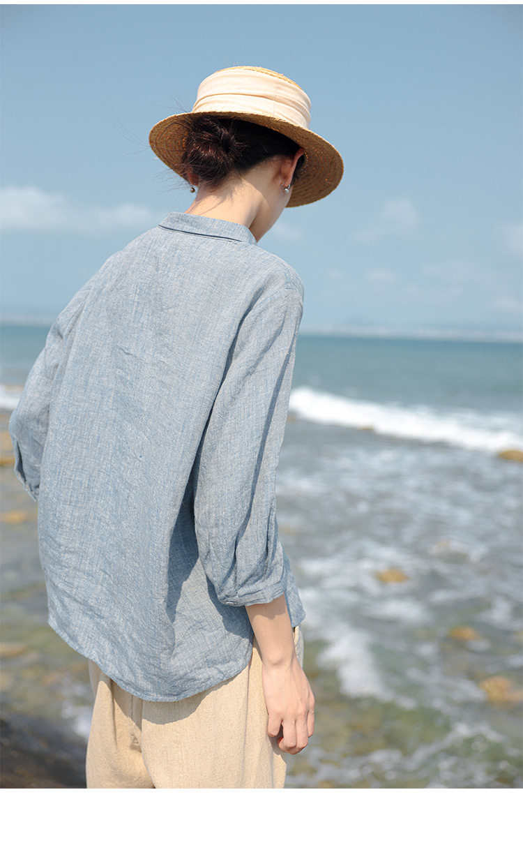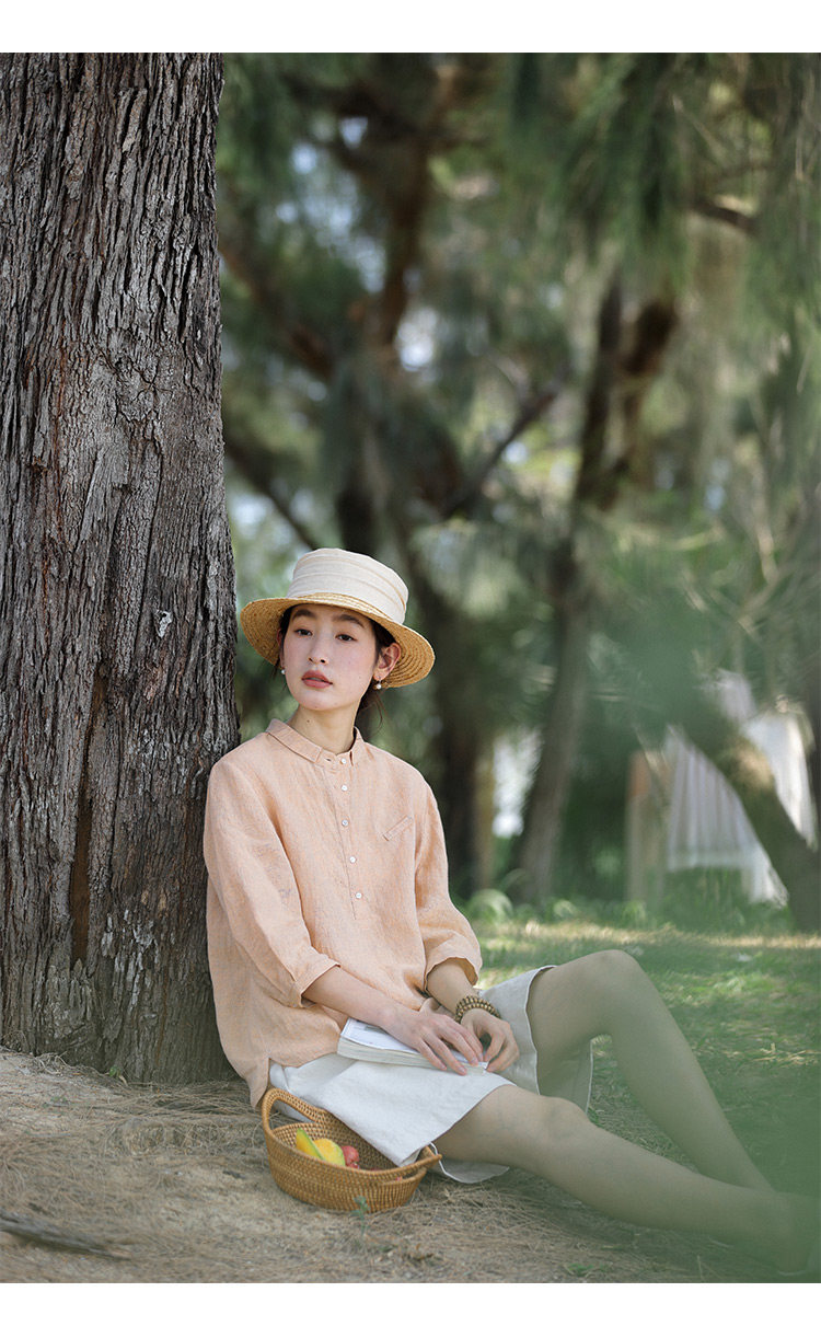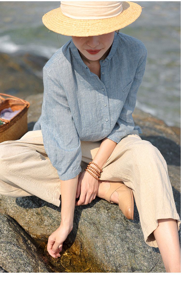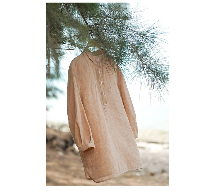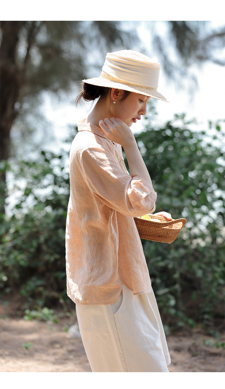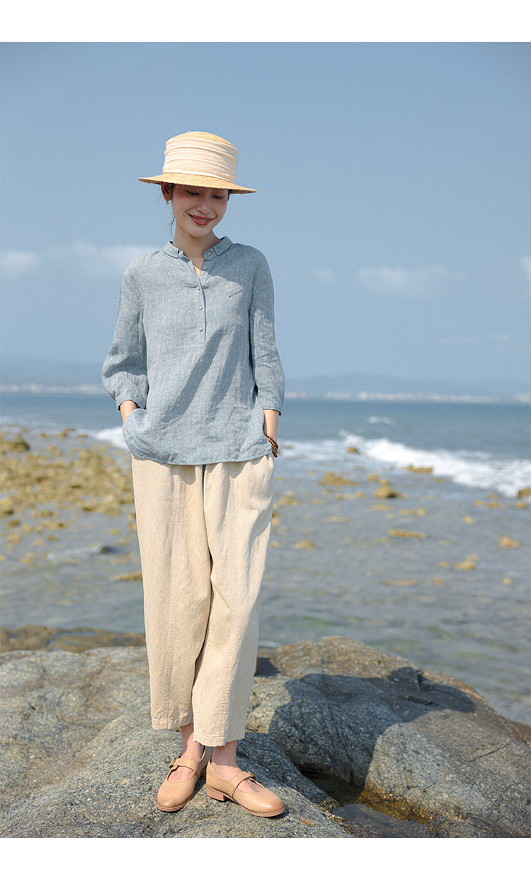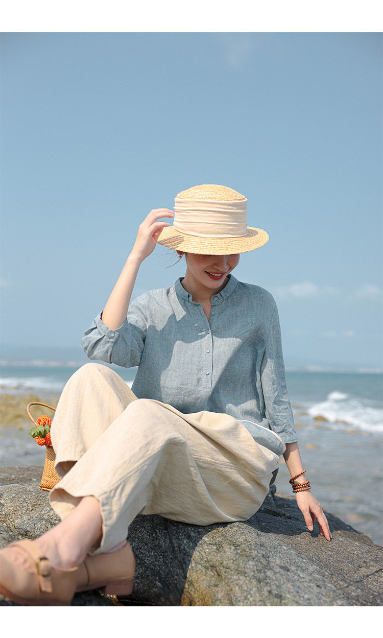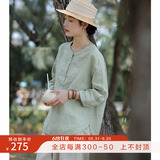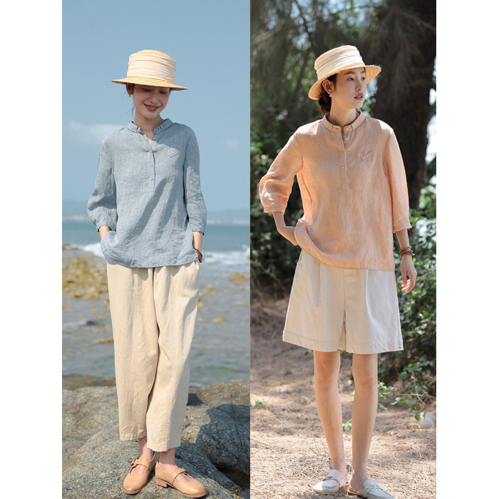 100%法國進口高級色織亞麻襯衫法式寬鬆復古套頭煜安可然原創