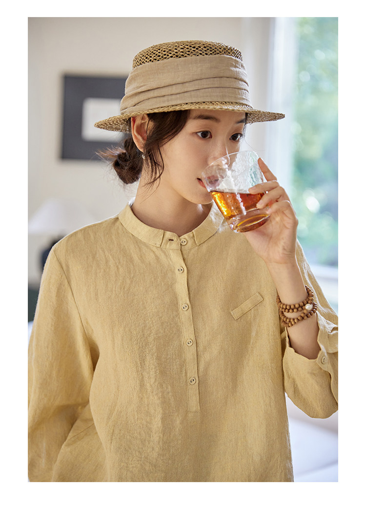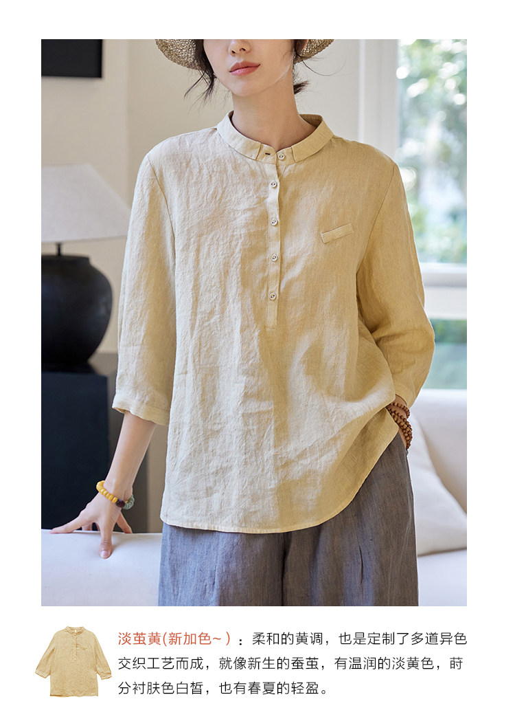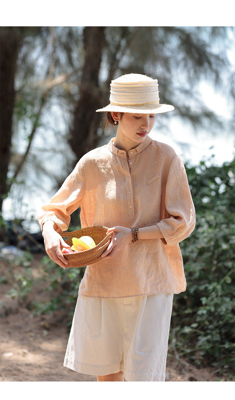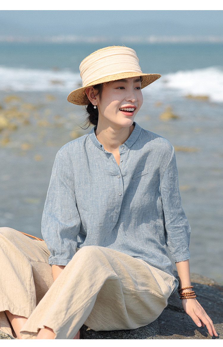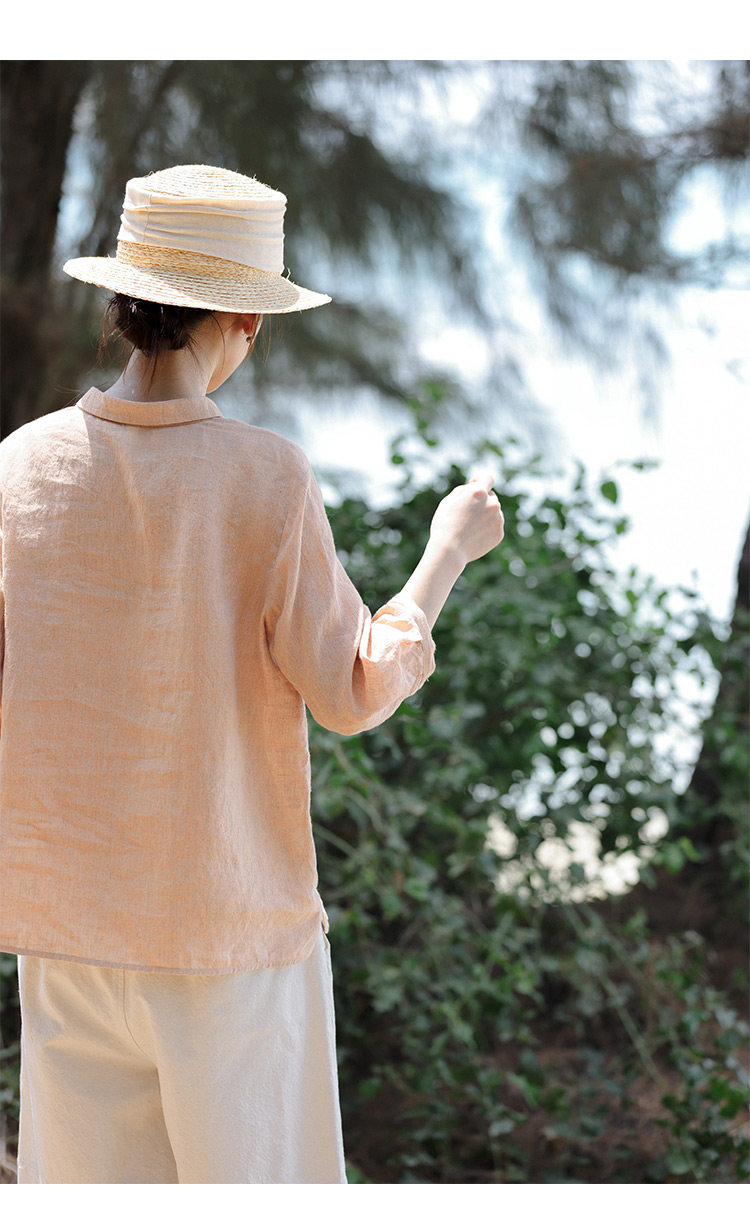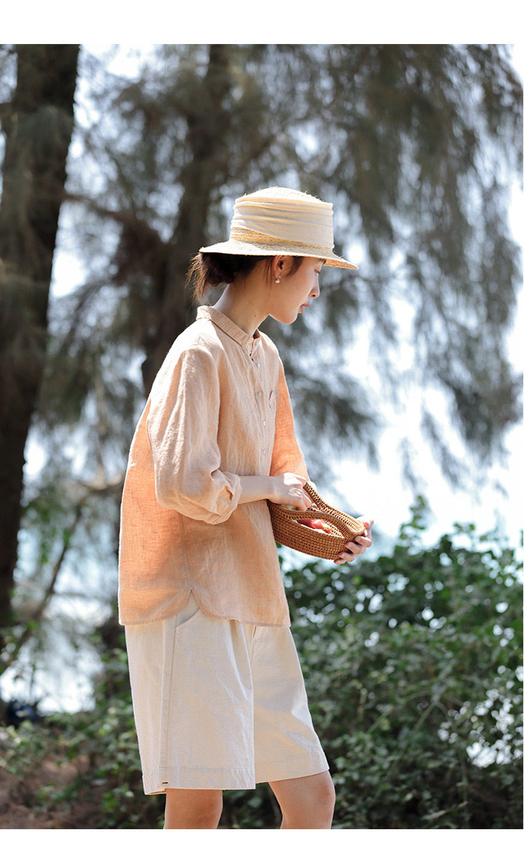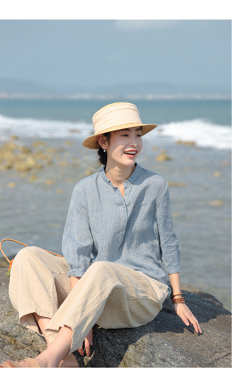 100%法國進口高級色織亞麻襯衫法式寬鬆復古套頭煜安可然原創