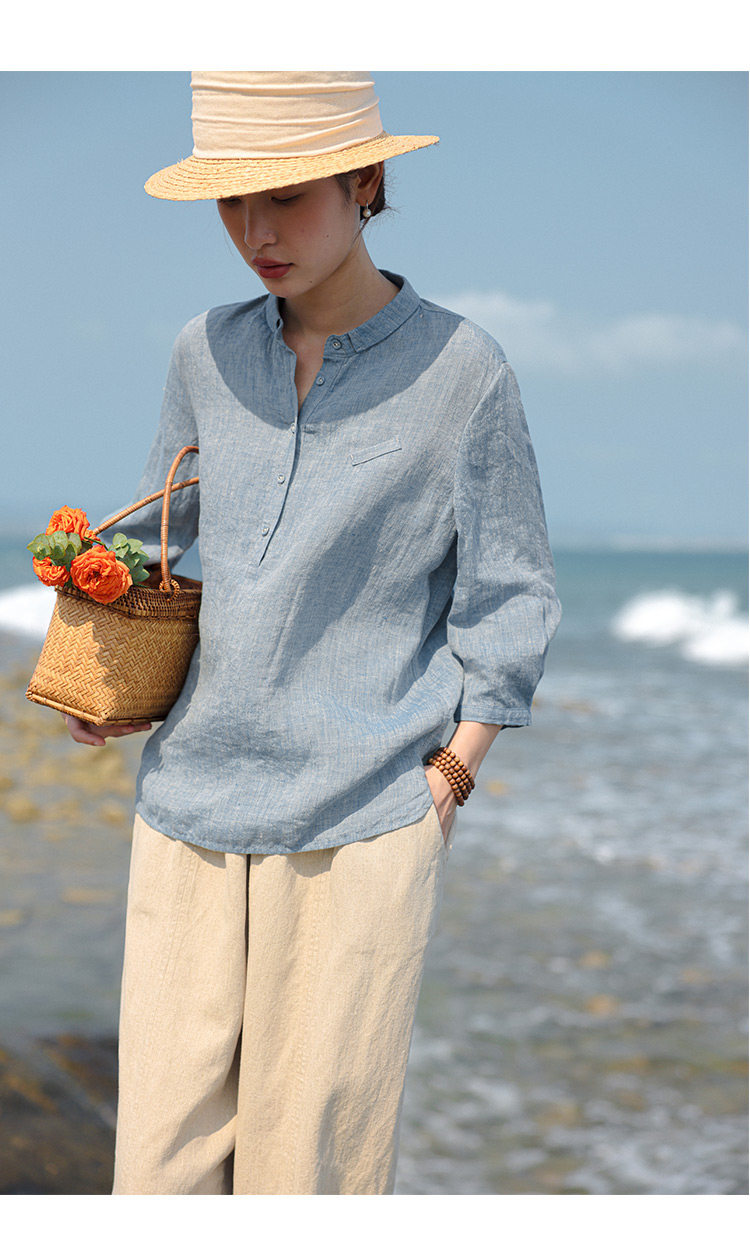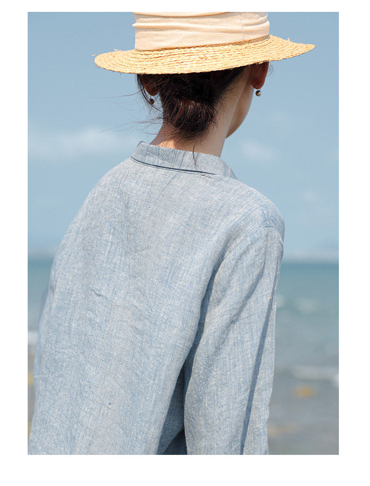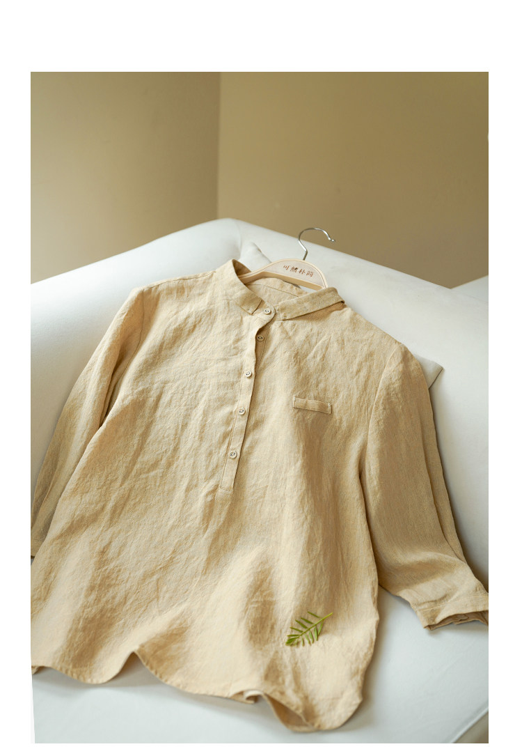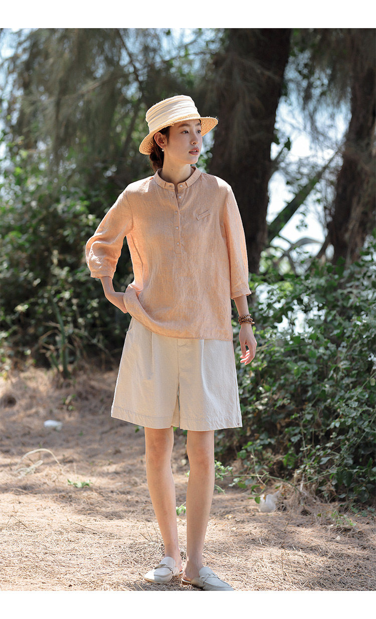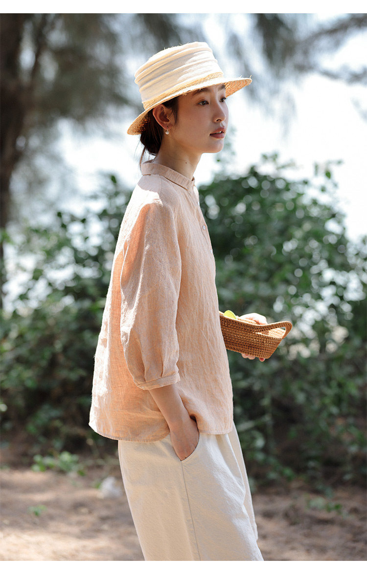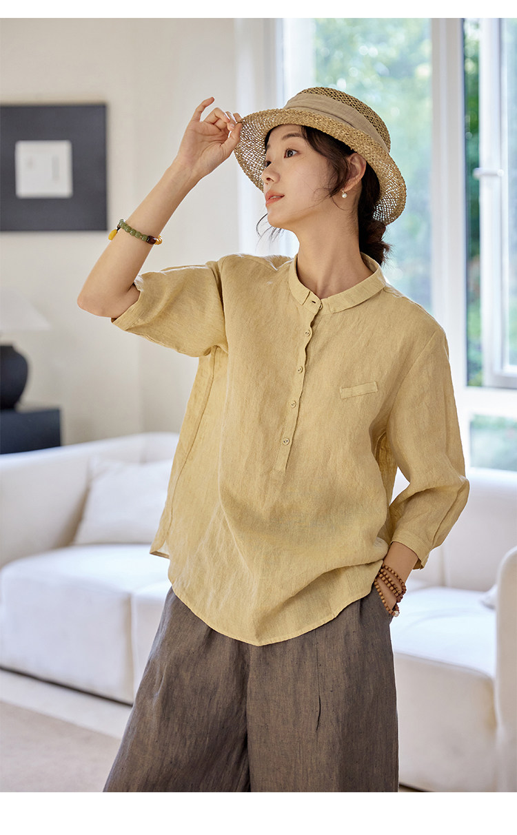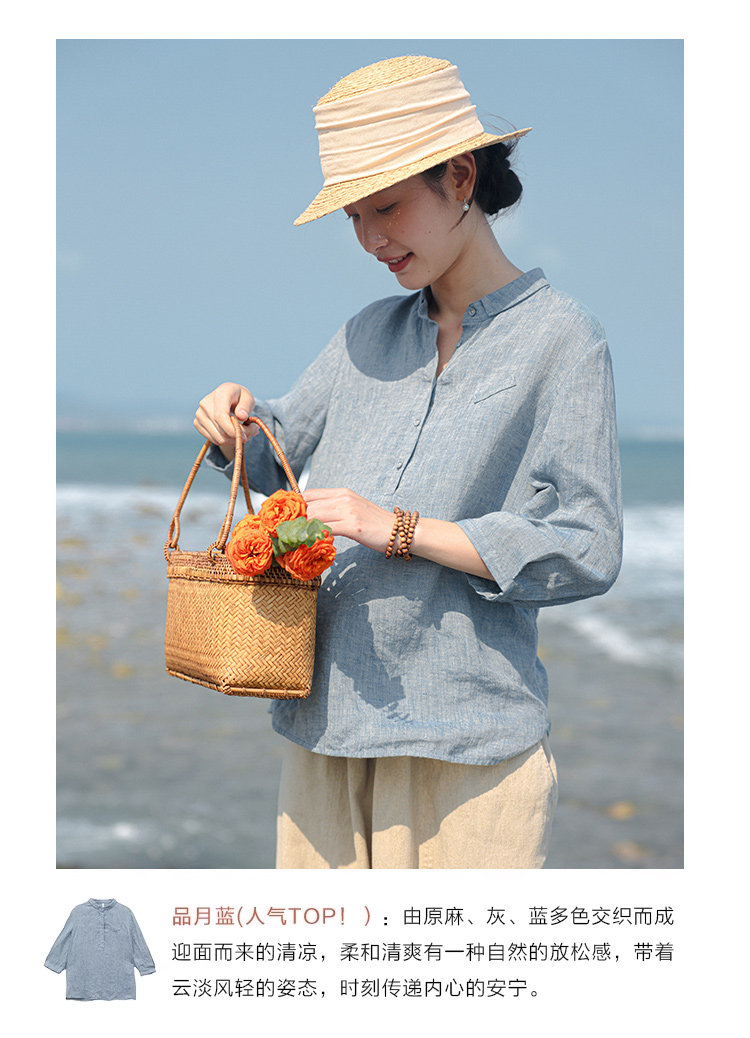100%法國進口高級色織亞麻襯衫法式寬鬆復古套頭煜安可然原創