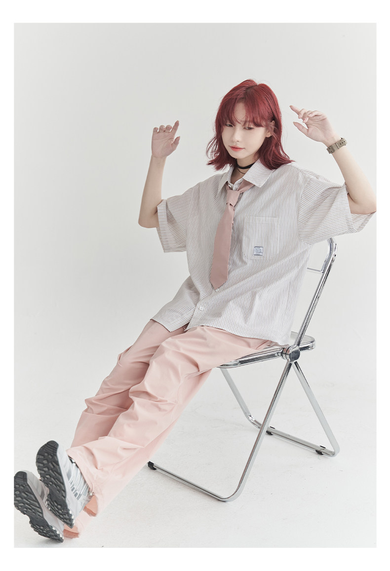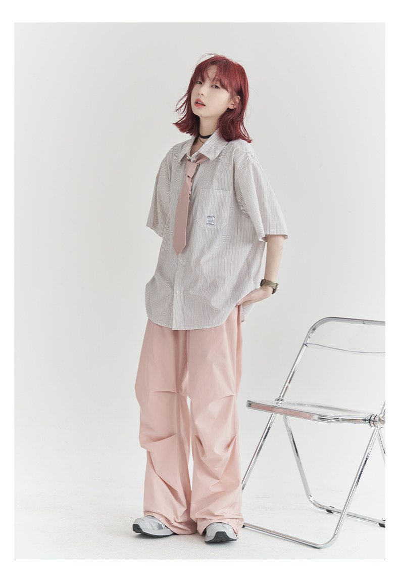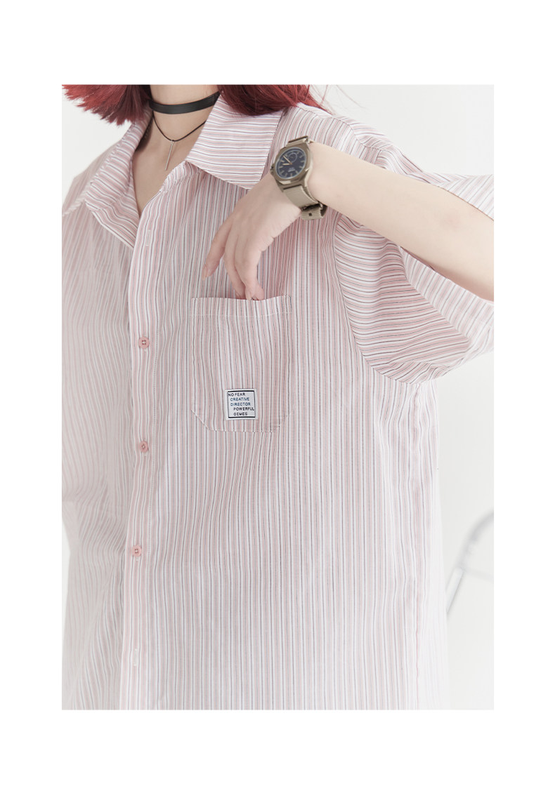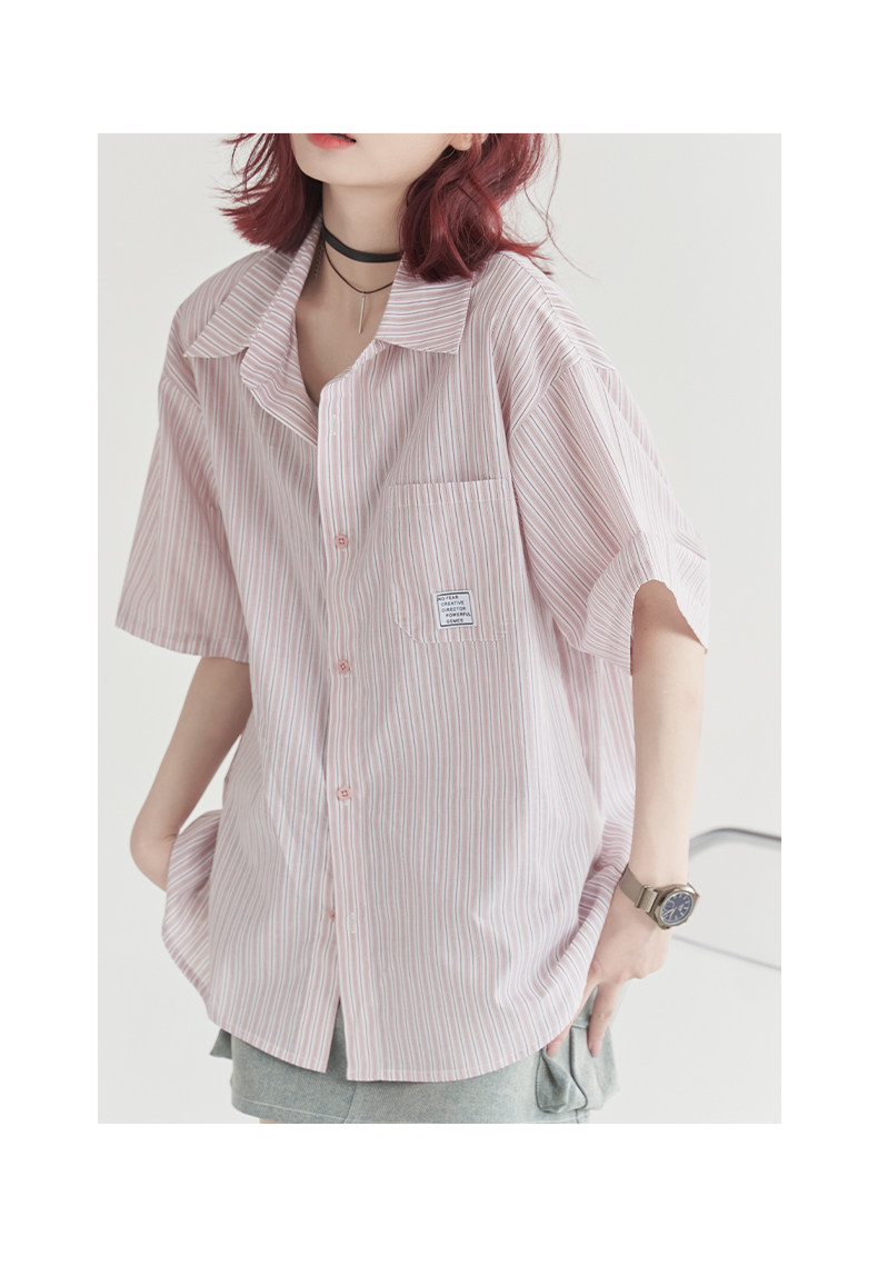 萬有引力博物館 復古細條紋短袖襯衫女夏季2025新款襯衣寬鬆上衣